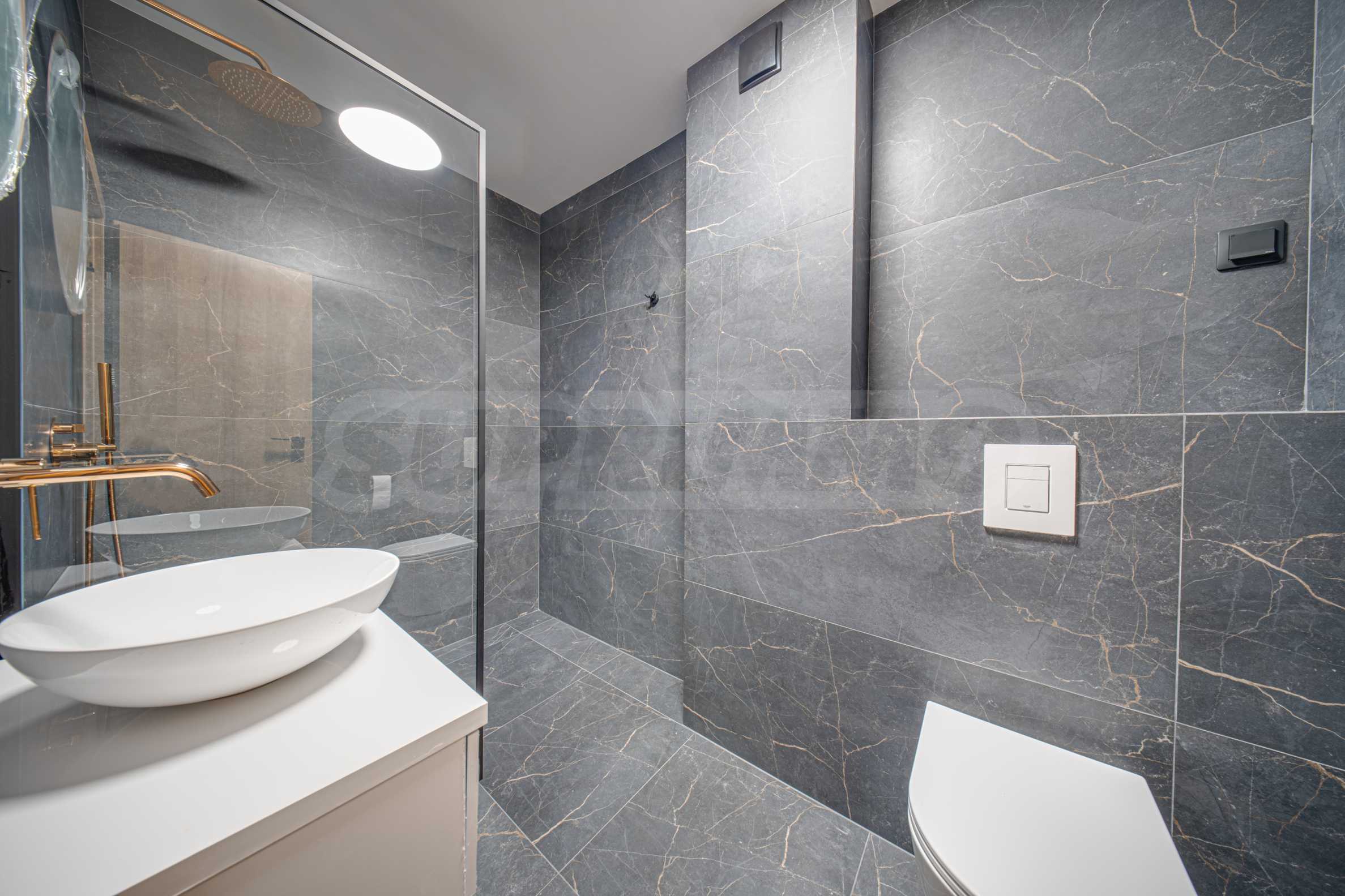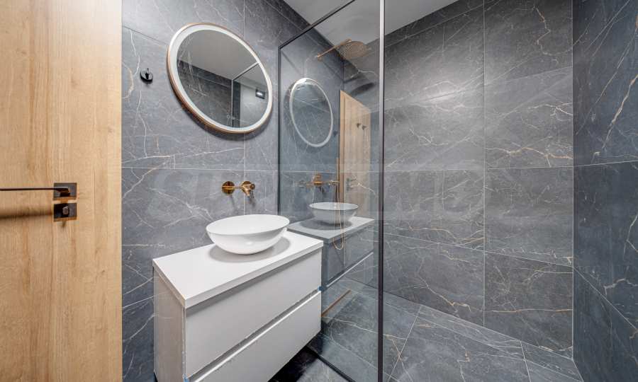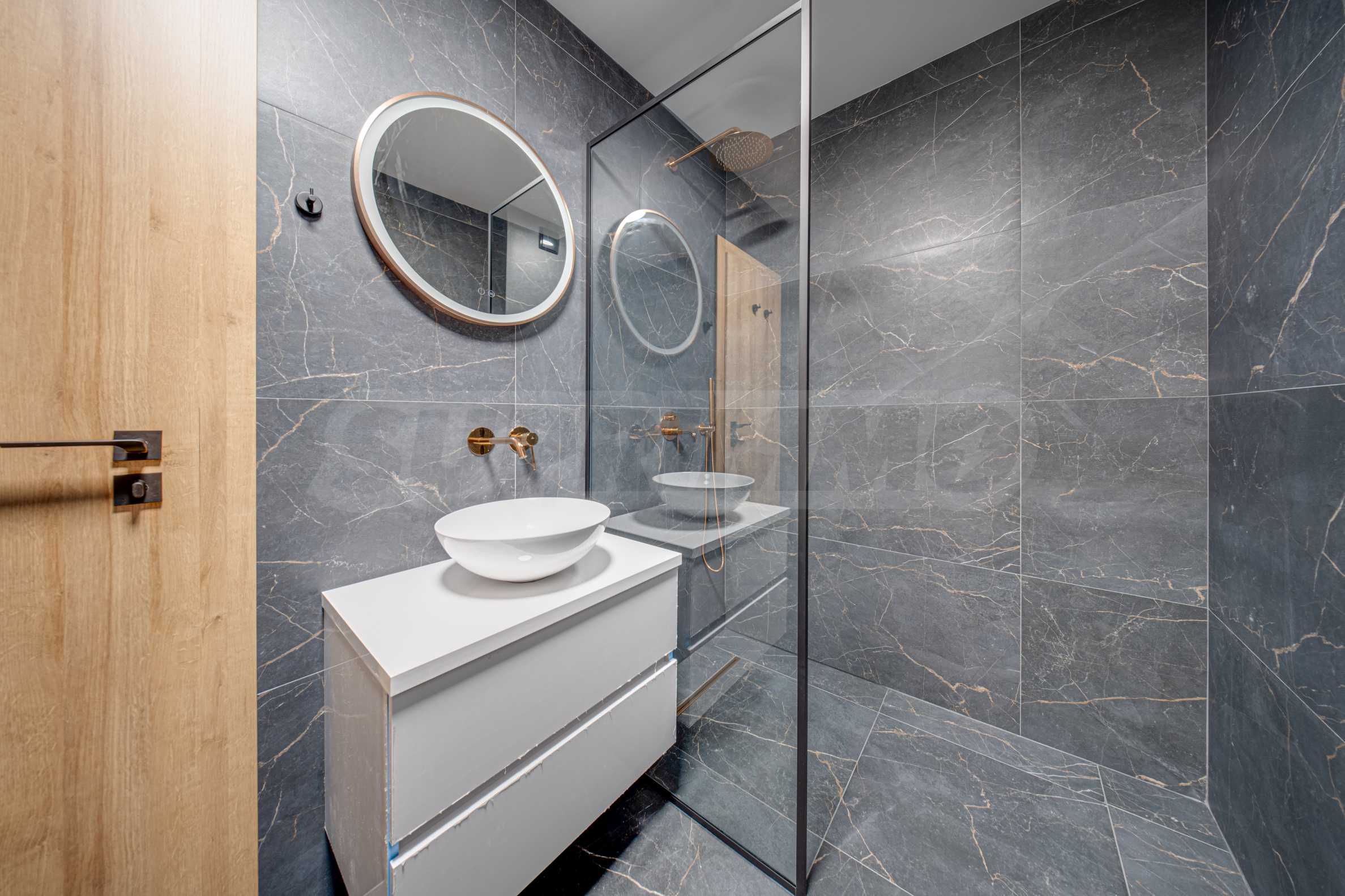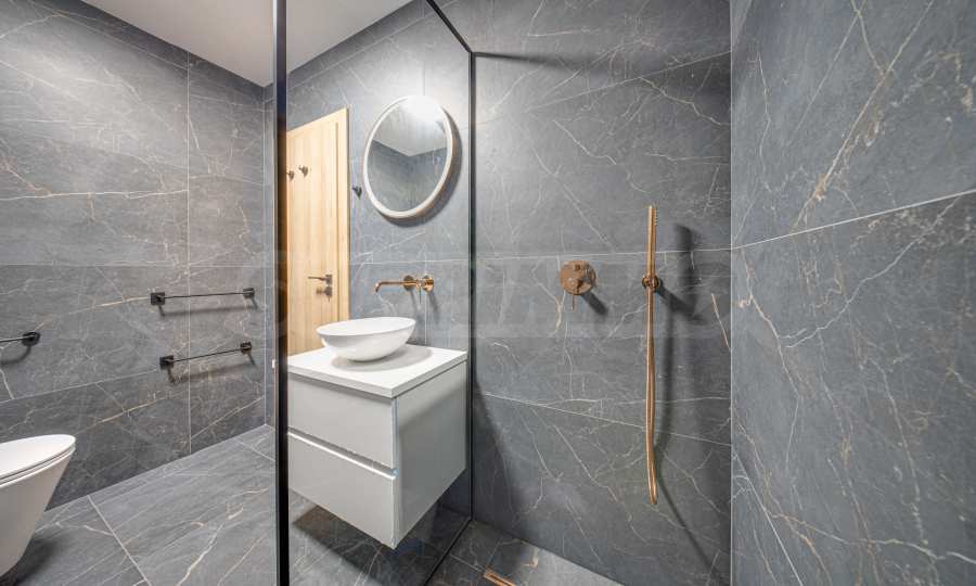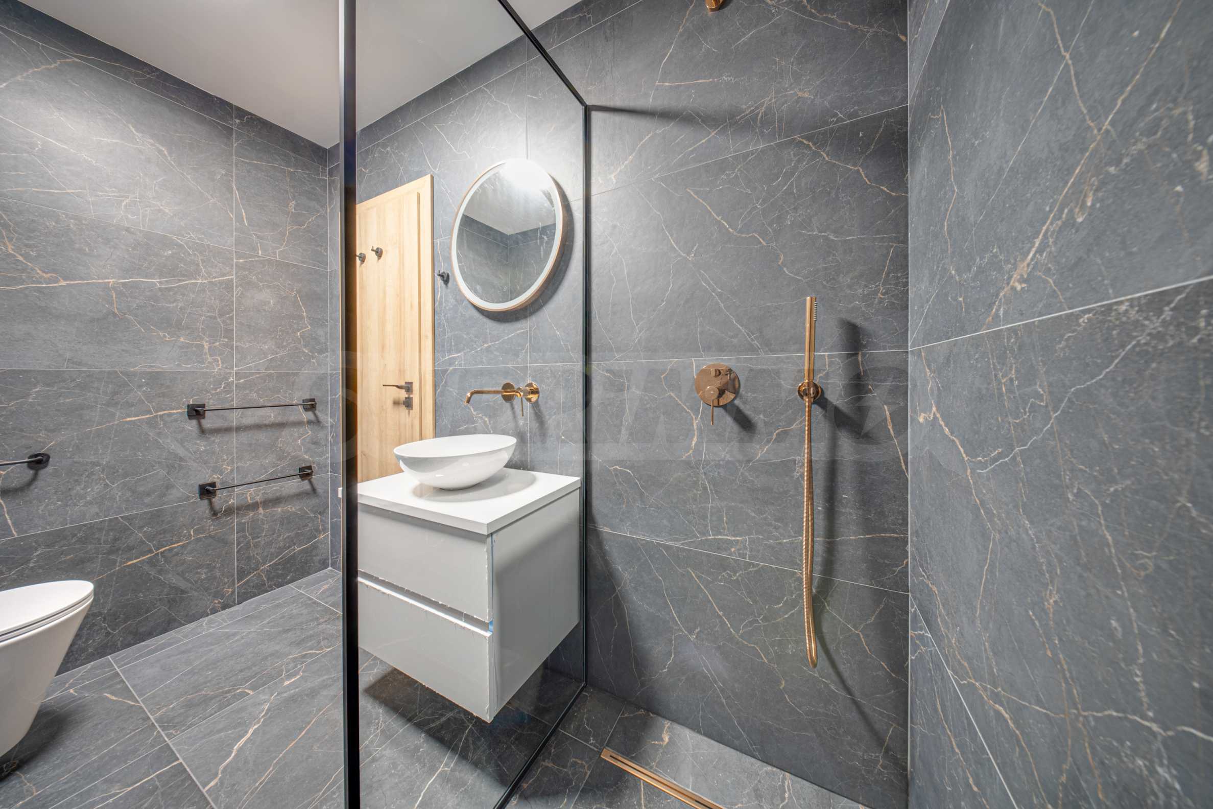• Современная ванная комната, отделанная черной гранитной плиткой и элементами цвета розового золота.