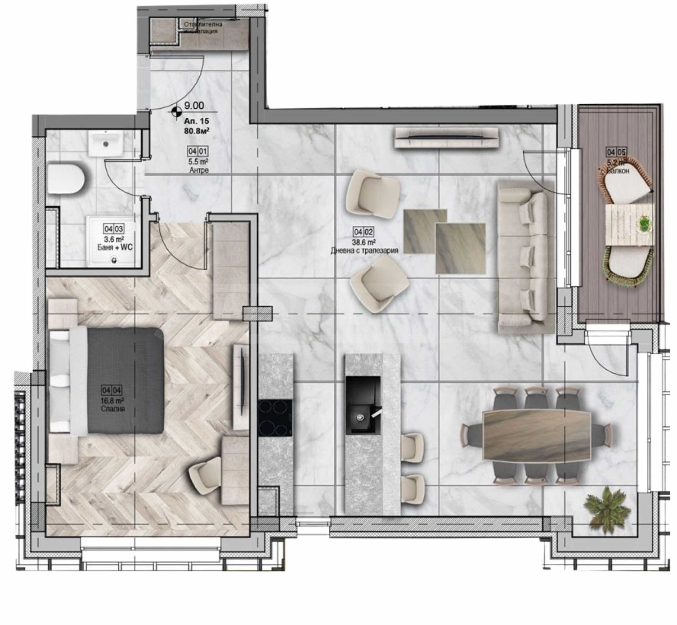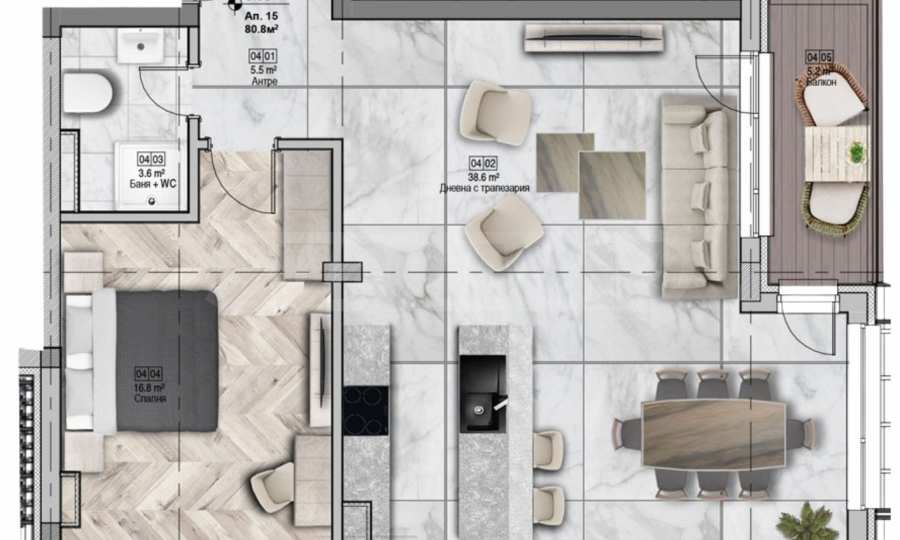 Площадь квартиры составляет 81,10 м2. Высота потолков — 2,80 м. Мебель выполнена из алюминия, установлены тройные стеклопакеты. Планировка хорошо организована и создает ощущение простора и комфорта.