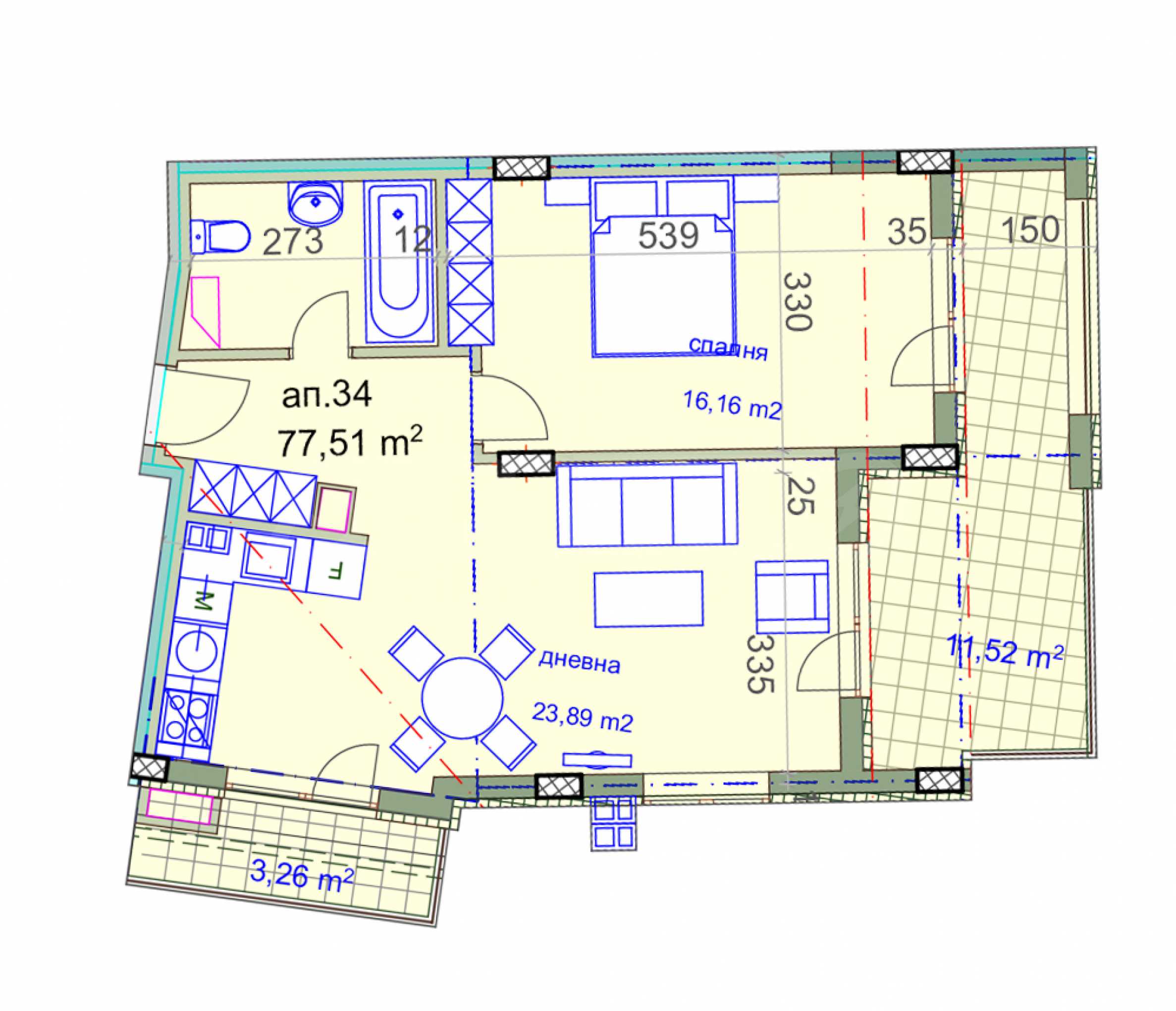 Общая площадь квартиры составляет 91,25 кв. м, из которых 77,10 кв. м приходится на чистую площадь и 14,14 кв. м – на общие зоны. Функциональная планировка и большие окна создают комфортную и современную жилую среду.