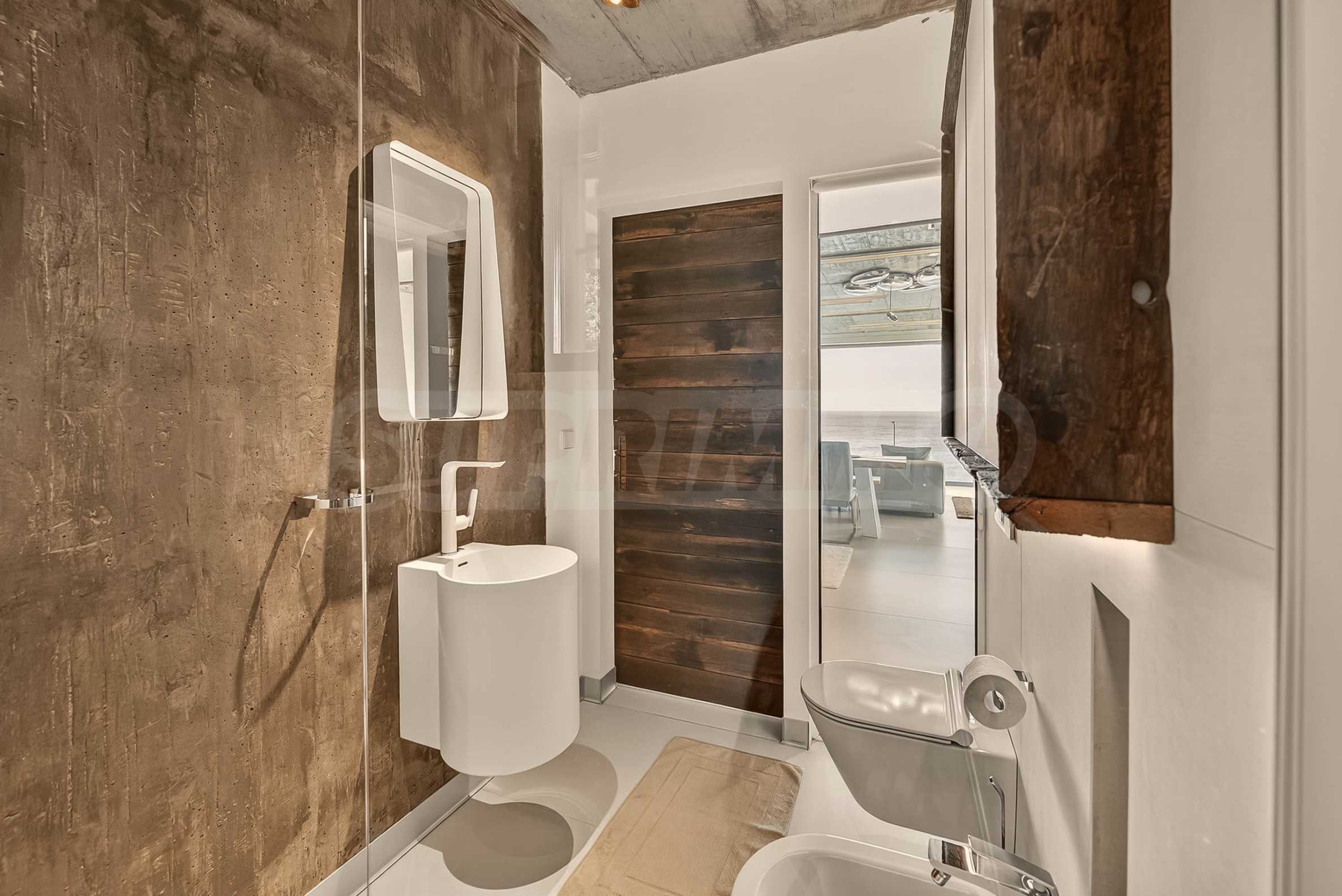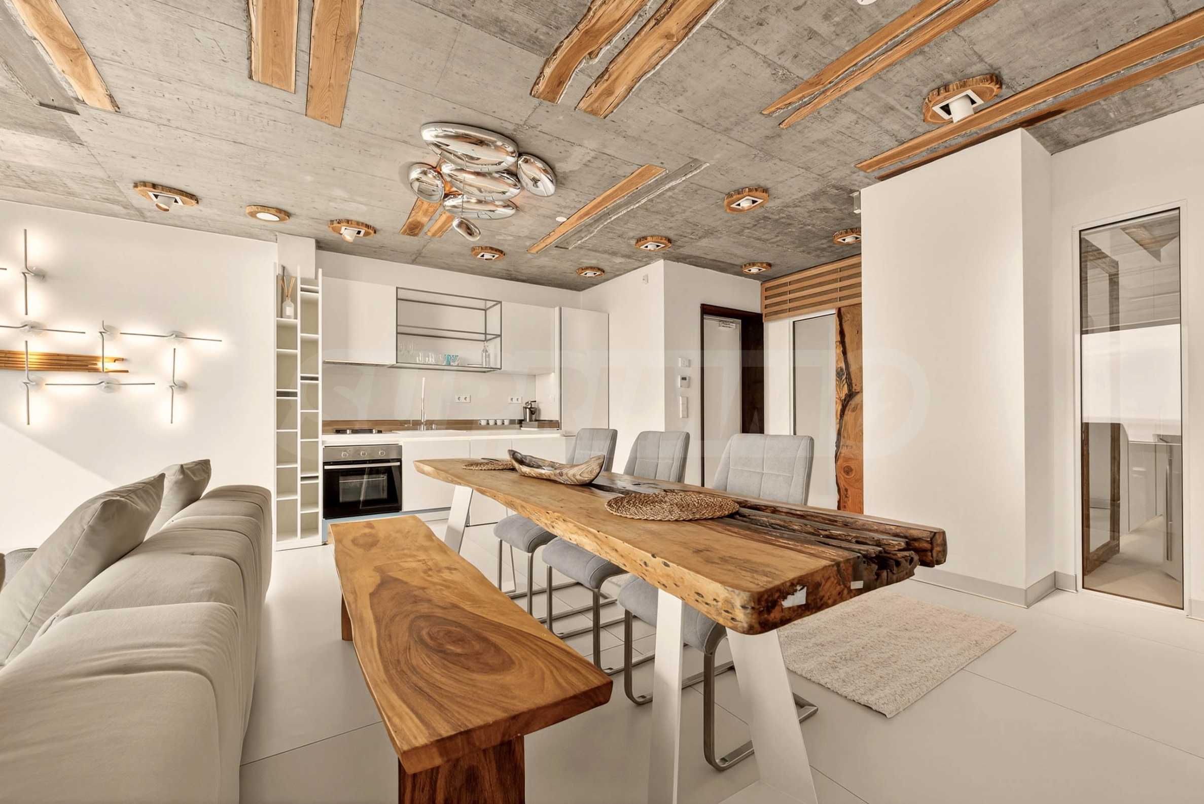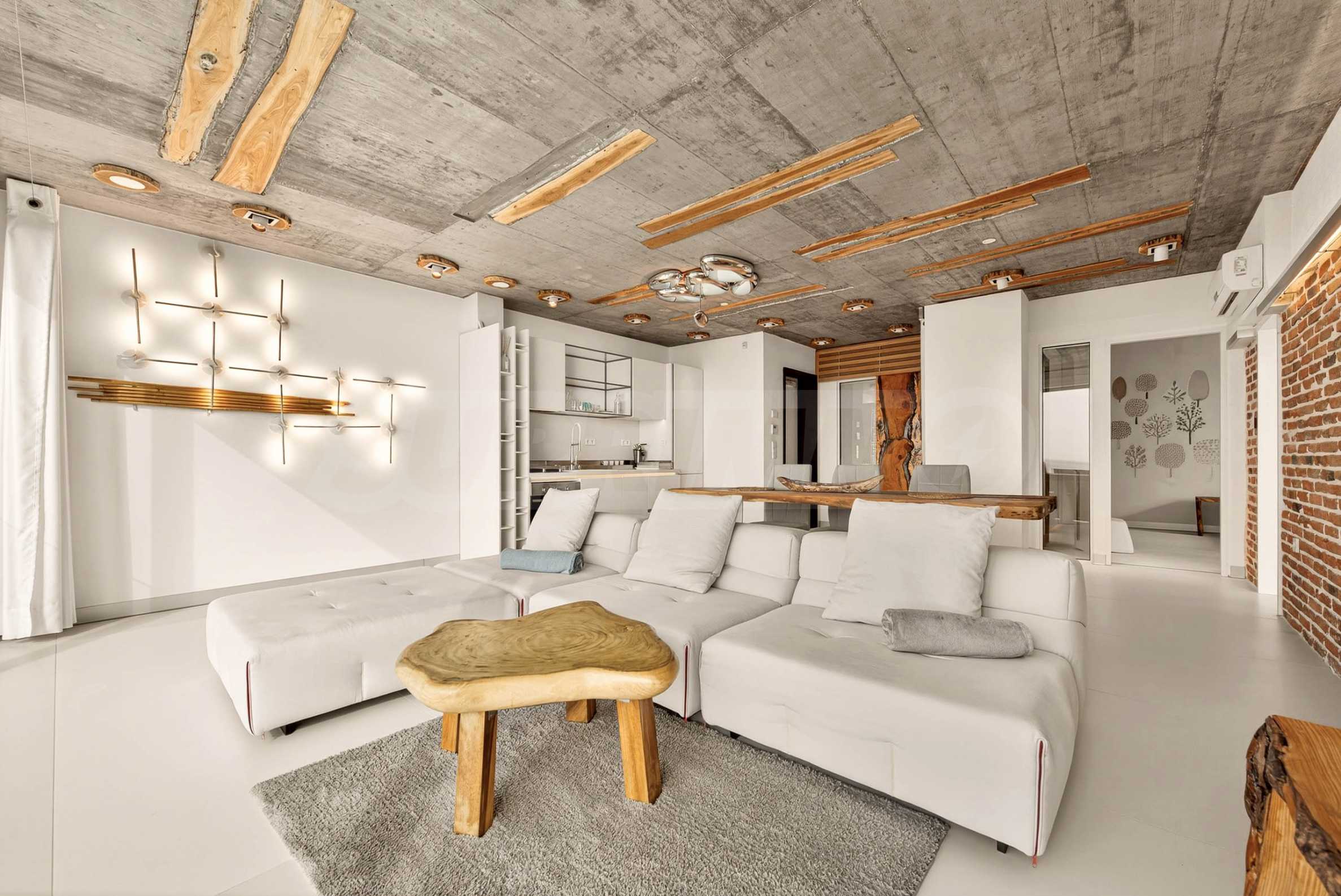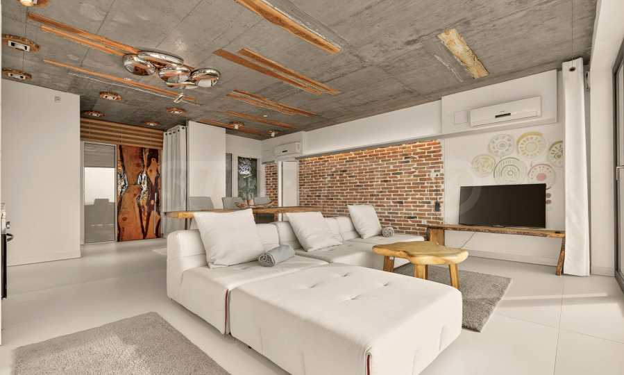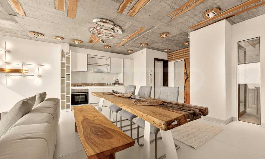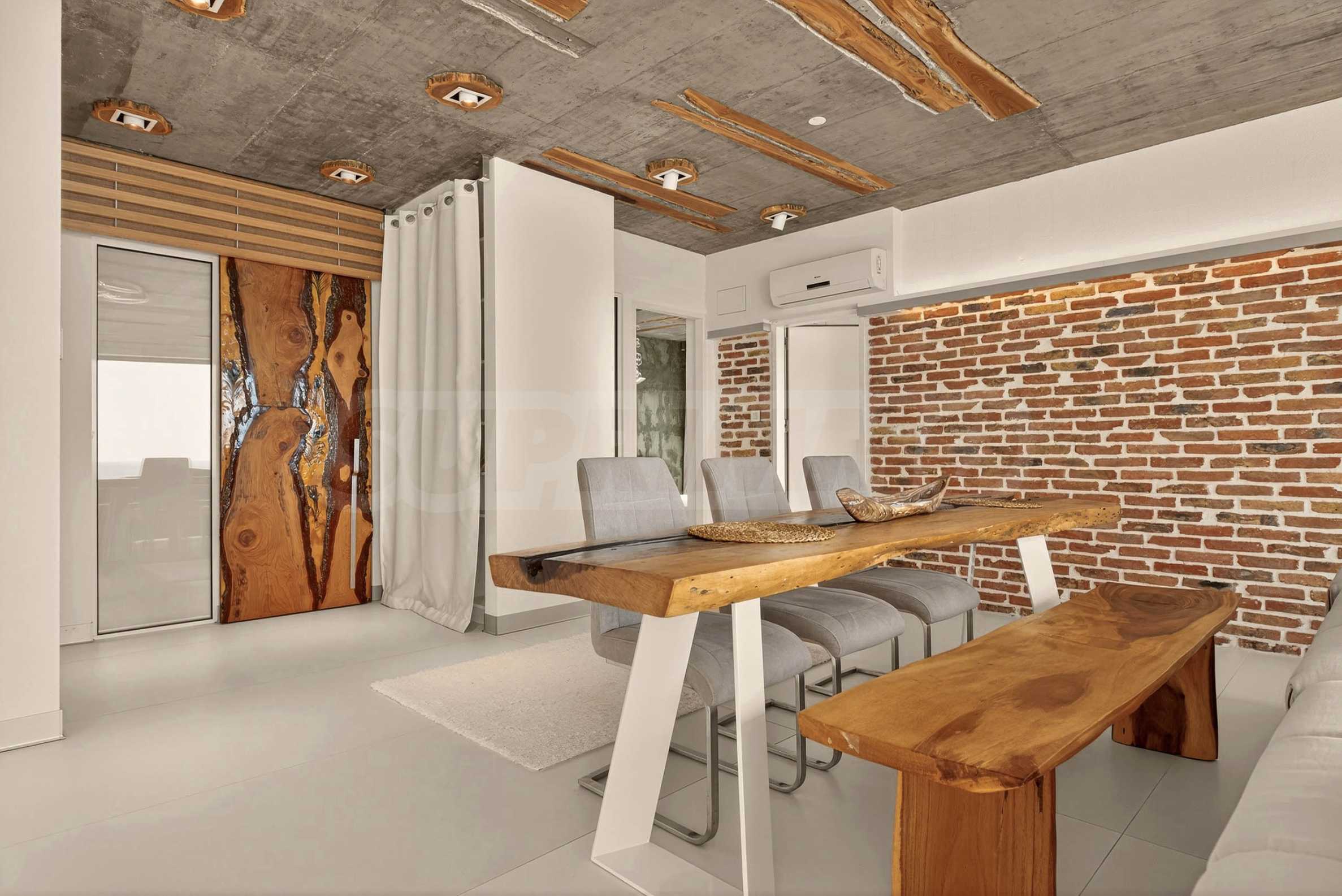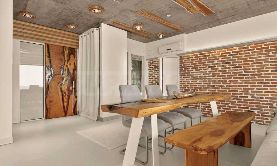 Дизайн уникален – естественный и современный, смелый и яркий, несущий в себе идею автономии, релаксации и морской атмосферы. В бетонные плиты потолка квартиры встроены декоративные элементы из натуральной акации. Кирпичные стены и бетон используются для натуральной отделки, дополнительно обработаны, пропитаны и загрунтованы. Мебель, кухня, матрасы и диваны, привлекательная плитка, светильники – все от известных итальянских брендов. В столовой внимание привлекает экстравагантный стол, изготовленный на заказ из ценной и редкой древесины Амазонии. Вся сантехника в ванных комнатах – первоклассного немецкого качества.