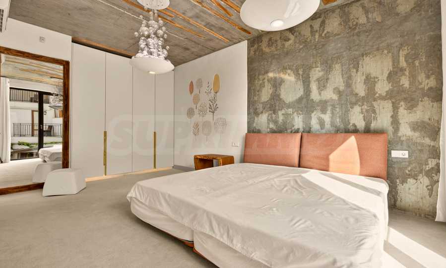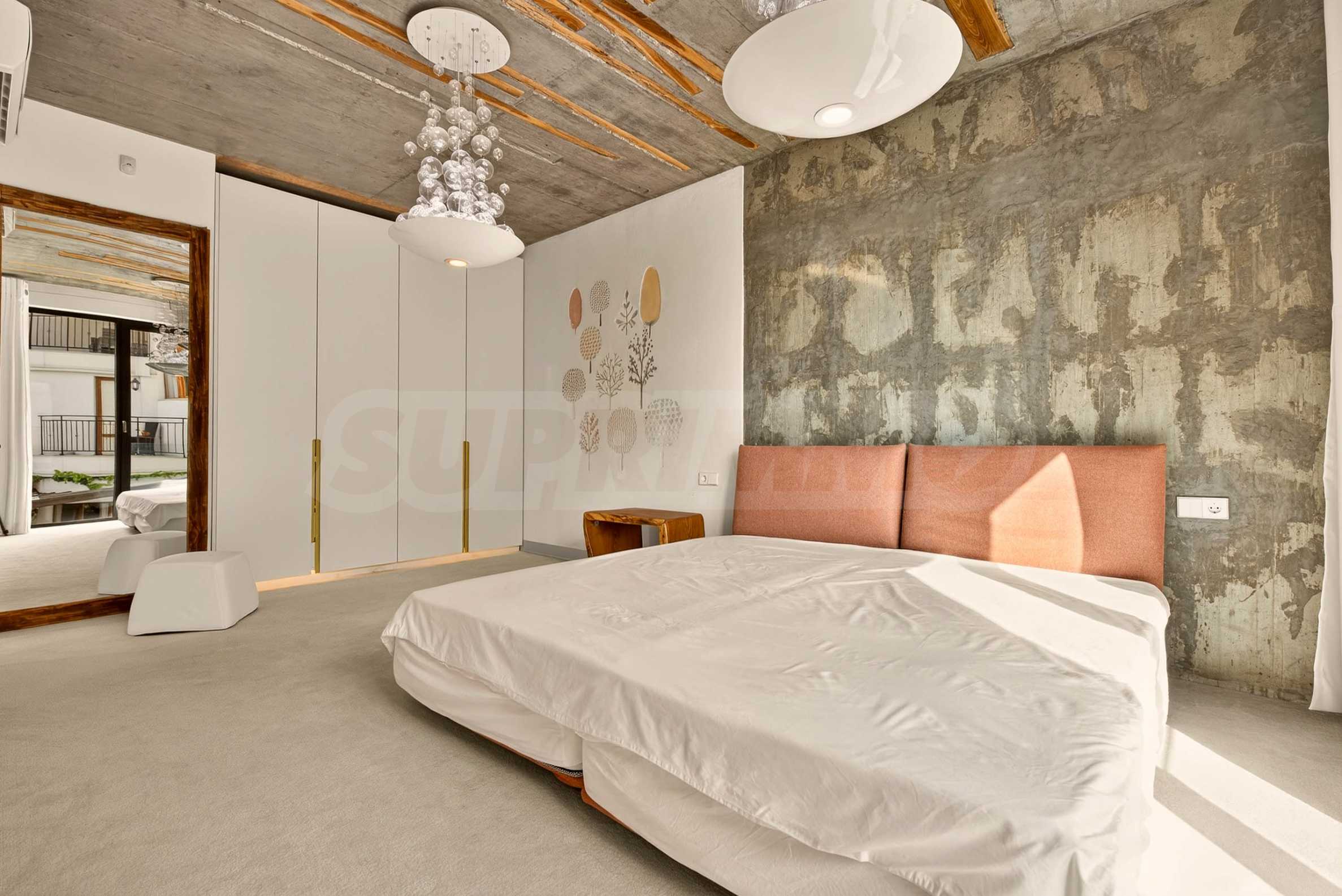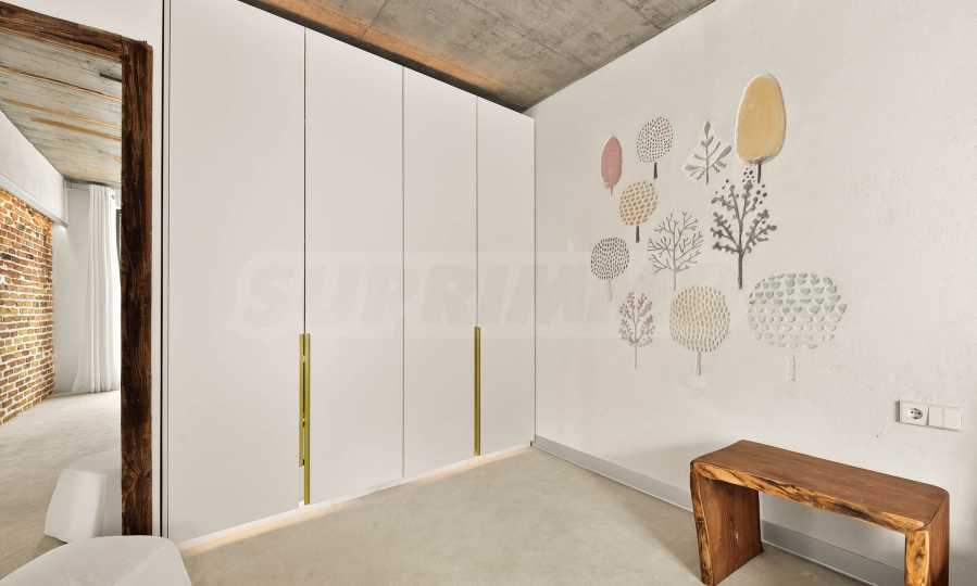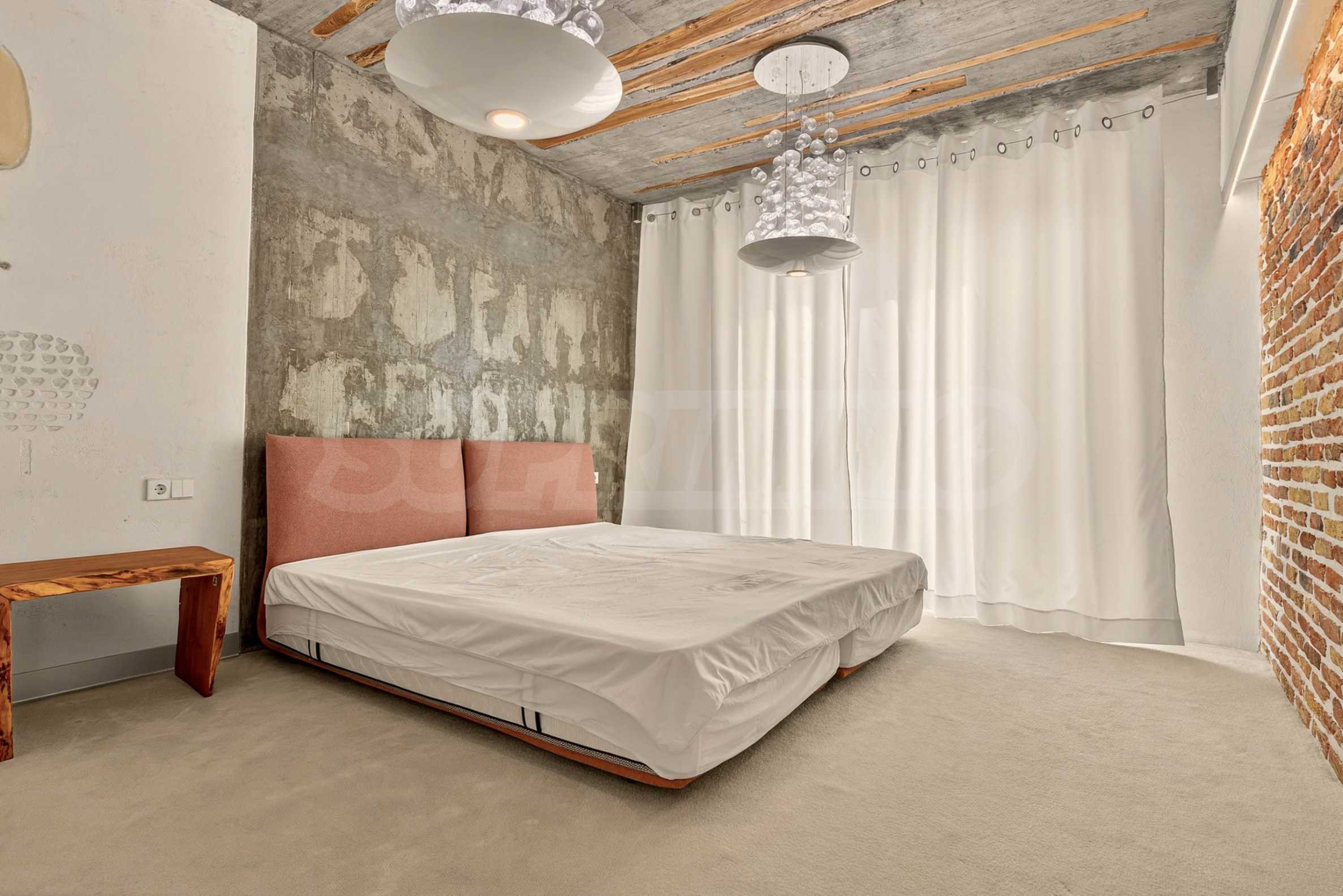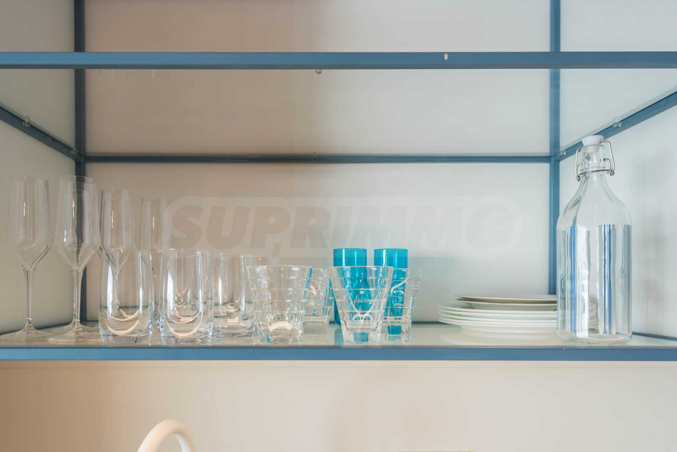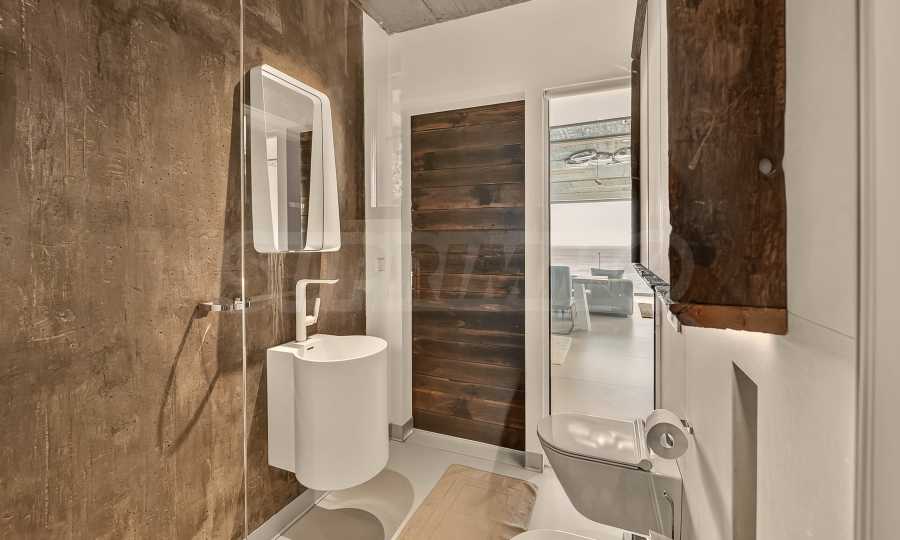 Дизайн уникален – естественный и современный, смелый и яркий, несущий в себе идею автономии, релаксации и морской атмосферы. В бетонные плиты потолка квартиры встроены декоративные элементы из натуральной акации. Кирпичные стены и бетон используются для натуральной отделки, дополнительно обработаны, пропитаны и загрунтованы. Мебель, кухня, матрасы и диваны, привлекательная плитка, светильники – все от известных итальянских брендов. В столовой внимание привлекает экстравагантный стол, изготовленный на заказ из ценной и редкой древесины Амазонии. Вся сантехника в ванных комнатах – первоклассного немецкого качества.