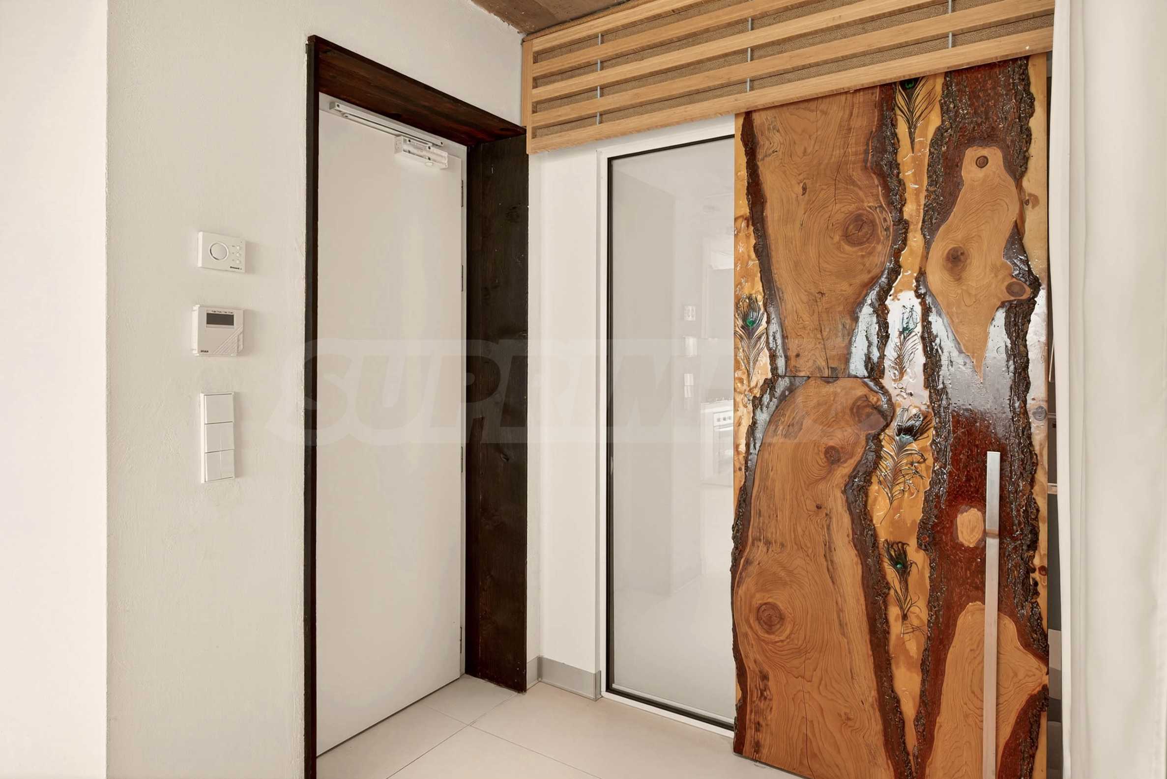 Входная дверь оборудована системой «умный замок»: она открывается и закрывается с помощью чип-карты, которая при входе отключает систему безопасности и активирует все коммуникации в квартире. При выходе система безопасности автоматически включается, и все коммуникации отключаются, чтобы предотвратить несчастные случаи во время отсутствия жильцов.