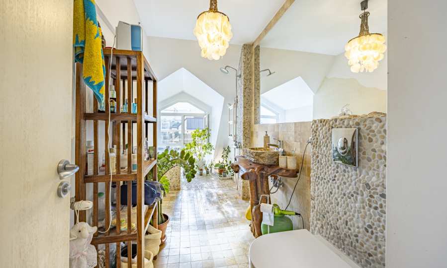Ванная комната элегантно отделана, оборудована душевой кабиной и ванной, из которой открывается вид на горы.