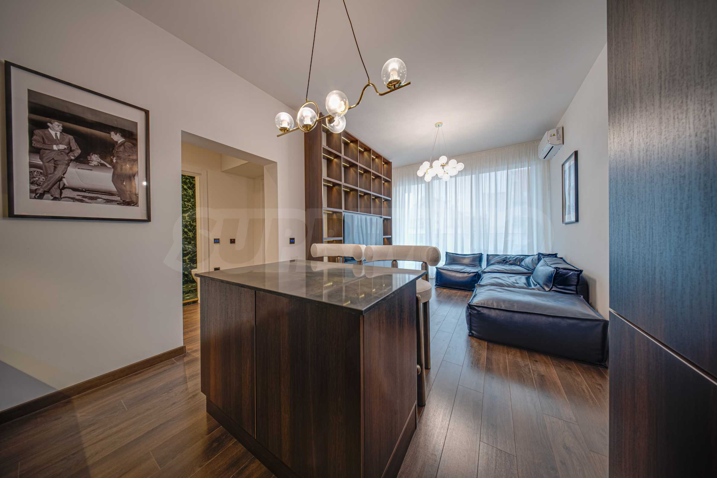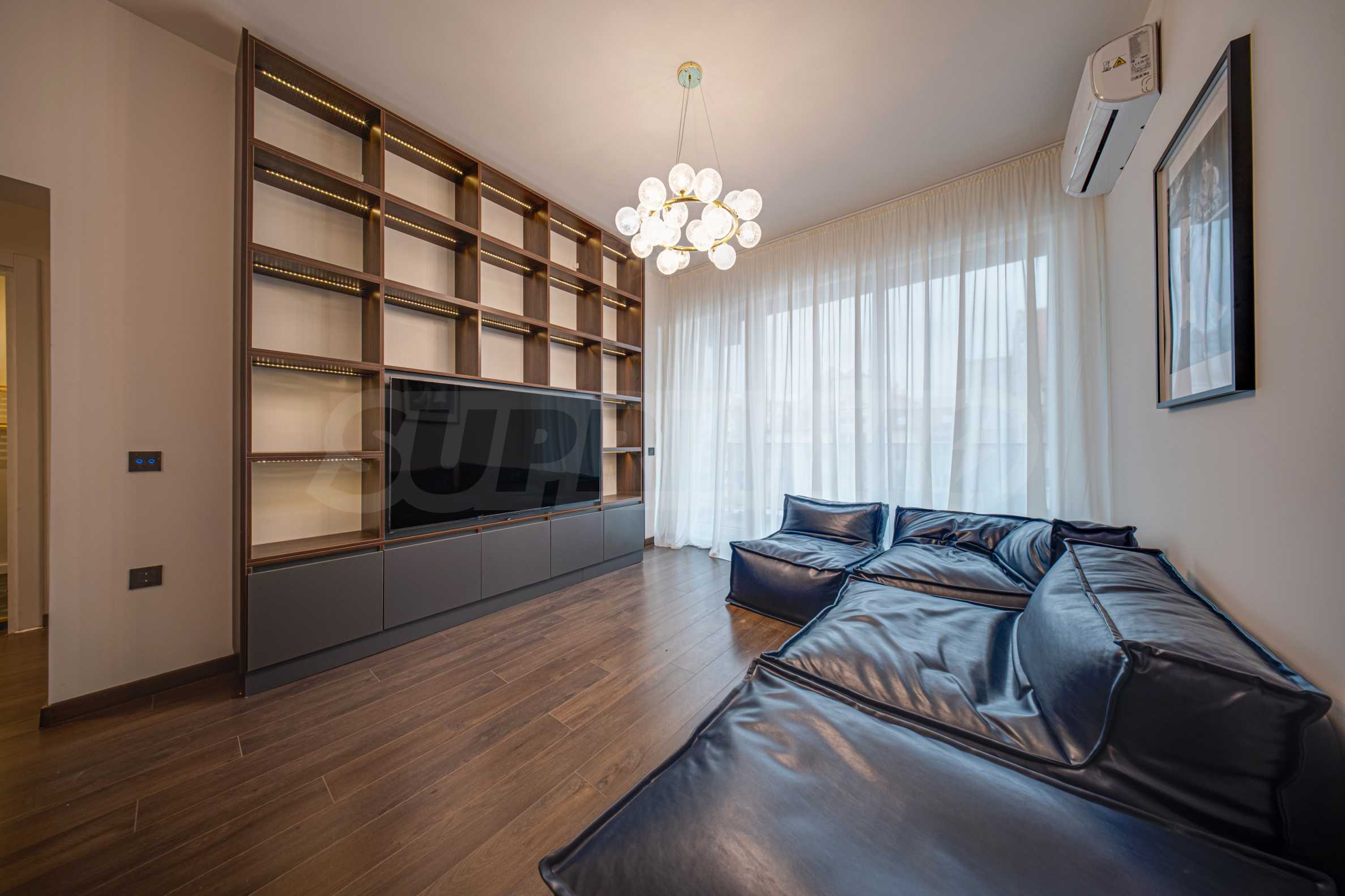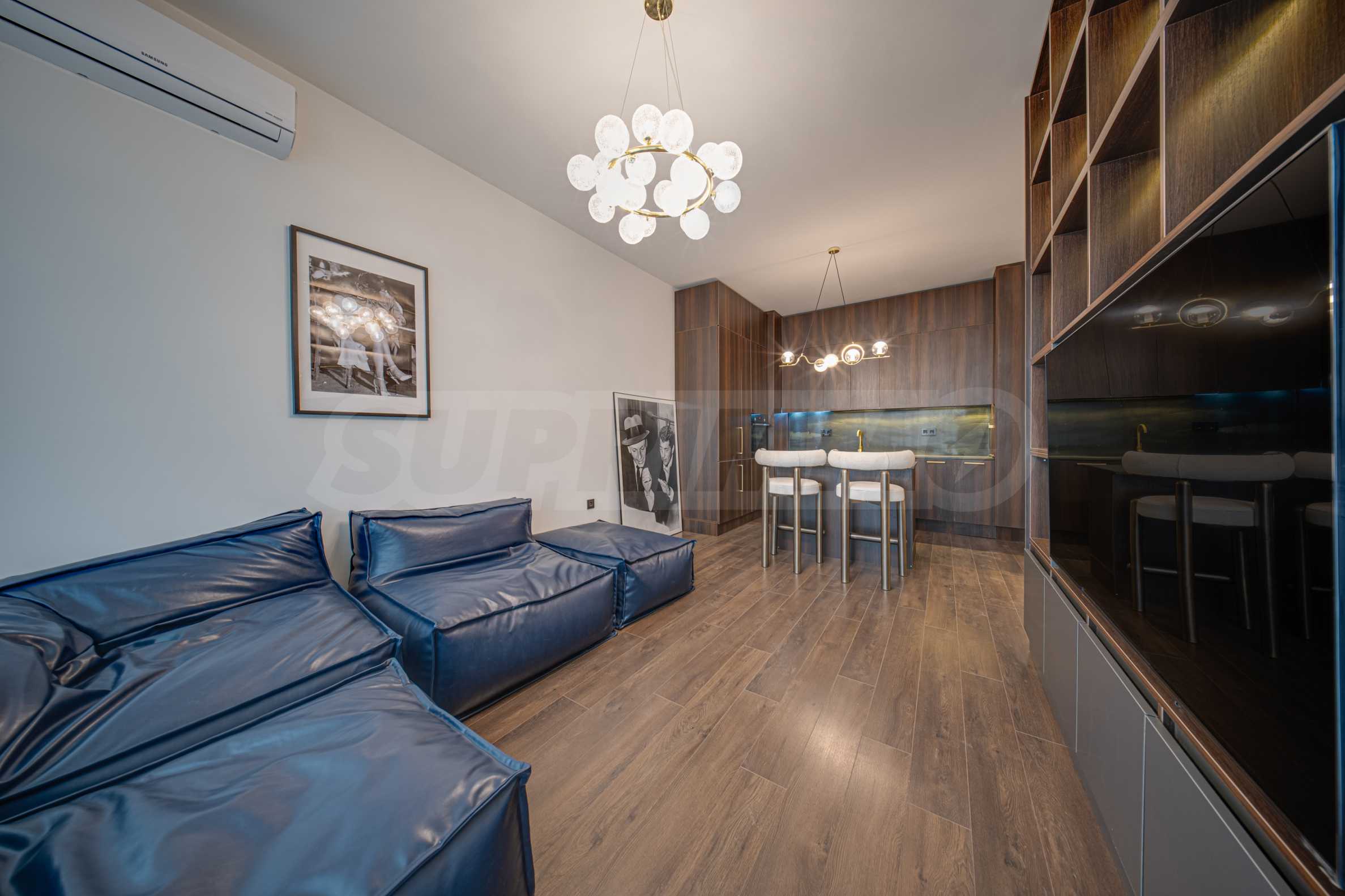 Мебель из мягкой кожи; барная стойка с двумя барными стульями; тумба под телевизор; LED-телевизор Samsung; встроенная кухонная меблировку; холодильник Gorenje; духовка с варочной панелью Bosch; посудомоечная машина Beko; ковры; стиральная машина с сушилкой AEG; светильники; кровать с матрасом; встроенный шкаф с прозрачными дверцами; кондиционеры Samsung; кровать с матрасом; светильники; постеры и т.д.