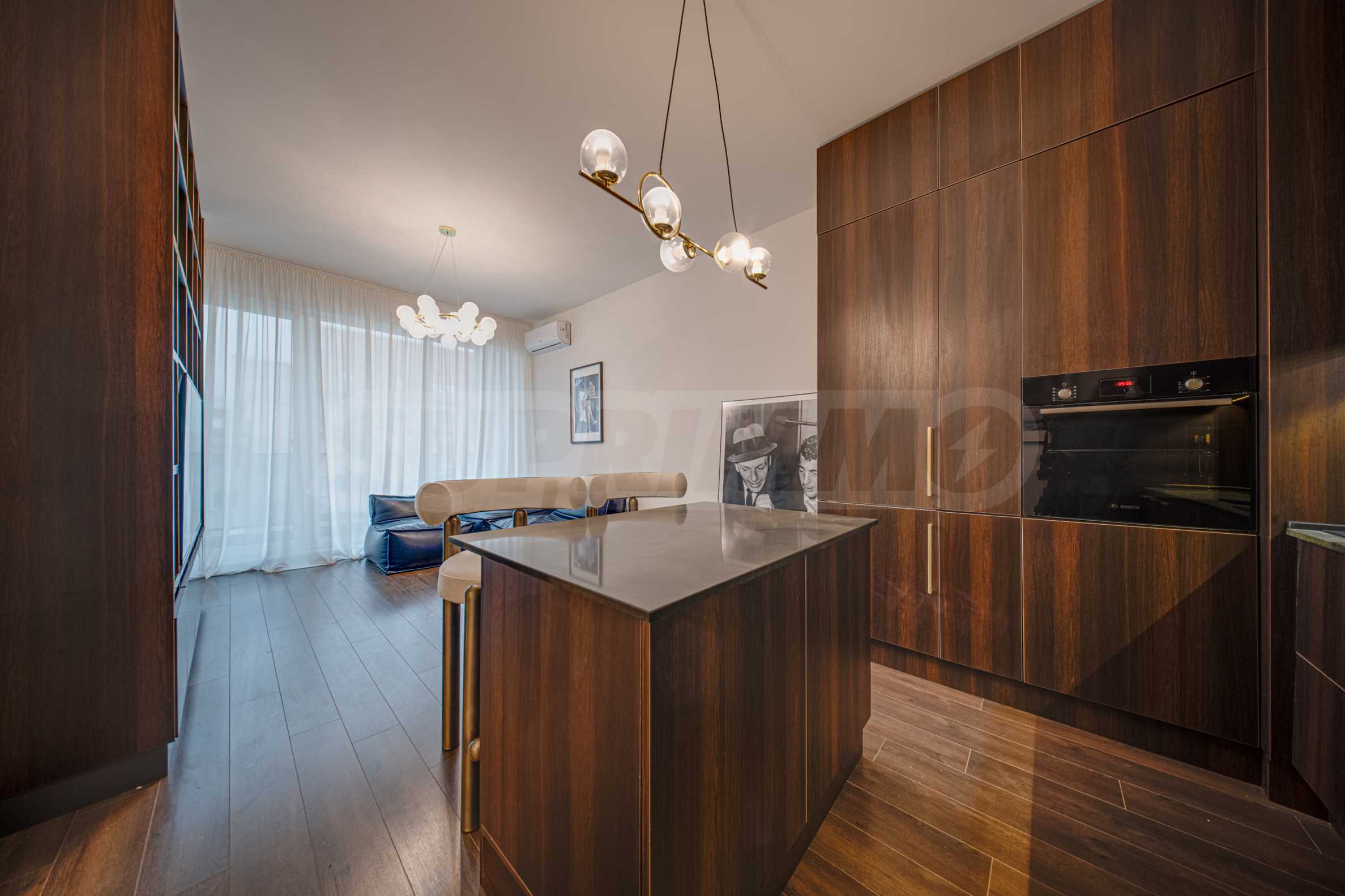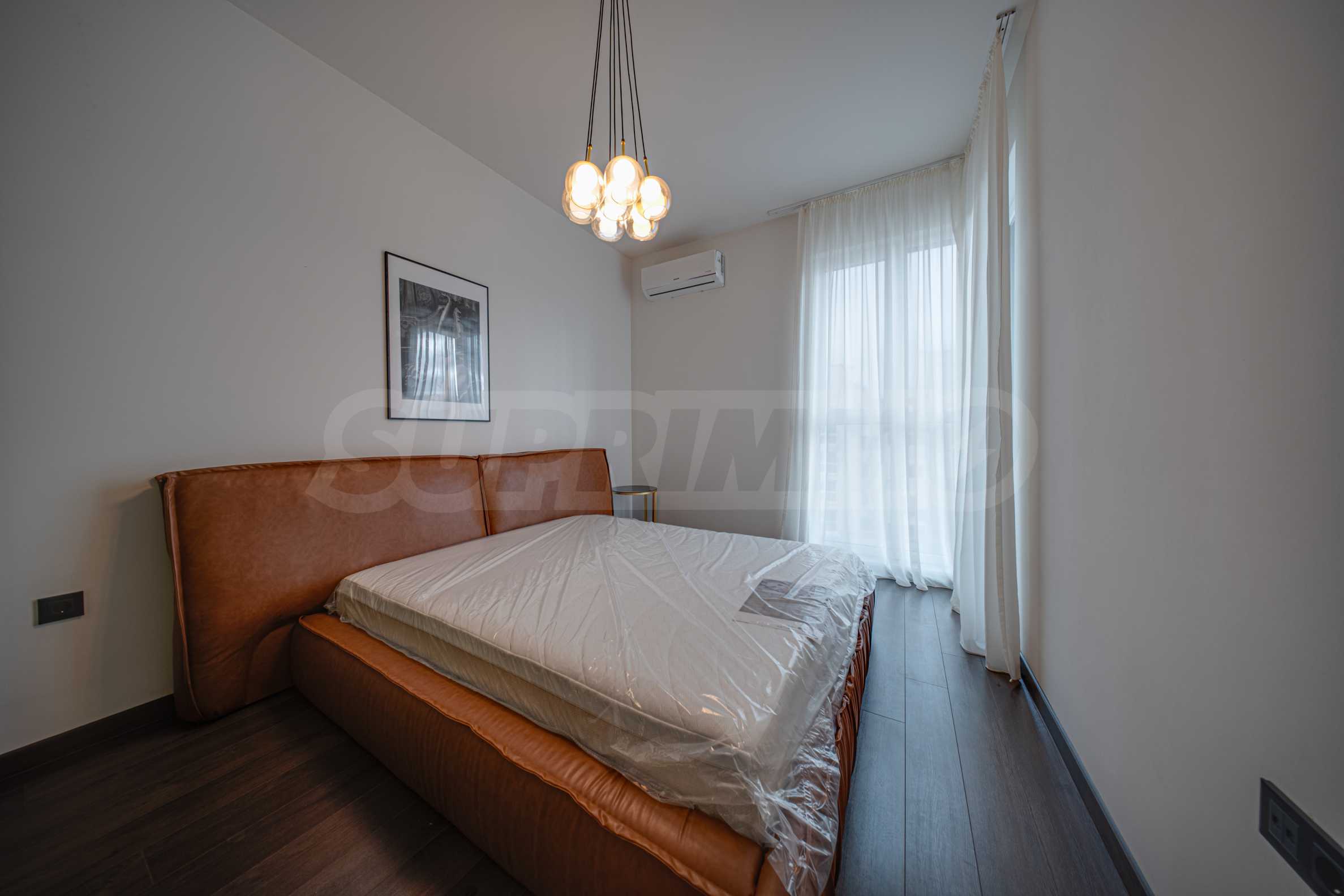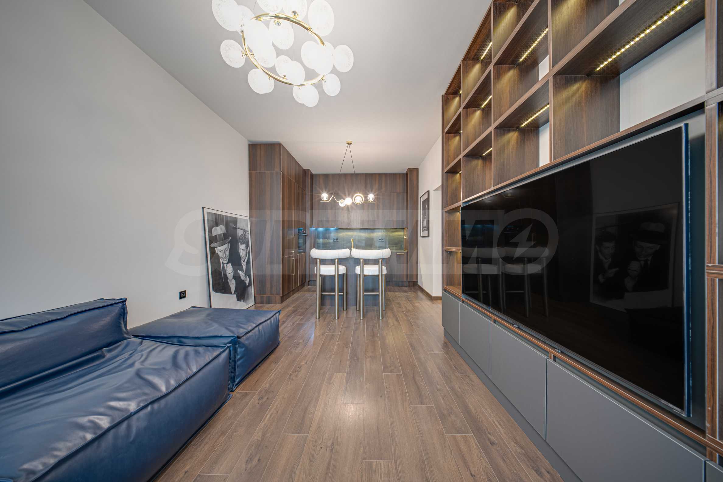 Мебель из мягкой кожи; барная стойка с двумя барными стульями; тумба под телевизор; LED-телевизор Samsung; встроенная кухонная меблировку; холодильник Gorenje; духовка с варочной панелью Bosch; посудомоечная машина Beko; ковры; стиральная машина с сушилкой AEG; светильники; кровать с матрасом; встроенный шкаф с прозрачными дверцами; кондиционеры Samsung; кровать с матрасом; светильники; постеры и т.д.