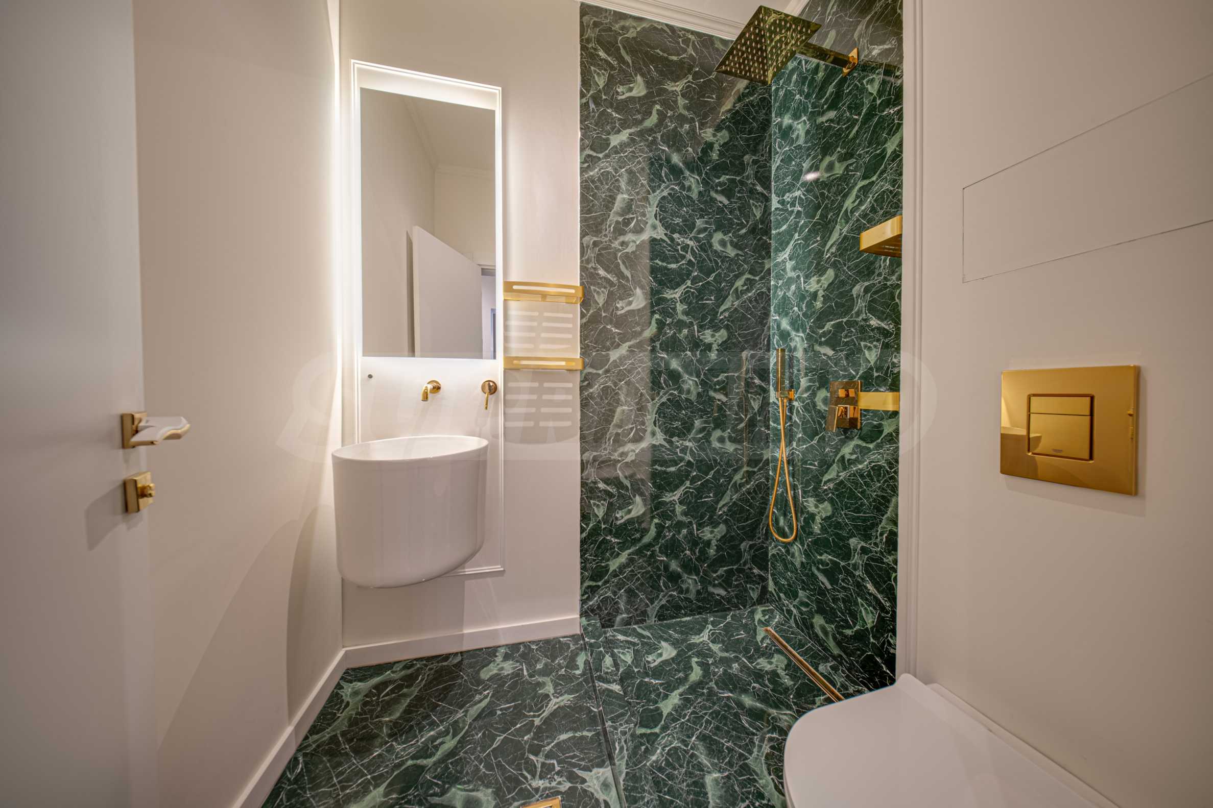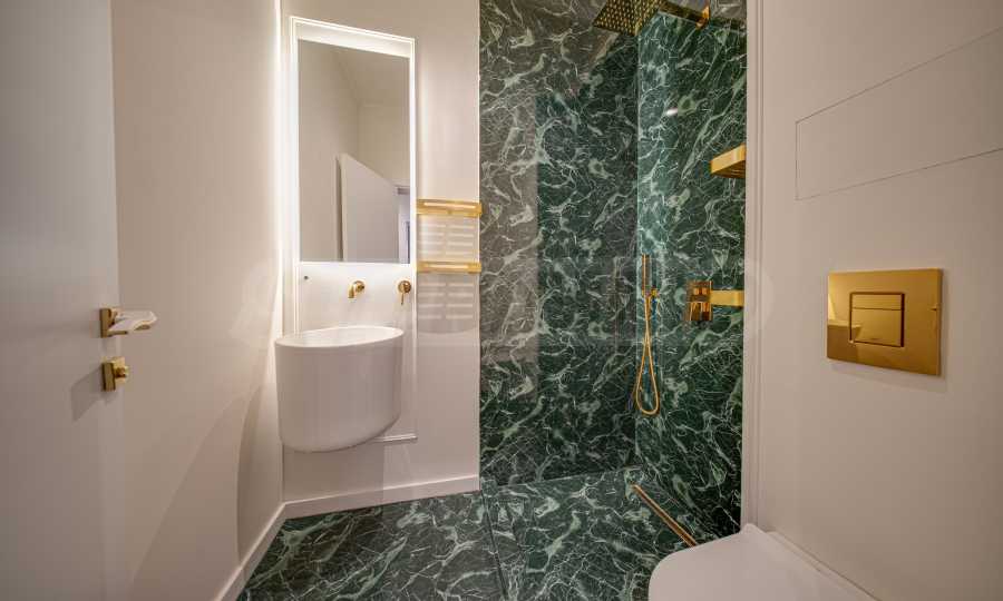 • Ванная комната с полированной гранитной плиткой и штукатуркой.