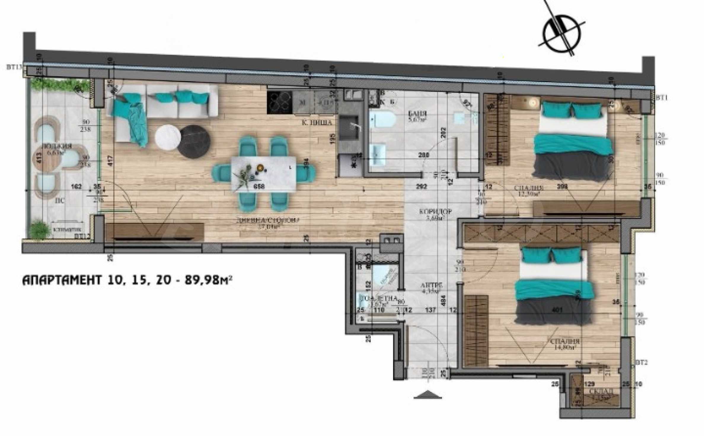 • Просторная гостиная с кухонным уголком и обеденной зоной, две отдельные спальни, ванная комната с туалетом, дополнительный туалет, кладовая и терраса.