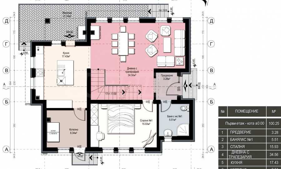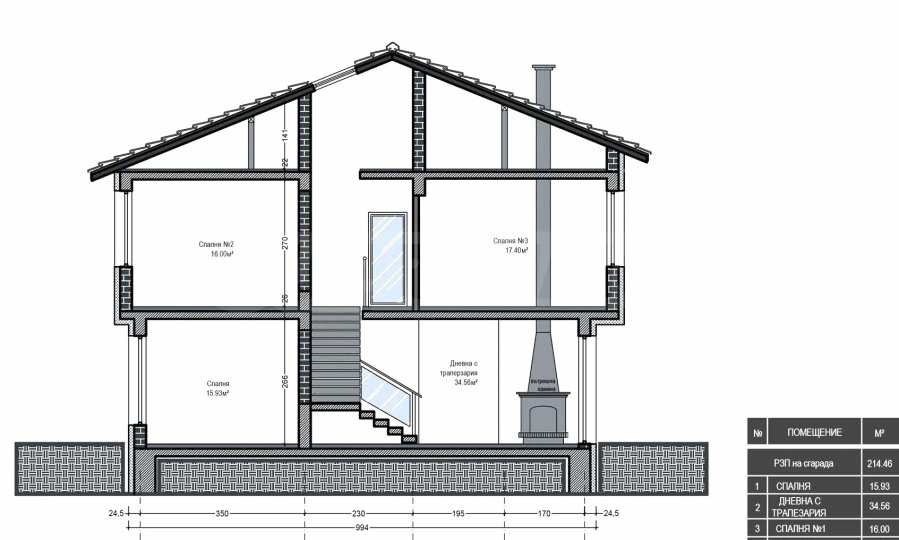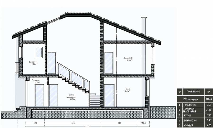 • Первый этаж: прихожая, гостиная с зоной отдыха, столовая, внутренняя лестница, кухня с кладовой, спальня, ванная комната с туалетом, веранда с выходом во двор;