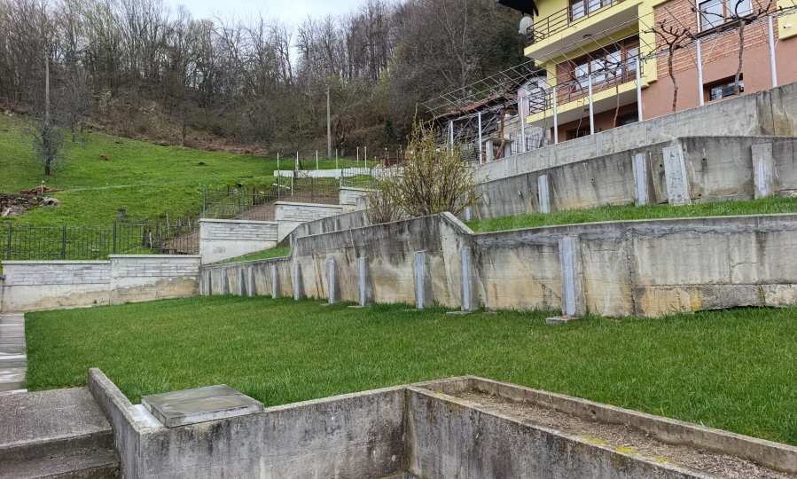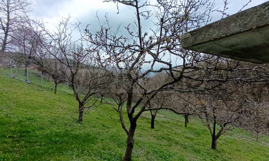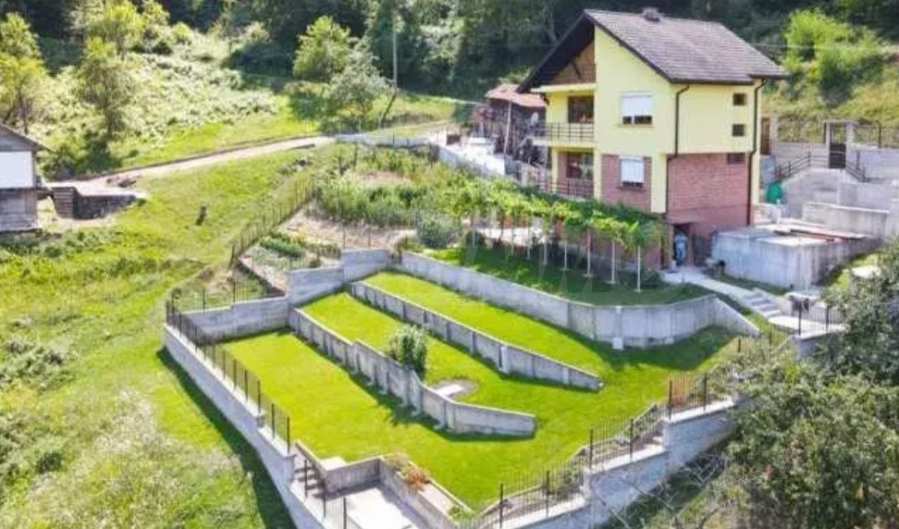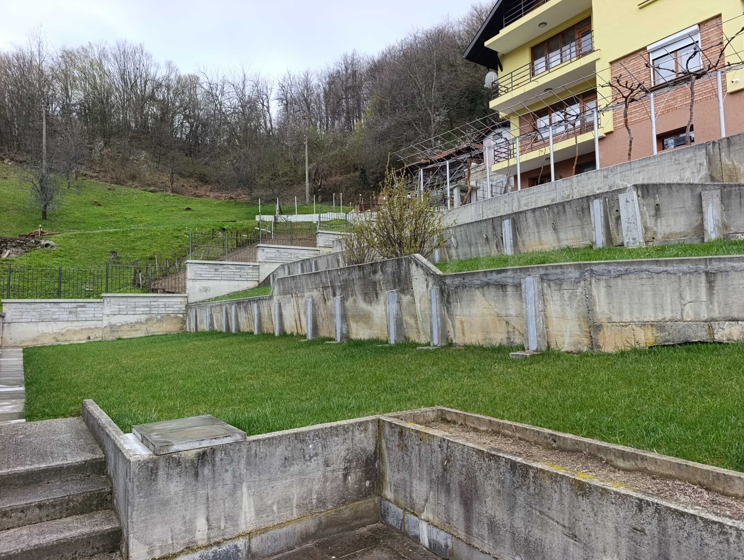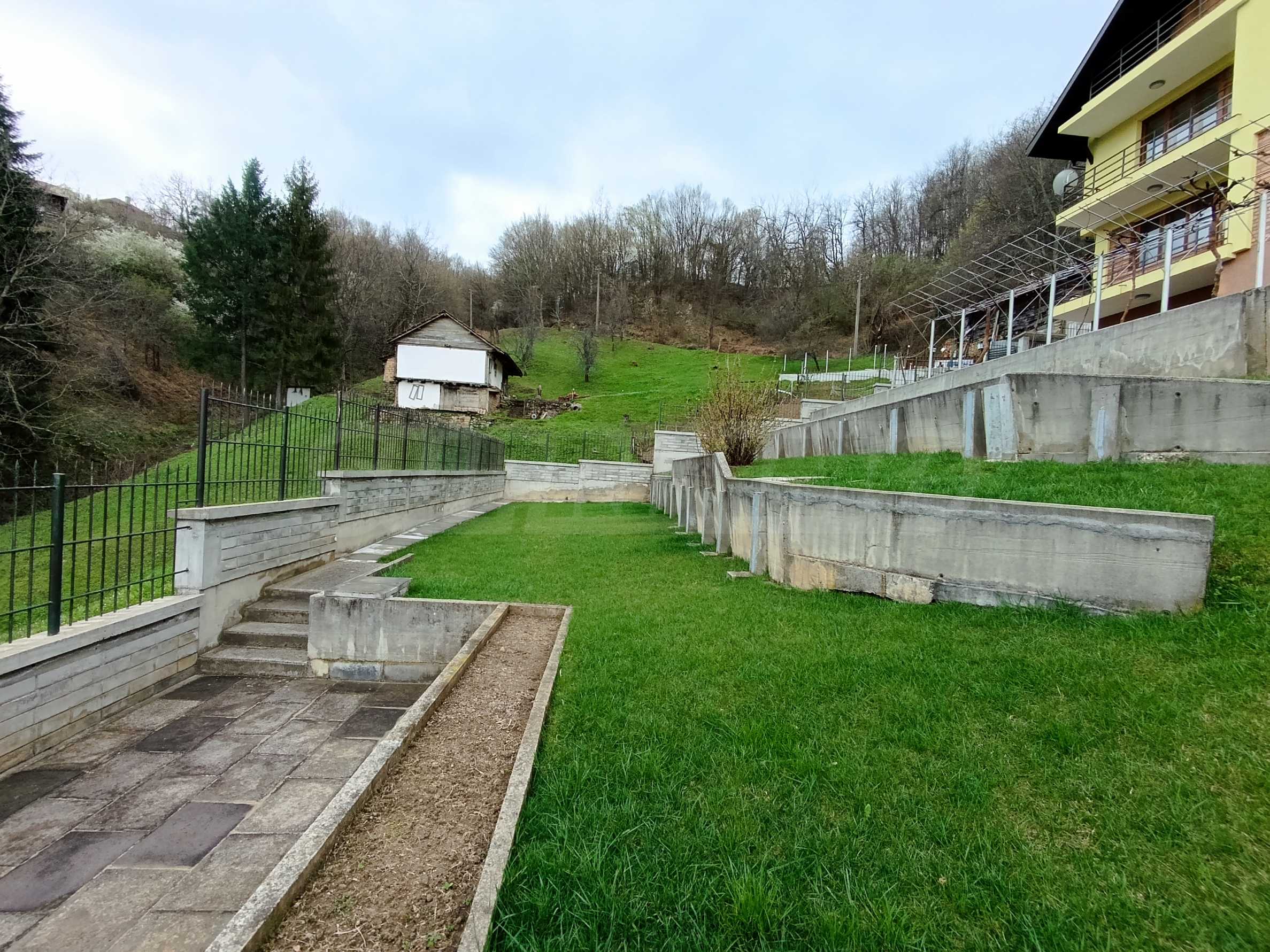 Двор площадью 2000 кв. м, террасированный и ухоженный, с фруктовым садом и отдельной панорамной зоной, подходит для отдыха и релаксации на природе.