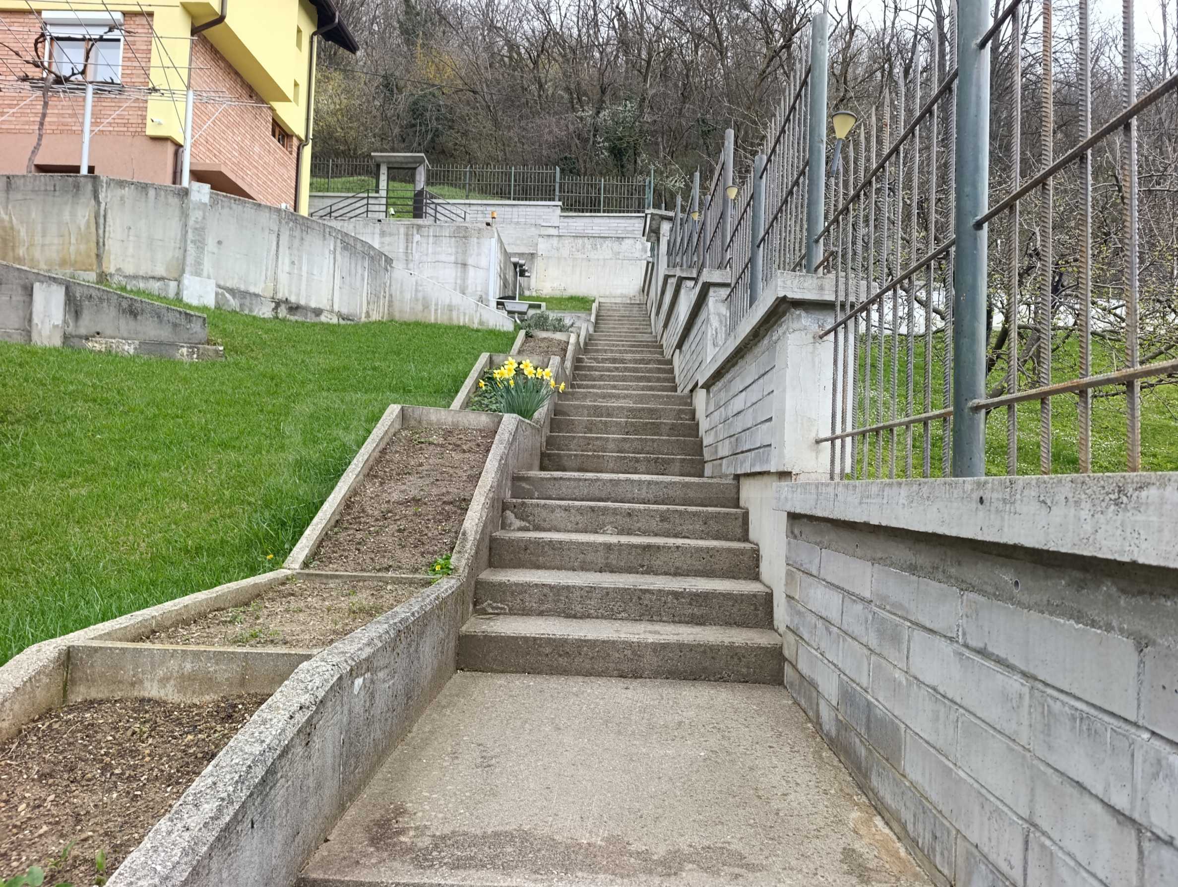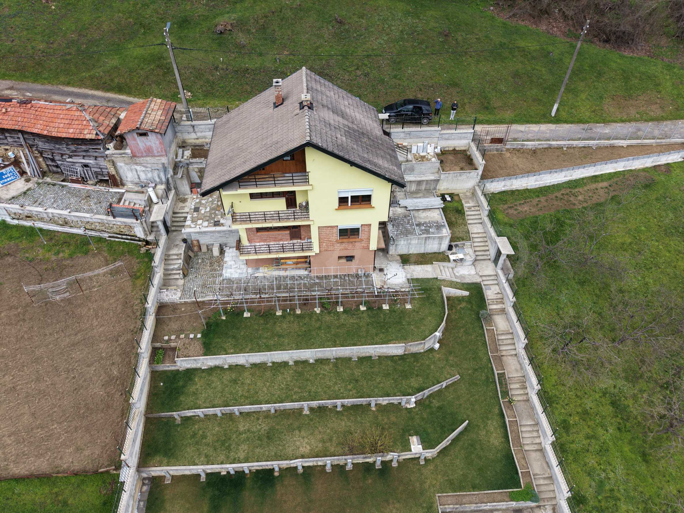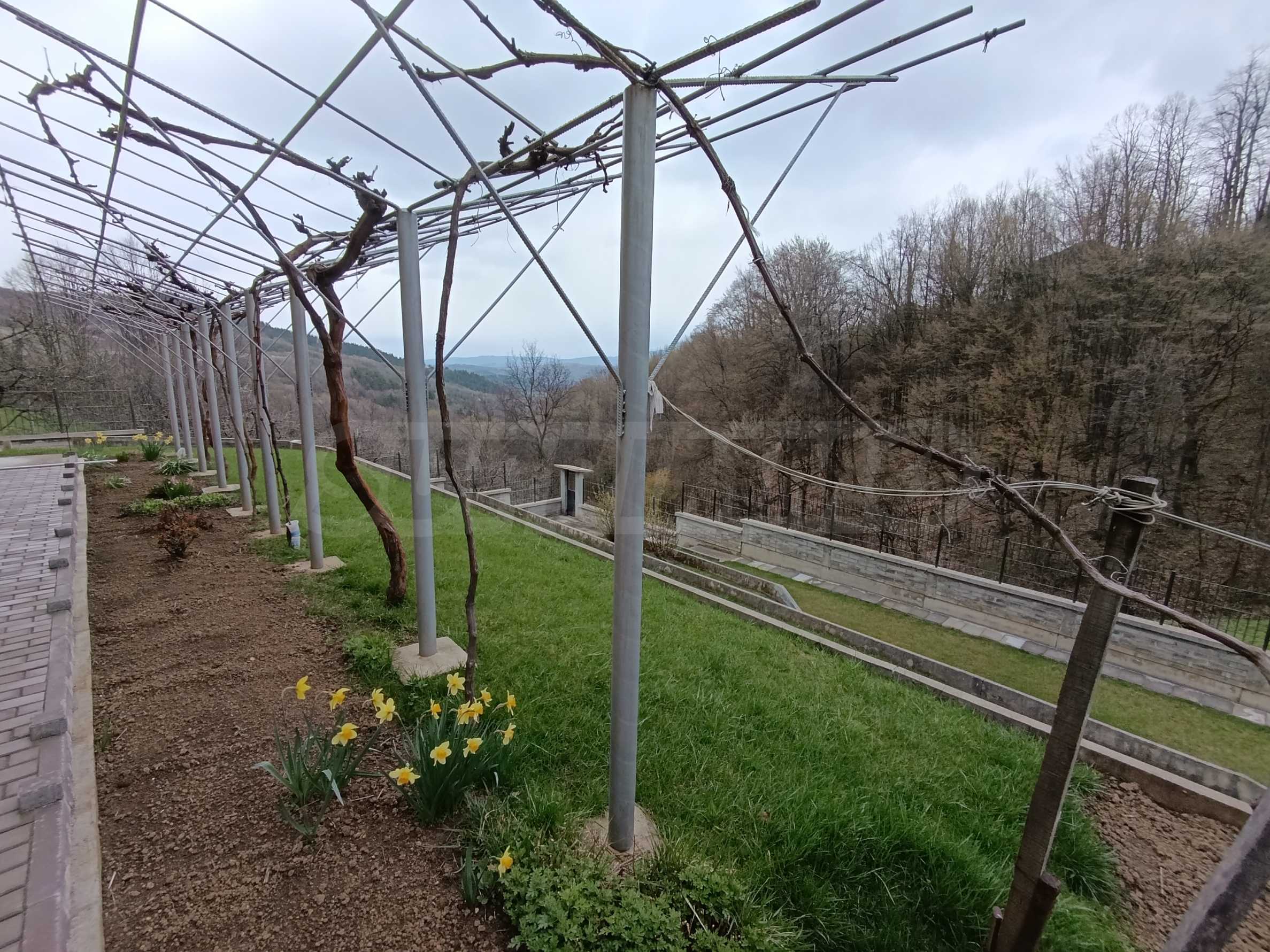 Двор площадью 2000 кв. м, террасированный и ухоженный, с фруктовым садом и отдельной панорамной зоной, подходит для отдыха и релаксации на природе.
