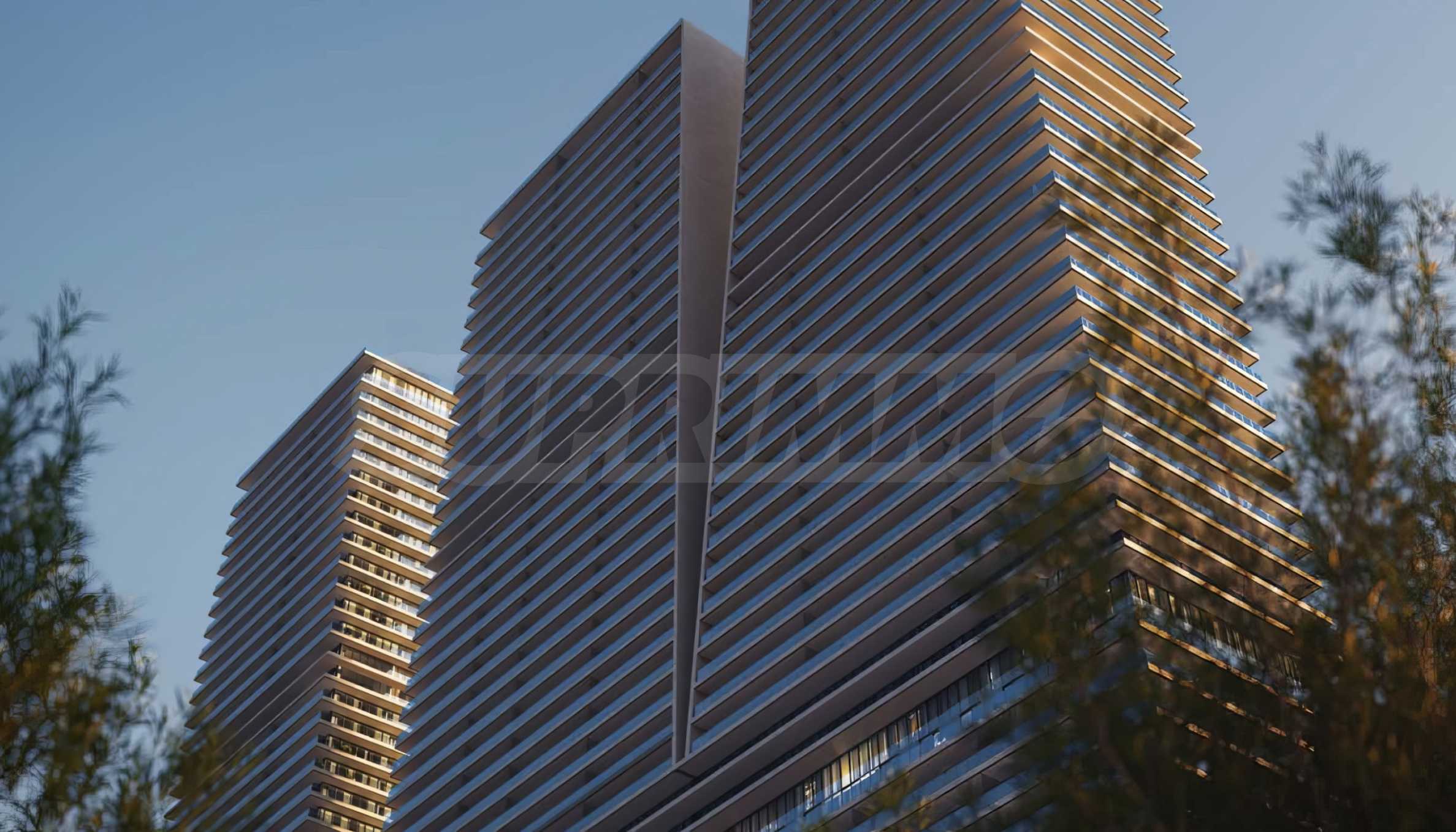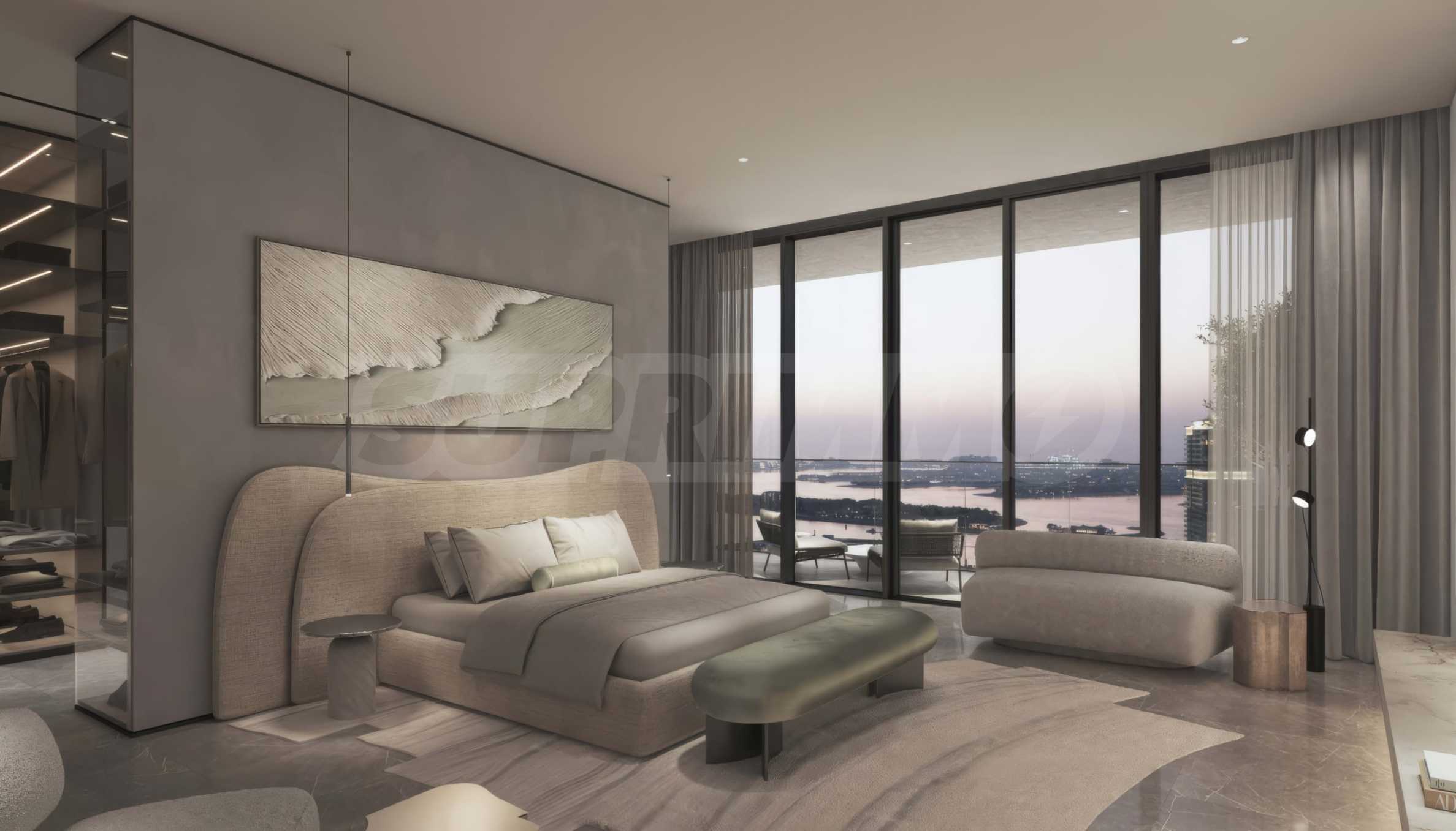 Все резиденции отличаются высокими потолками и панорамными окнами от пола до потолка, которые наполняют интерьеры естественным светом, создавая ощущение простора и легкости, и одновременно обрамляют впечатляющие виды на море и динамичный городской пейзаж. Жилые зоны организованы в открытой планировке и гармонично объединяют гостиную, кухню и столовую, создавая естественное пространство для совместного времяпрепровождения. Каждая спальня имеет собственную ванную комнату, обеспечивая необходимый баланс между общими зонами и личным пространством для уединения и спокойствия. Особое внимание уделено просторным террасам, спроектированным как солнечные оазисы, идеально подходящие для утреннего кофе или отдыха на фоне морского горизонта или городской панорамы.