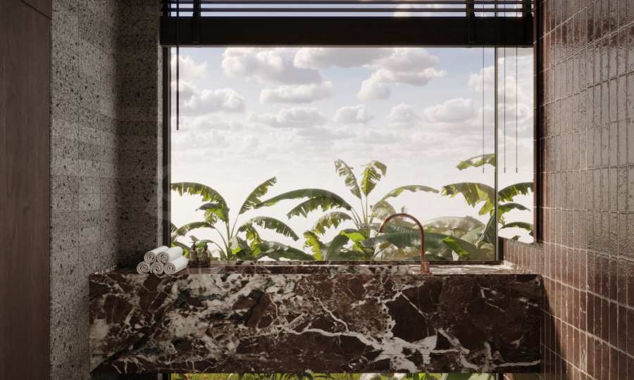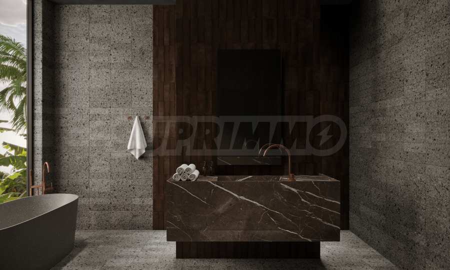 В дизайне ключевую роль играют натуральные материалы: тиковые полы, деревянные потолки, двери и декоративные элементы, а также отделочные стены из мрамора и травертина с тщательно проработанными мотивами.