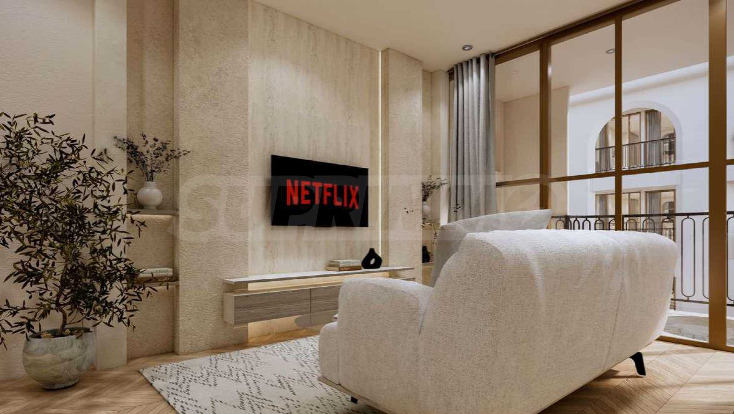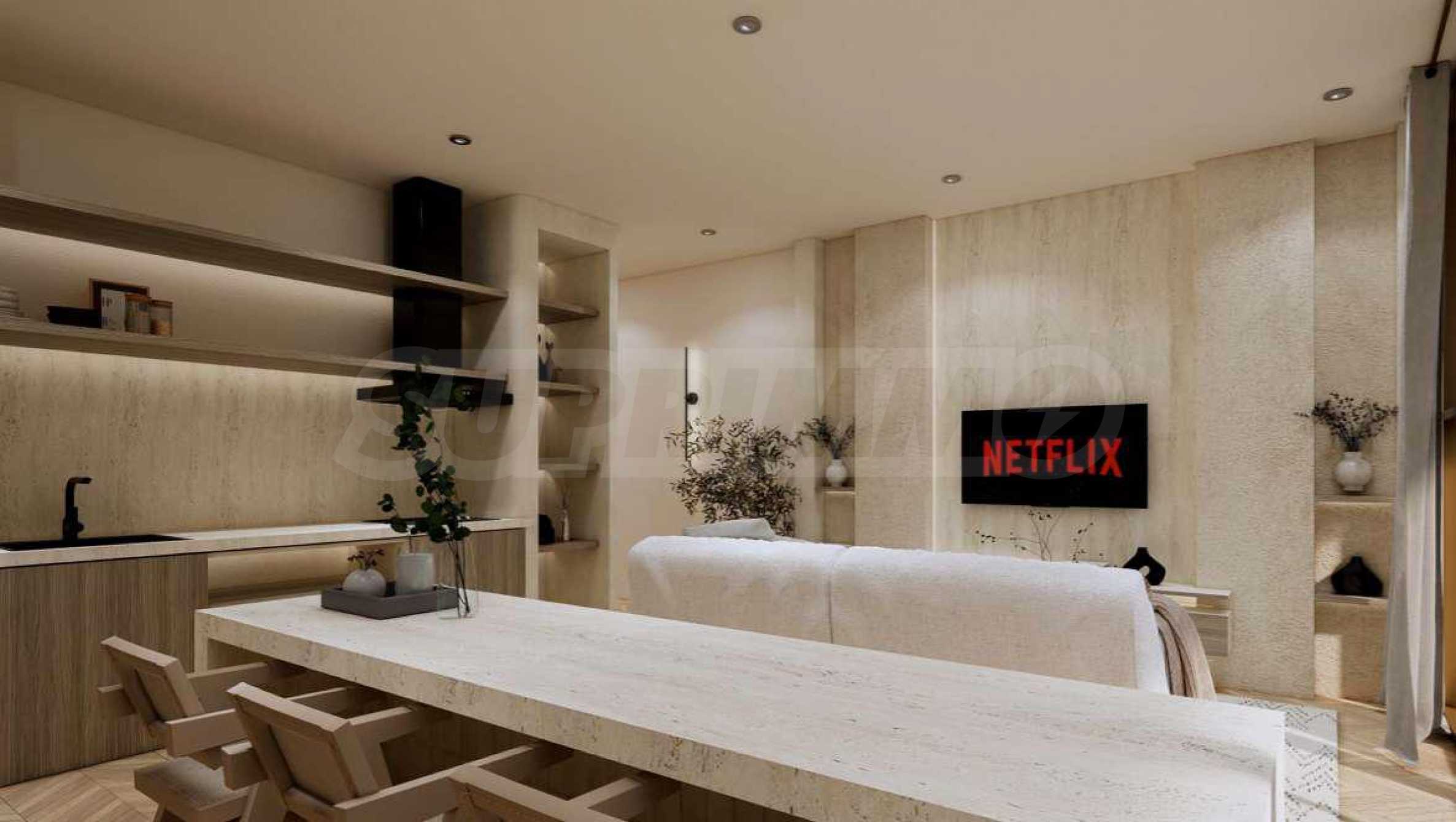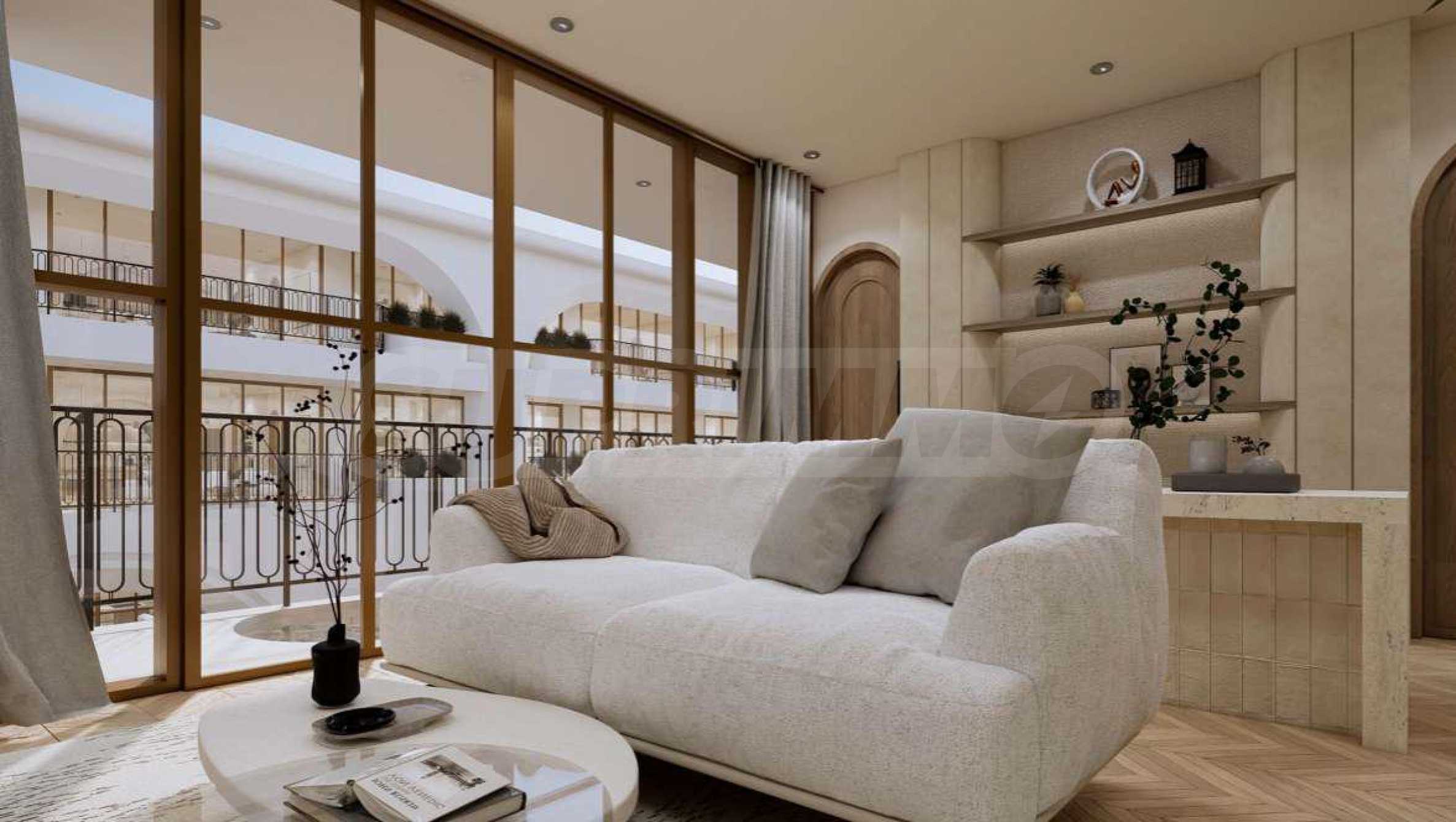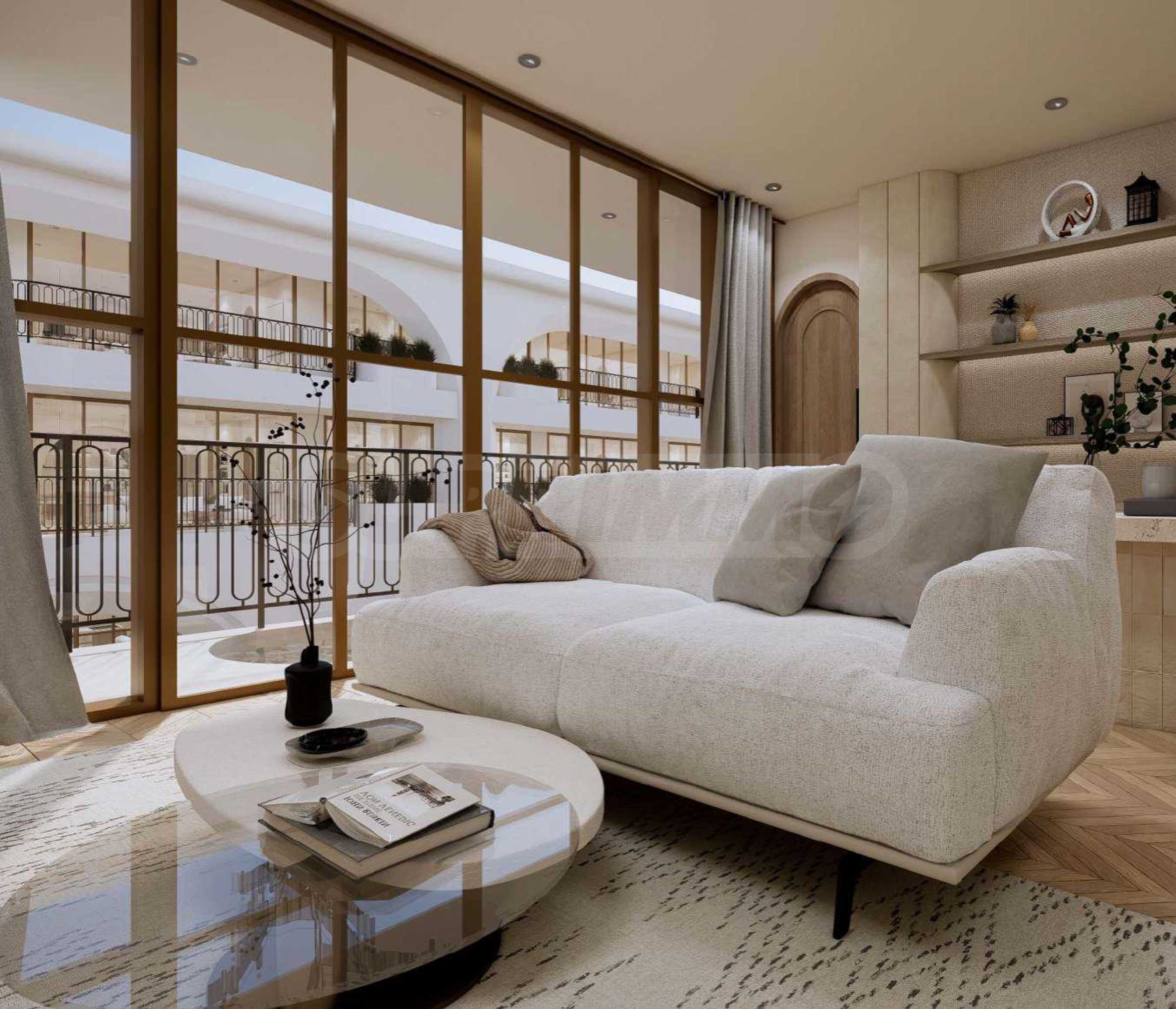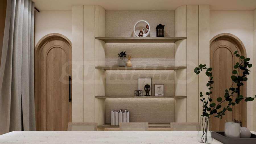 Квартира предлагается полностью меблированной и оборудованной, с использованием натуральных материалов для напольного покрытия, высококачественной бытовой техники и стильной мебели, создающих ощущение гармонии и элегантности. Окна от пола до потолка и высокие потолки способствуют ощущению света, простора и свободы.