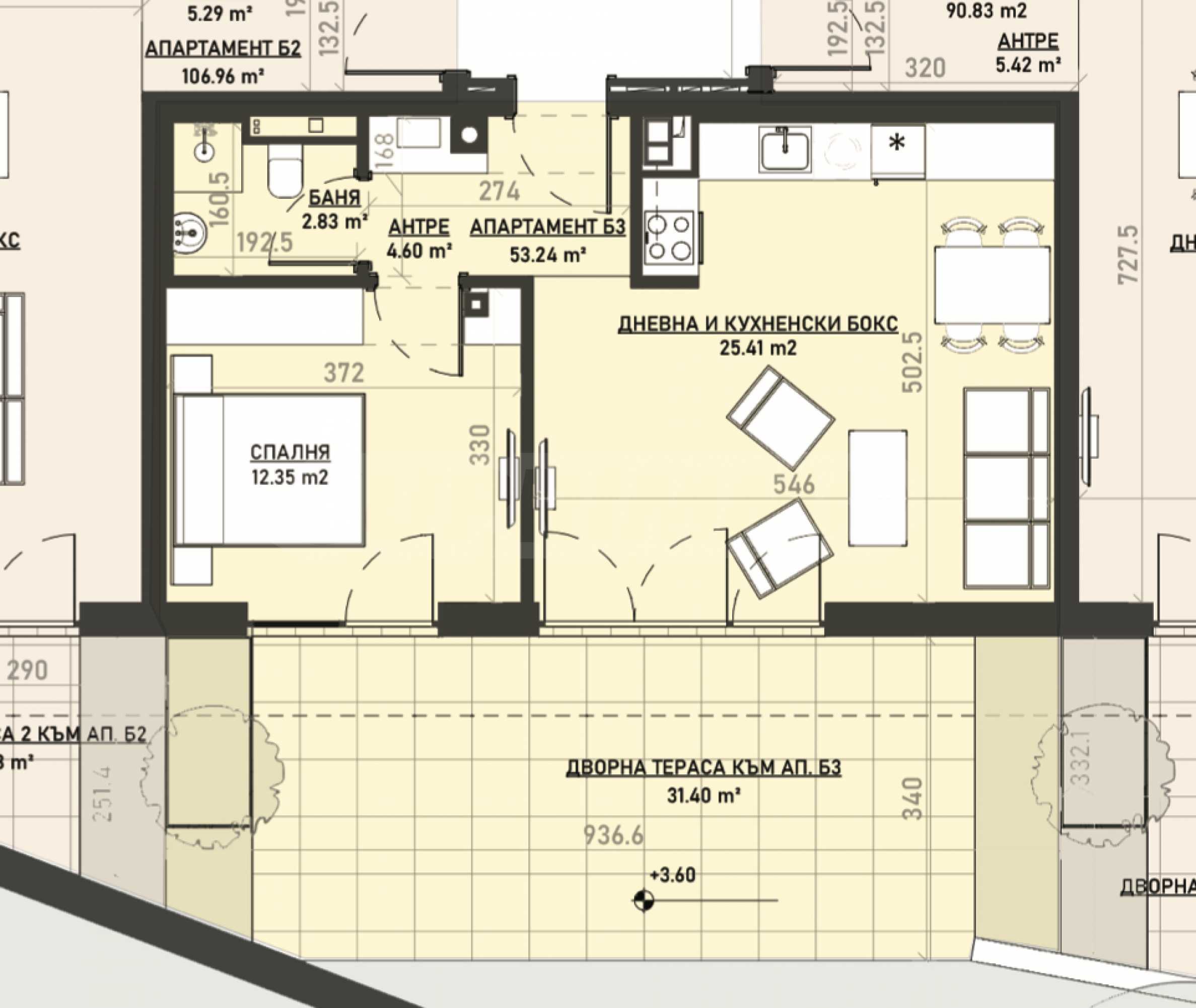 Просторная квартира расположена на первом этаже в корпусе B и имеет общую площадь 60,33 кв. метров., полезную площадь 53,24 кв. метров., а также собственный дворик площадью 31,40 кв. метров. Окна выходят на юг. Квартира предлагается в состоянии отделки, соответствующем болгарским стандартам, с газовым отоплением с подогревом пола и подключением для кондиционеров. Она состоит из прихожей, ванной комнаты/туалета, гостиной с кухней и обеденной зоной, одной спальни, террасы во дворике с выходом из обеих комнат.