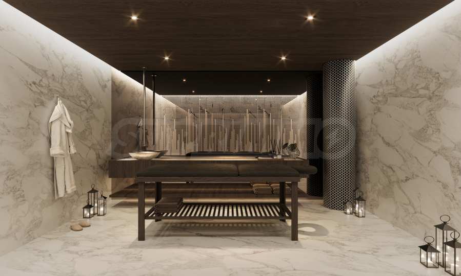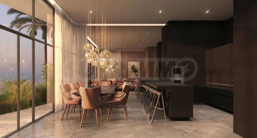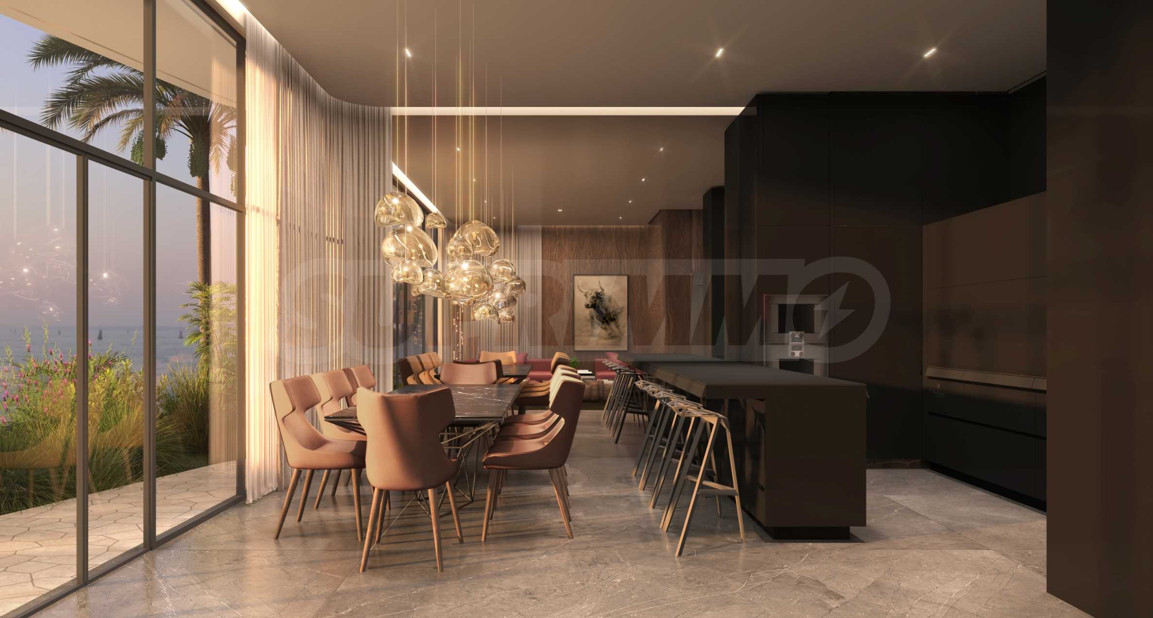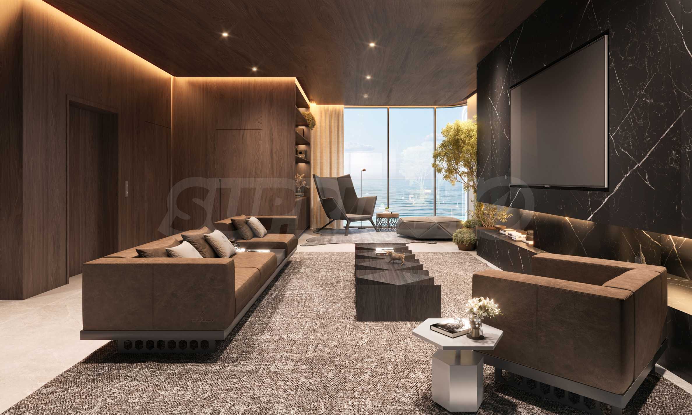 Акустический комфорт, мягкое освещение и продуманные переходы между материалами создают атмосферу спокойной сосредоточенности. Интерьеры задуманы как естественное продолжение дизайнерского языка Тонино Ламборгини – смелого, изысканного и сдержанно элегантного. Чистые архитектурные линии формируют просторные объемы, позволяющие свету свободно струиться по рельефным поверхностям и тщательно подобранной отделке. Сдержанная палитра теплых нейтральных тонов, дополненная едва заметными металлическими акцентами, создает гармонию с прибрежной средой, сохраняя при этом узнаваемый стиль.