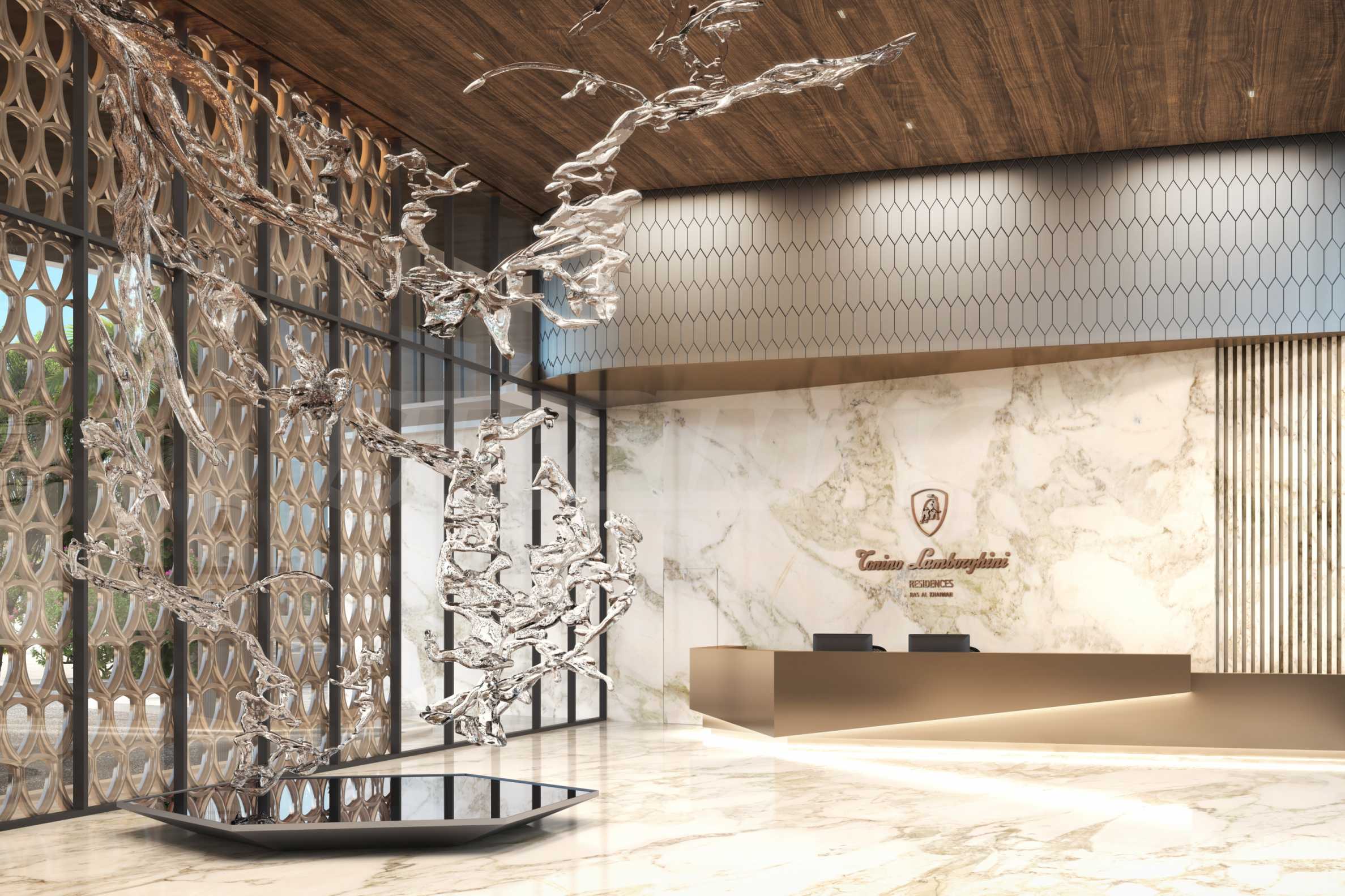Прекрасный фасад, расположенный на берегу острова Аль-Марджан, — это лишь оболочка чудесного мира, который откроется тем, кто выбрал Tonino Lamborghini Residences своим домом. Входное пространство выполнено в чистом и современном стиле, гармонирующем с жилым характером проекта. Четко спроектированный вход ведет к контролируемому доступу, что обеспечивает приватность жильцов и создает ощущение спокойствия и безопасности с первого шага в вестибюль. Зеленые зоны смягчают линии и направляют движение, создавая ненавязчивый переход от общественного пространства к частному.