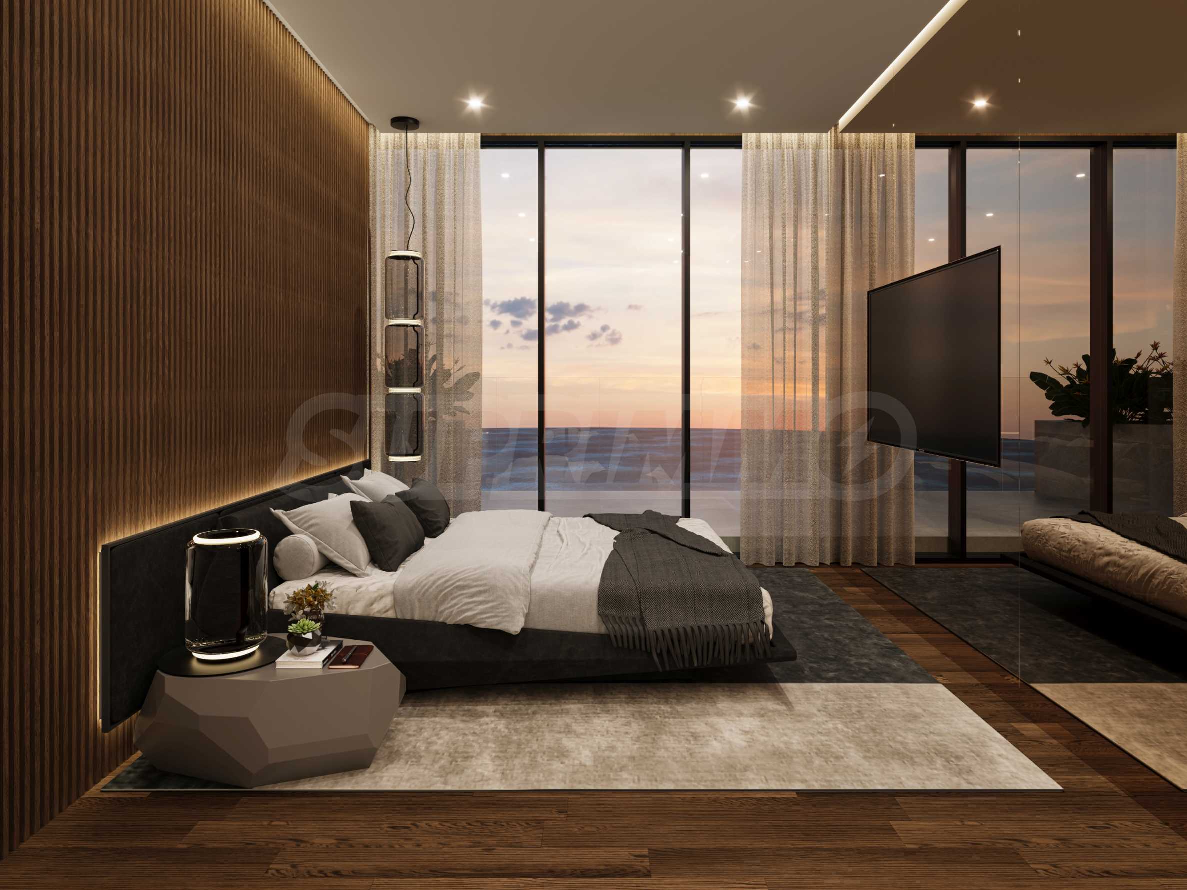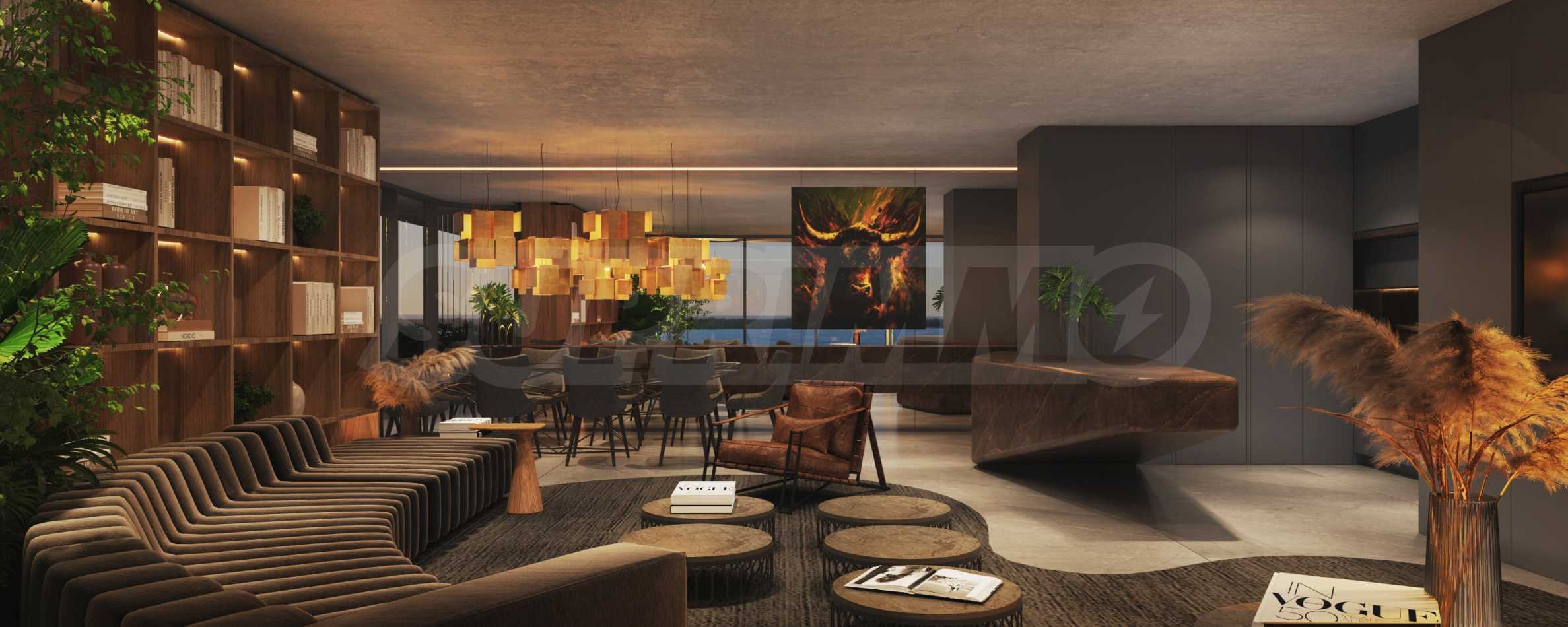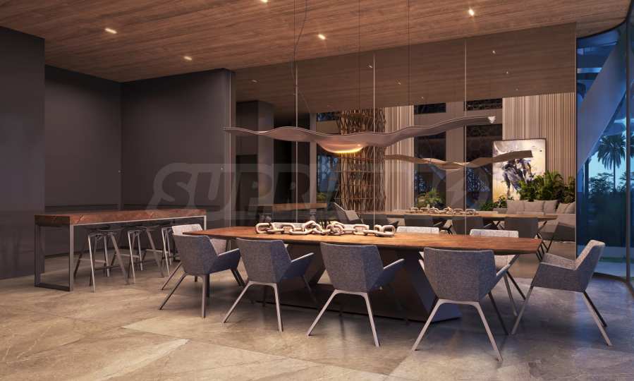 В дизайне интерьеров особое внимание уделено акустическому комфорту, мягкому освещению и плавным переходам между материалами. Дизайн выдержан в характерном стиле Тонино Ламборгини – смелый, точный и элегантный, без излишней вычурности. Чистые линии формируют просторные объемы, в которых свет свободно скользит по рельефным поверхностям и тщательно подобранной отделке. Теплая нейтральная цветовая палитра, дополненная едва заметными металлическими акцентами, гармонирует с прибрежной средой и подчеркивает узнаваемый характер проекта.