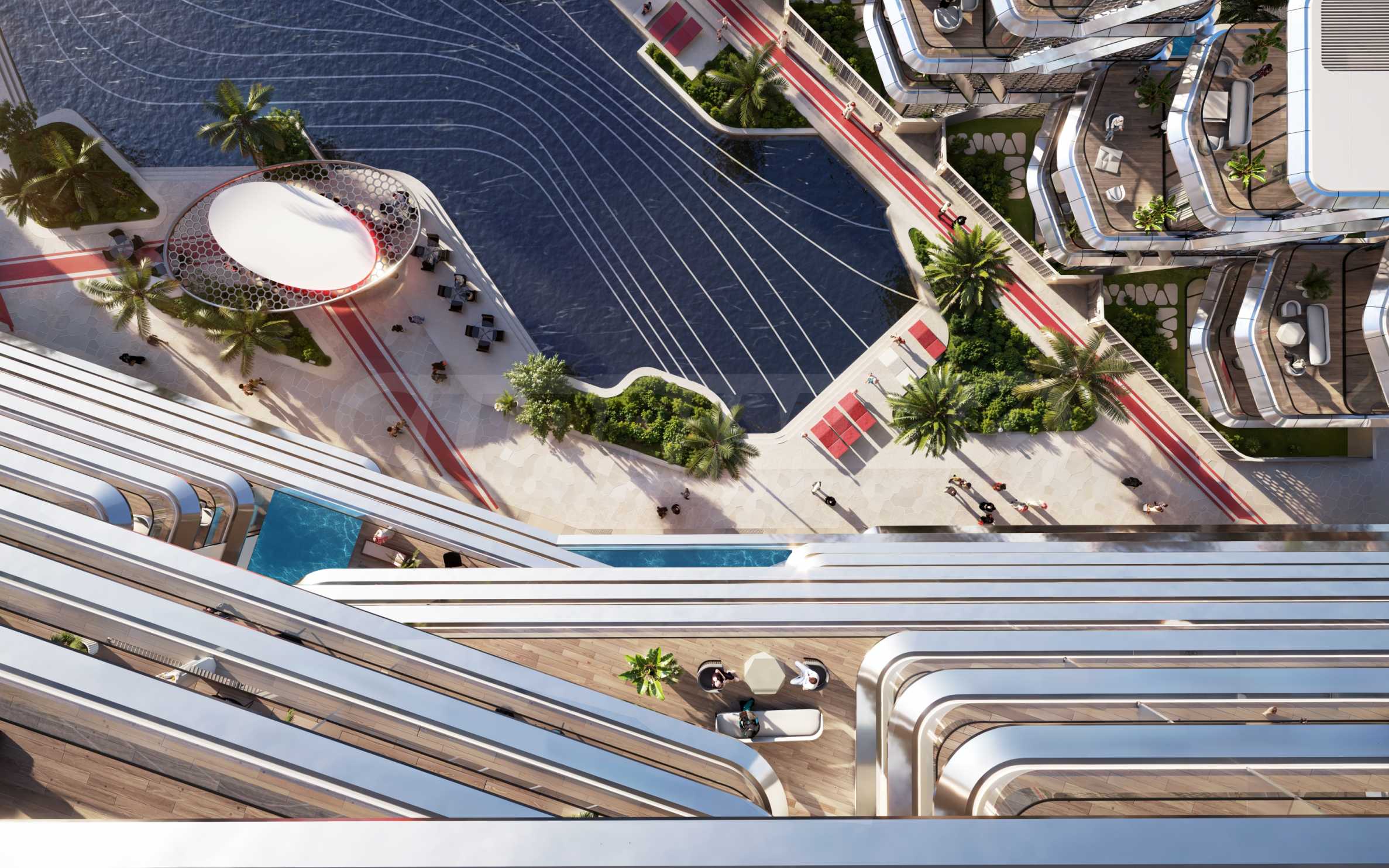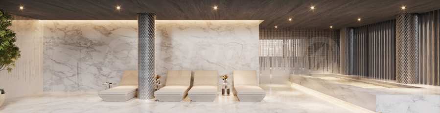 Комплекс включает в себя две впечатляющие зоны с бассейнами – панорамный бассейн на крыше и второй, проходящий через внутренний двор и вдохновленный концепцией «ленивой реки». Также есть детские зоны, обеспечивающие спокойствие родителям и развлечения для малышей. Пространства вокруг бассейнов предназначены для отдыха и принятия солнечных ванн, а расположенный рядом бар дополняет атмосферу курорта освежающими напитками.