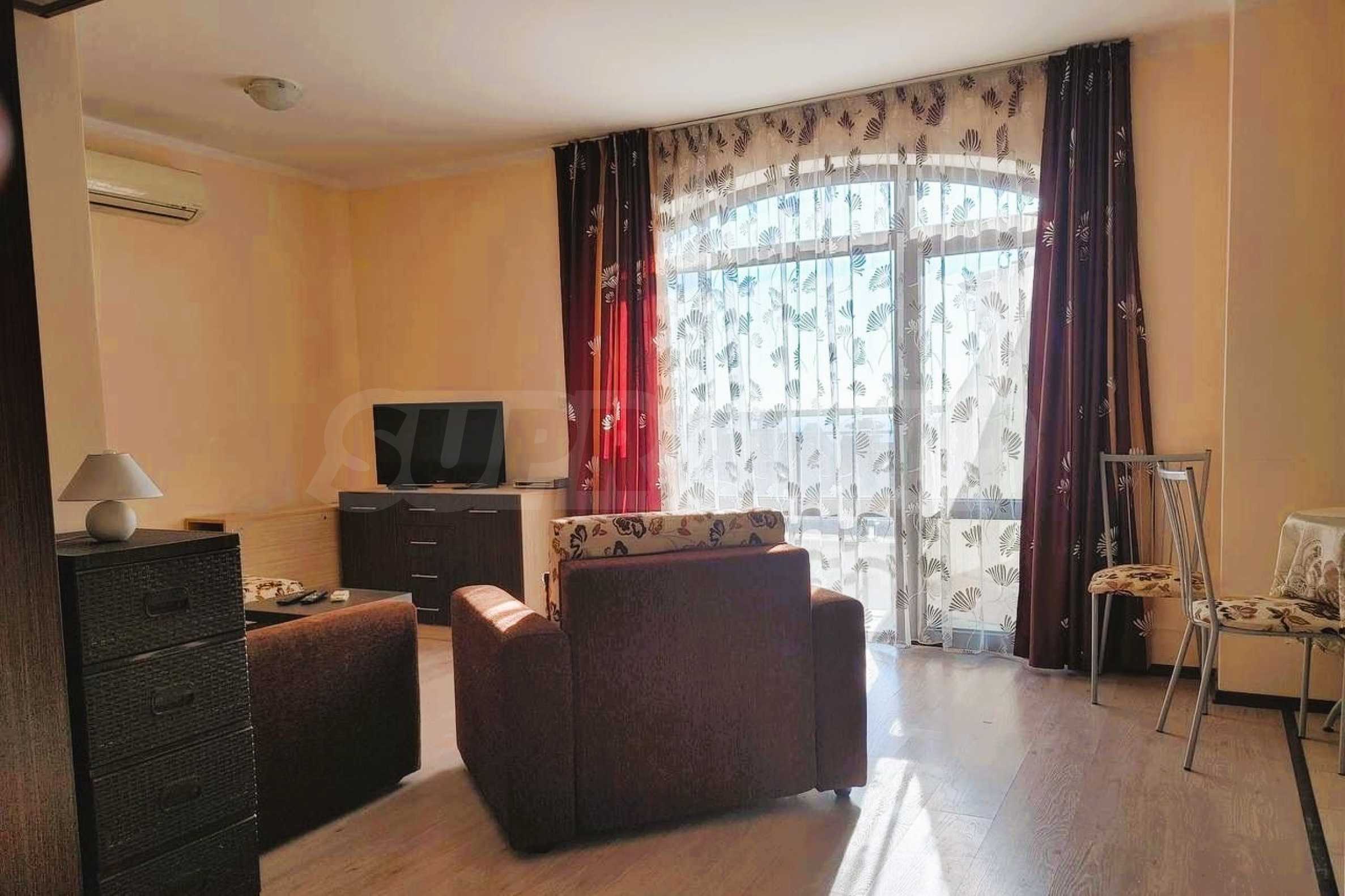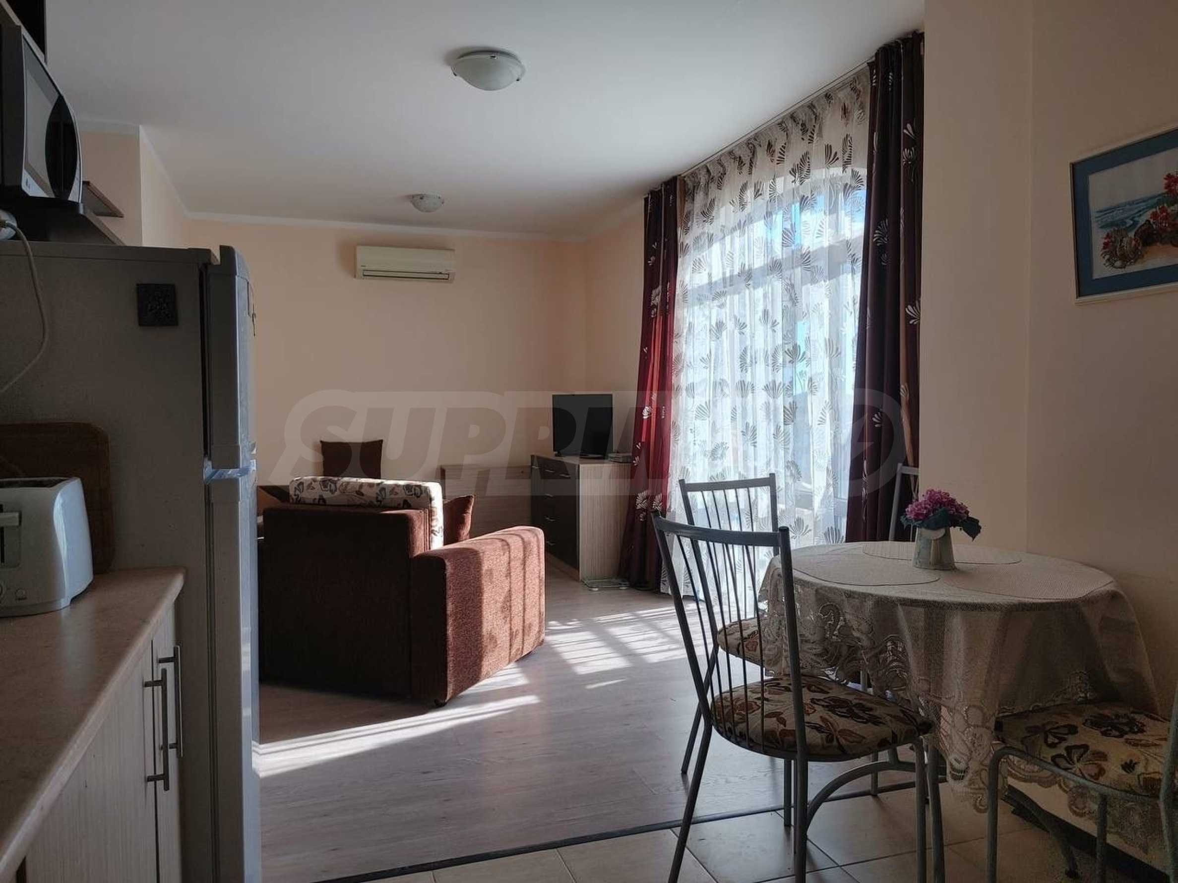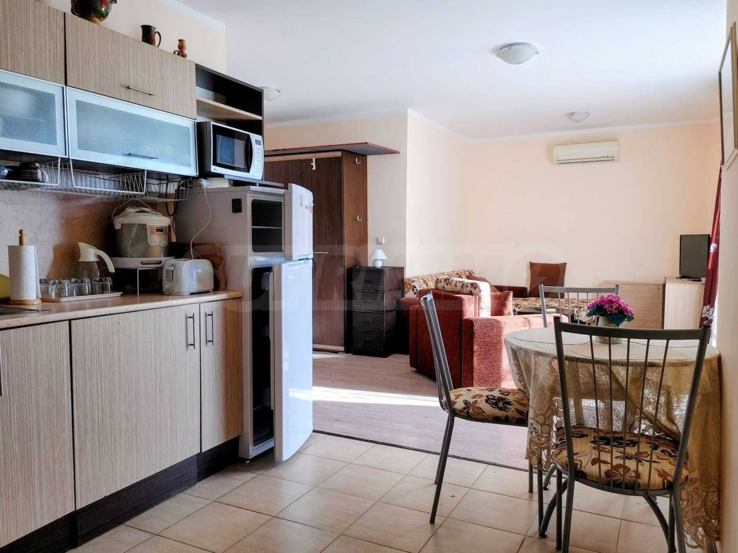 Предлагаем к продаже уютную однокомнатную квартиру в закрытом жилом комплексе с бассейном и парковкой, расположенном в вилловой зоне Кошарица, менее чем в 2 км от пляжей Солнечного Берега.