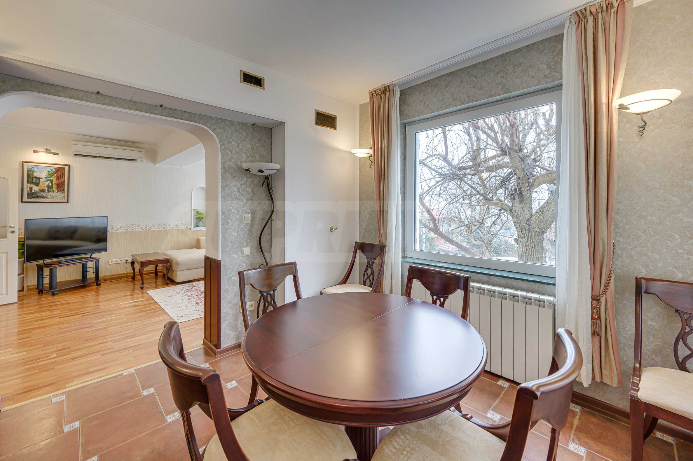 Просторная гостиная с камином; отдельная столовая с высококачественной меблировкую из массива дерева; полностью оборудованная кухня; две спальни; ванная комната с туалетом; балкон.