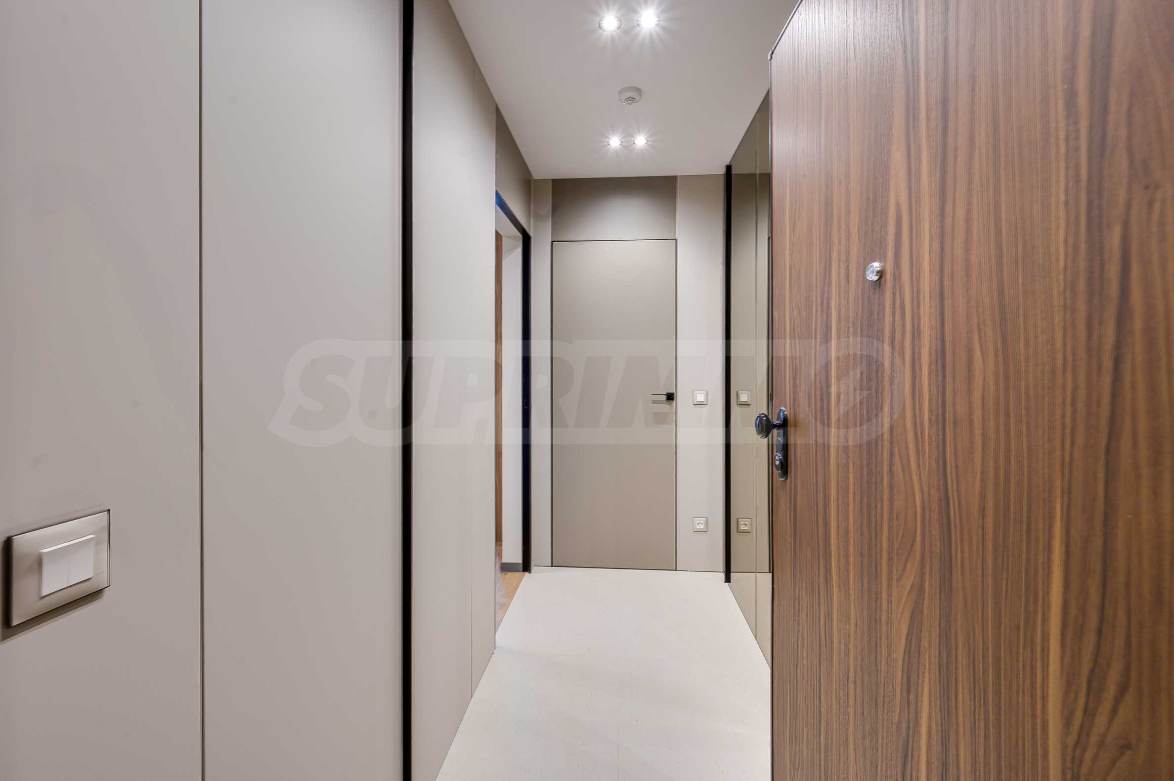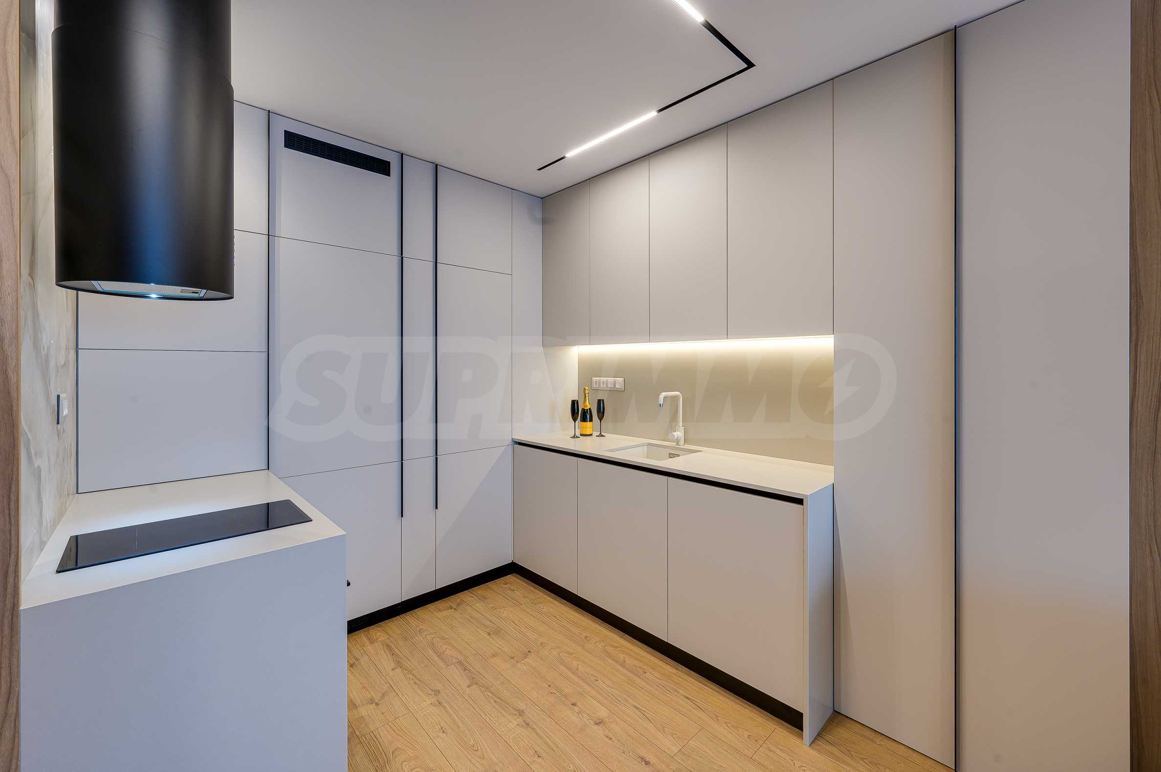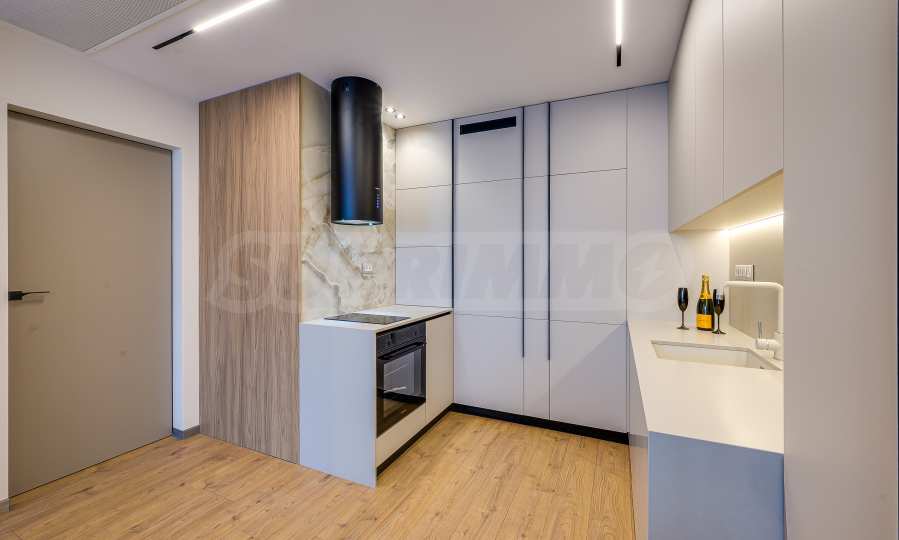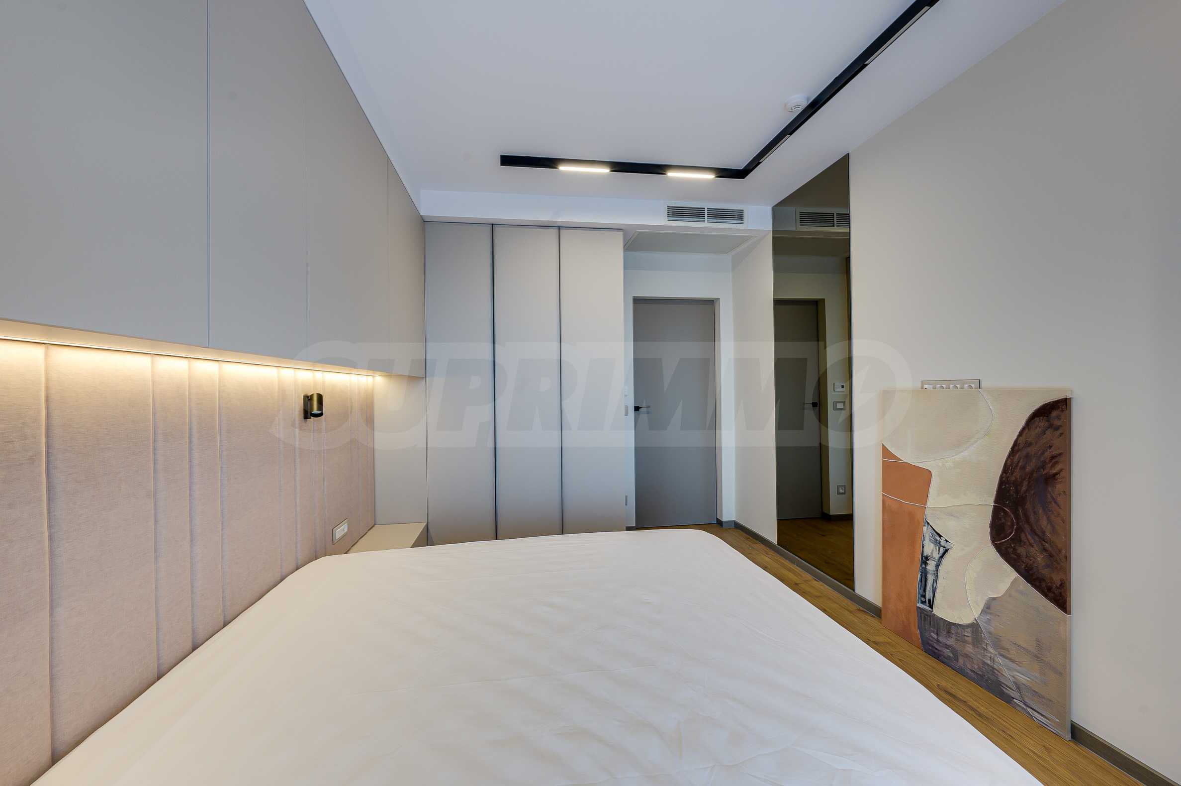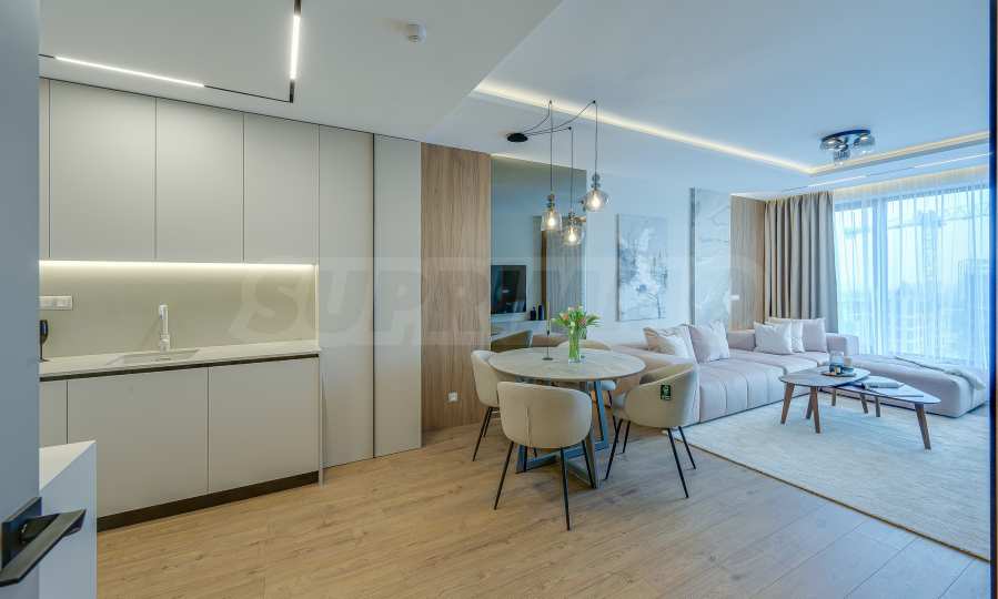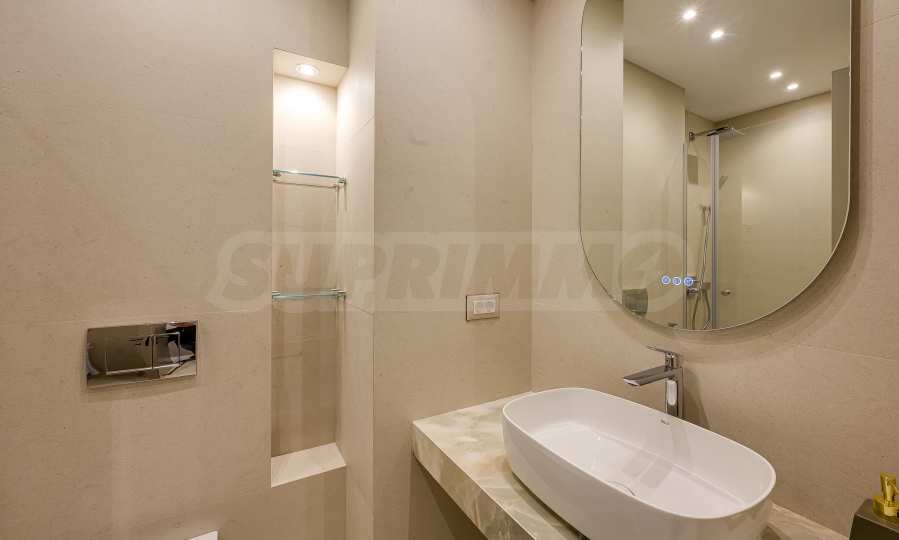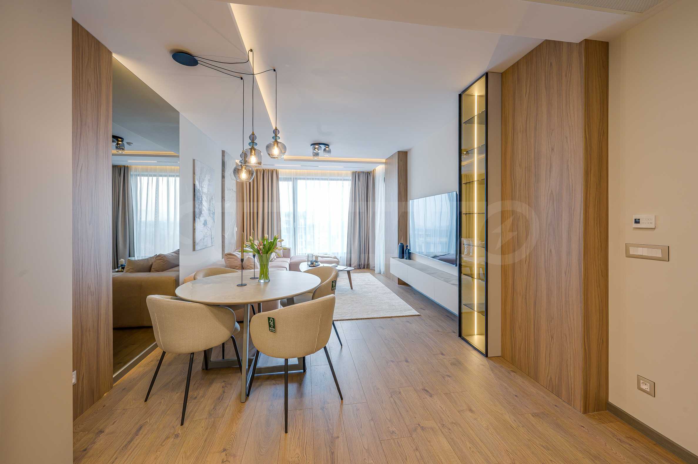 Мебель и оснащение выполнены на высочайшем уровне, по индивидуальному дизайн-проекту с вниманием к каждой детали. Из апартаментов открывается потрясающий панорамный вид на всю Софию — впечатляющий днем и поистине великолепный вечером, когда населенный пункт оживает огнями. Пространство сочетает в себе тепло, свет и роскошь в чрезвычайно гармоничной обстановке.
