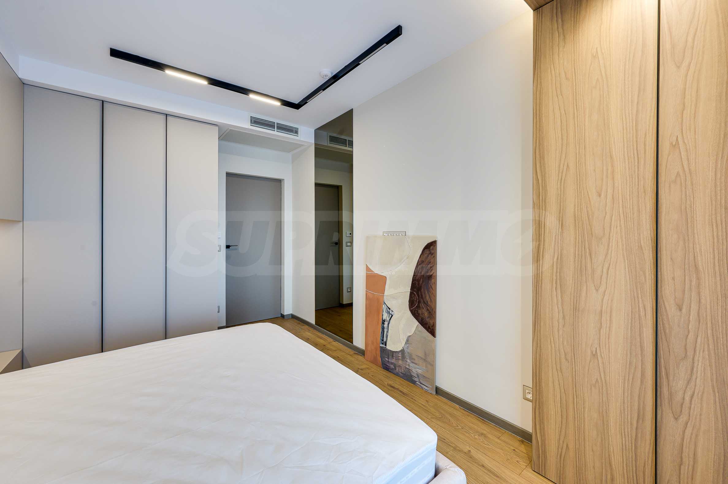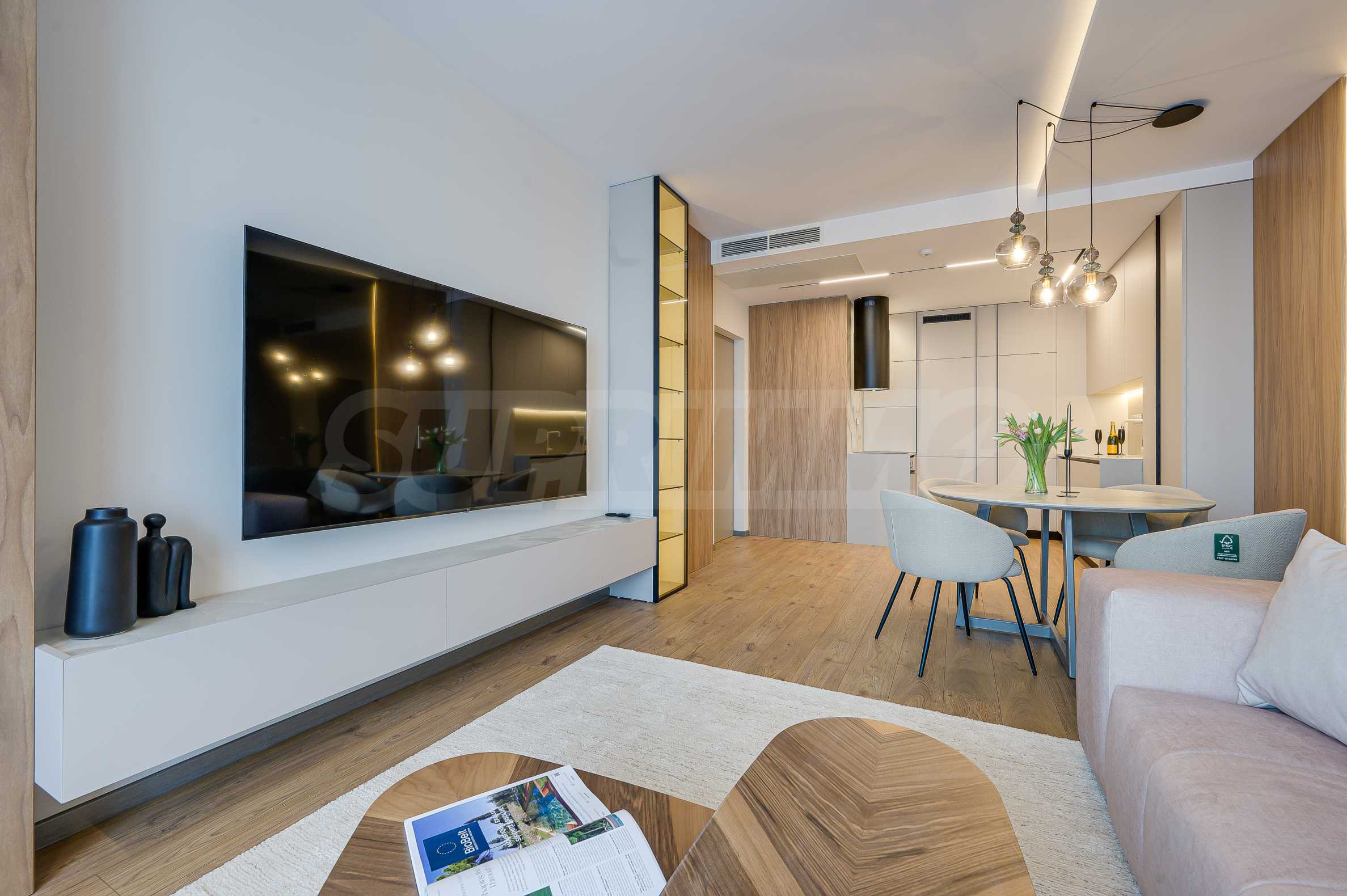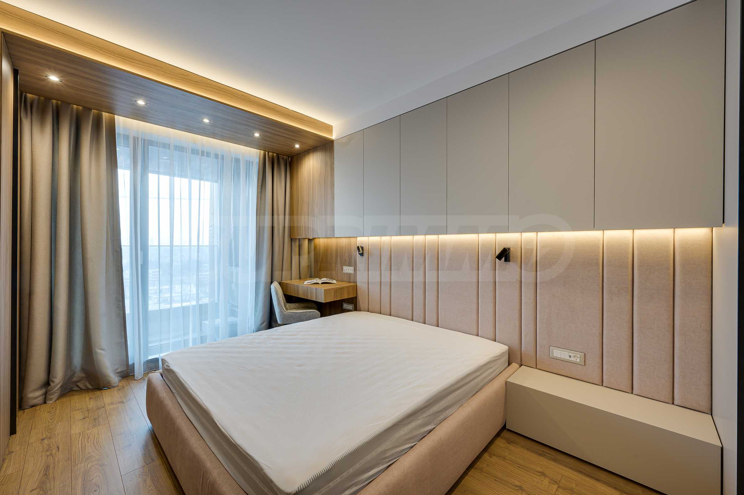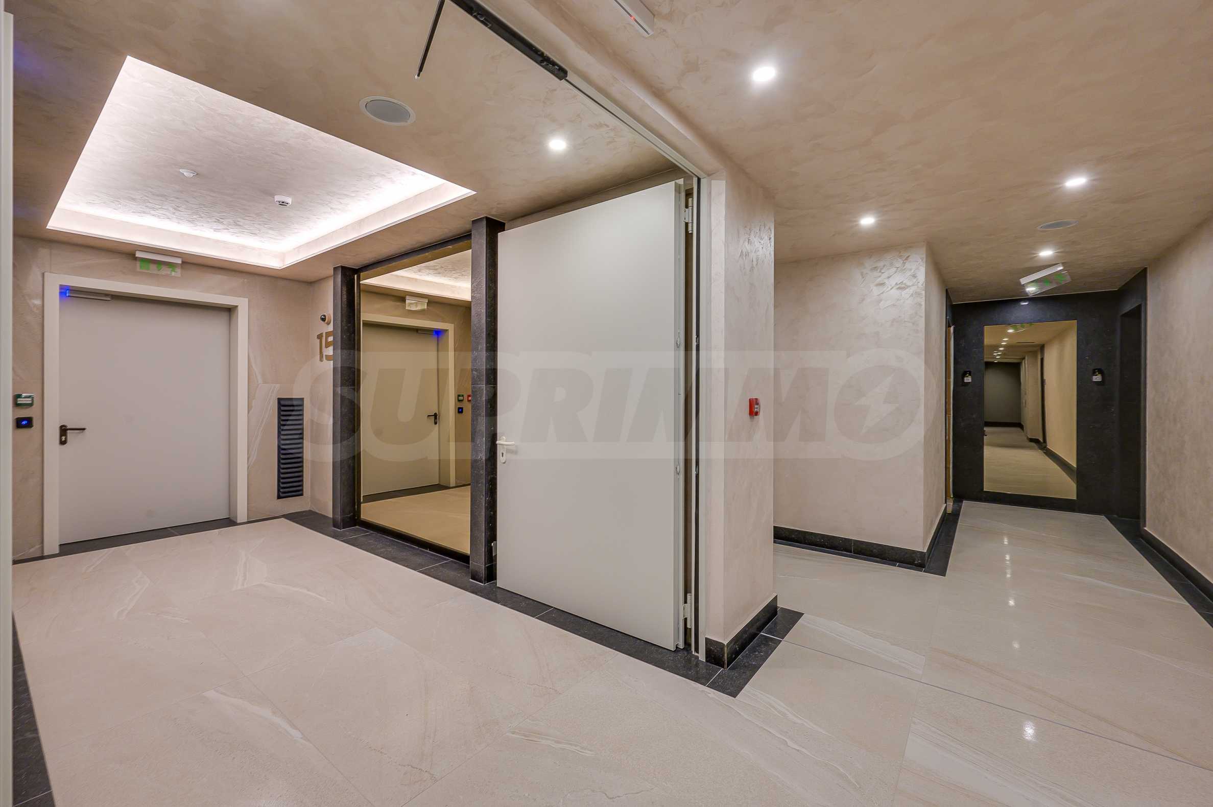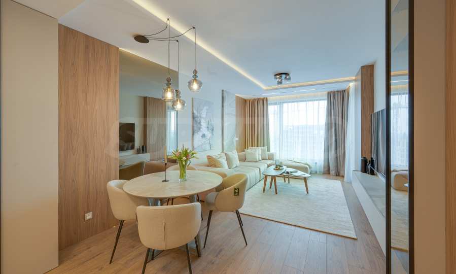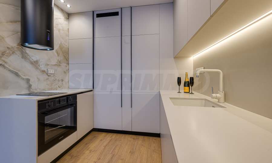 Мебель и оснащение выполнены на высочайшем уровне, по индивидуальному дизайн-проекту с вниманием к каждой детали. Из апартаментов открывается потрясающий панорамный вид на всю Софию — впечатляющий днем и поистине великолепный вечером, когда населенный пункт оживает огнями. Пространство сочетает в себе тепло, свет и роскошь в чрезвычайно гармоничной обстановке.