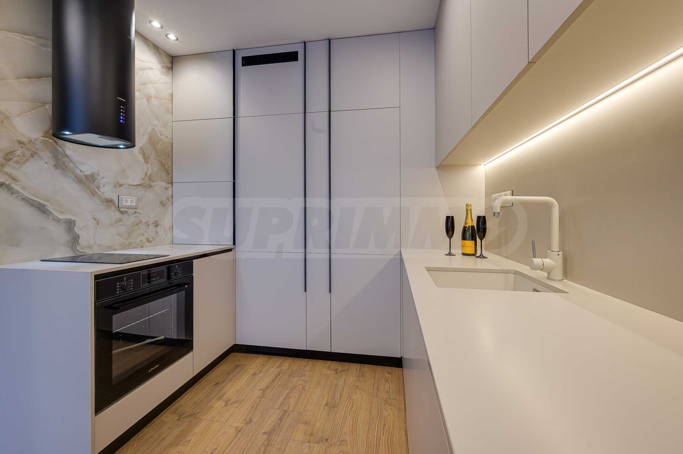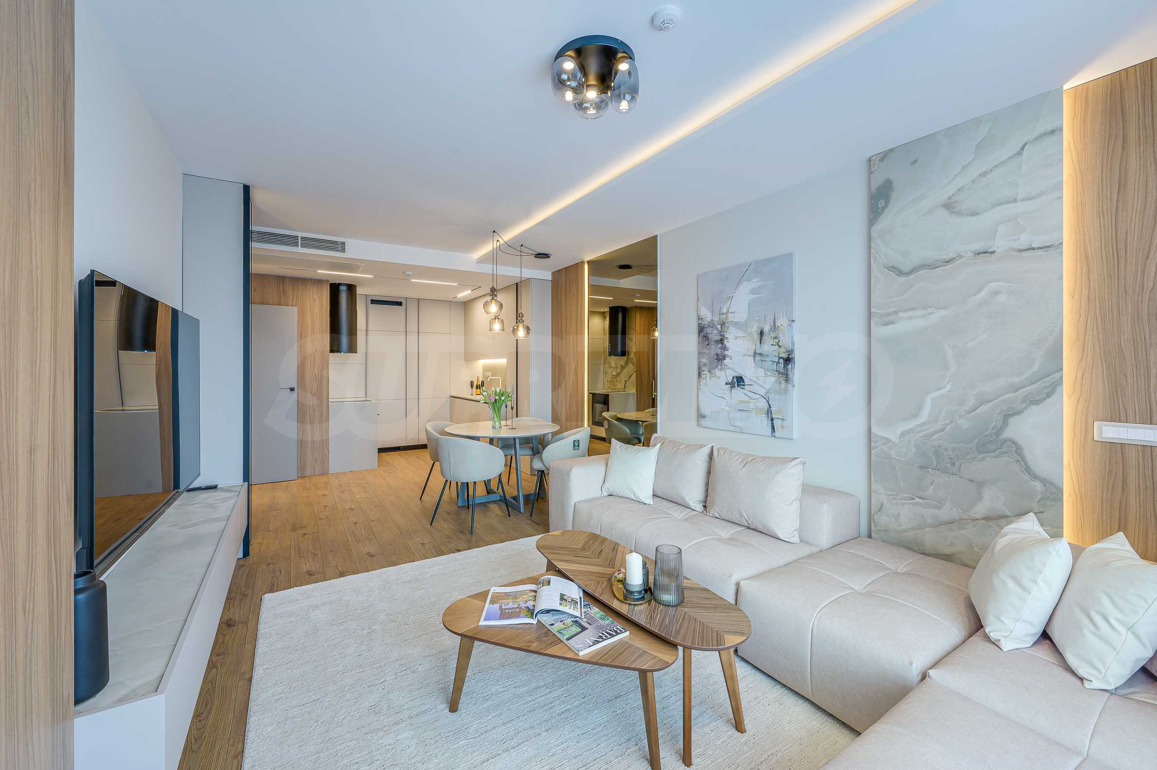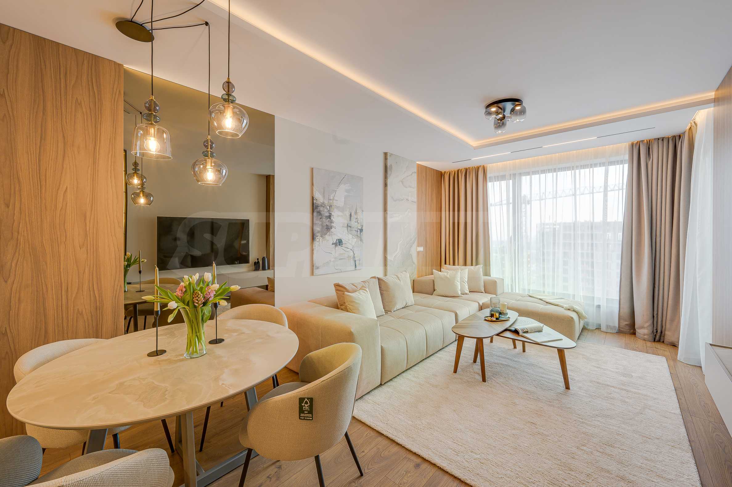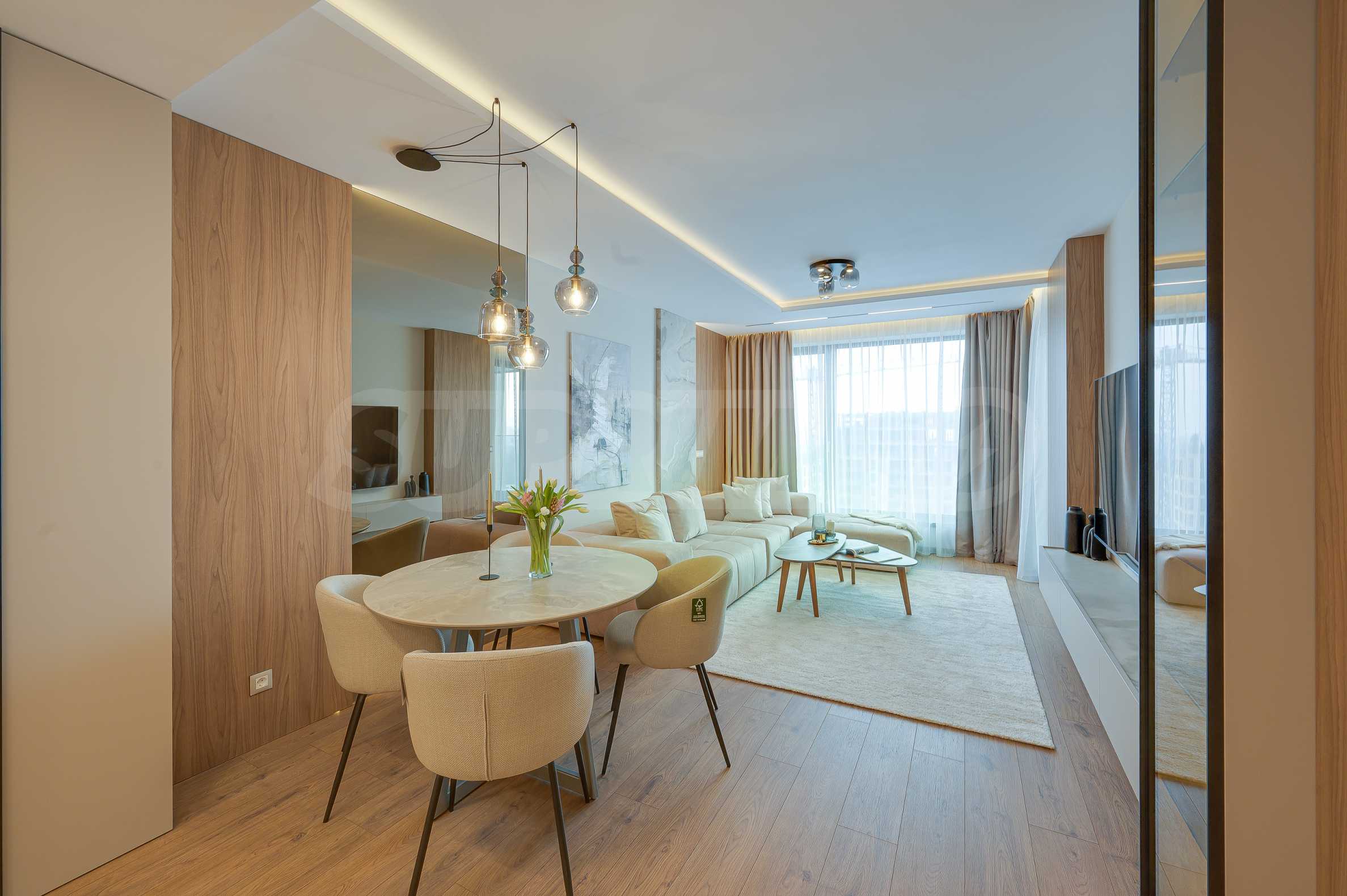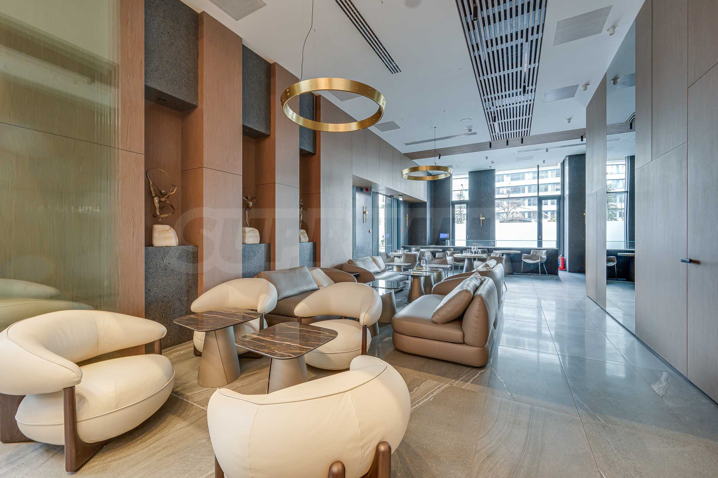 Мебель и оснащение выполнены на высочайшем уровне, по индивидуальному дизайн-проекту с вниманием к каждой детали. Из апартаментов открывается потрясающий панорамный вид на всю Софию — впечатляющий днем и поистине великолепный вечером, когда населенный пункт оживает огнями. Пространство сочетает в себе тепло, свет и роскошь в чрезвычайно гармоничной обстановке.