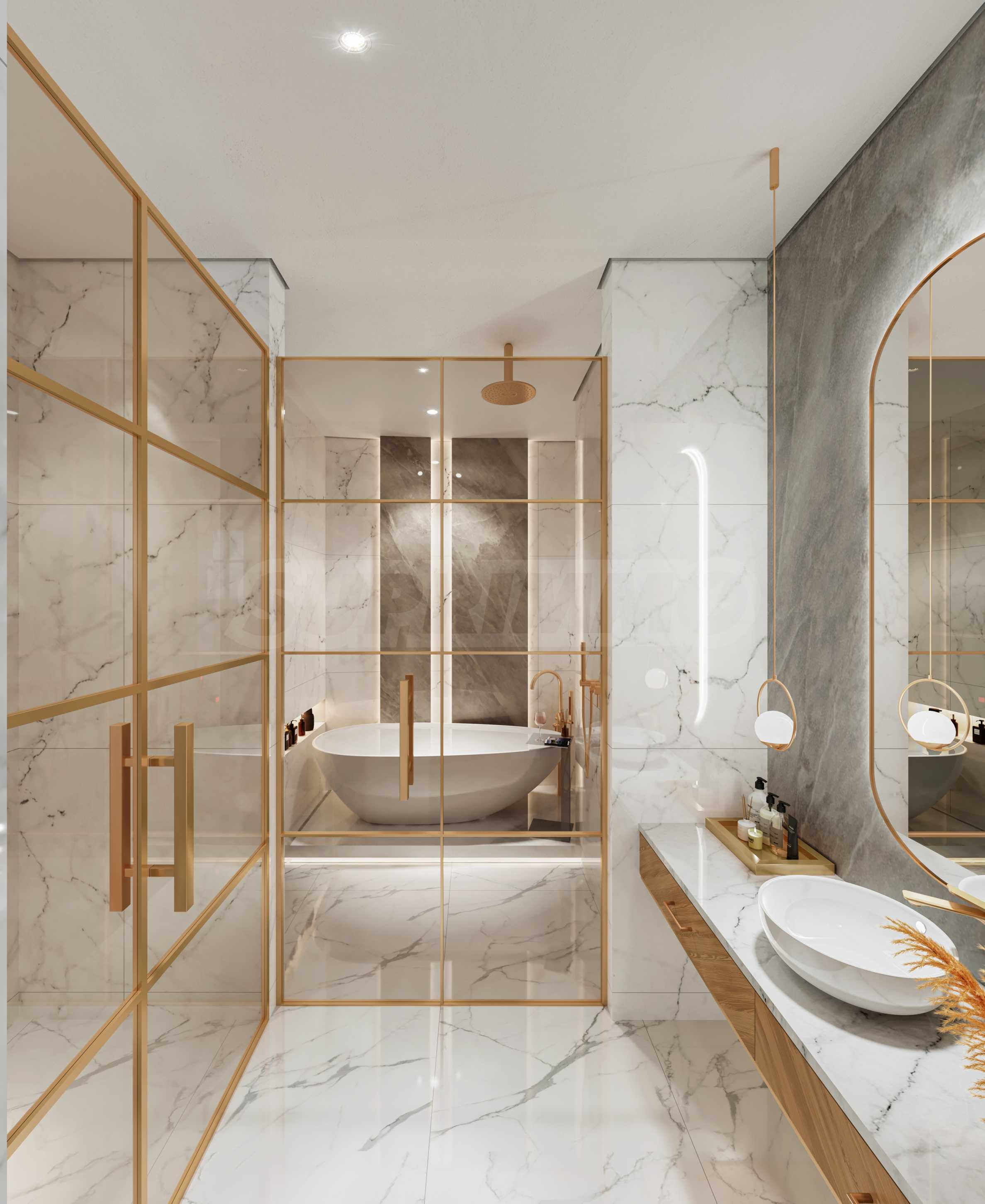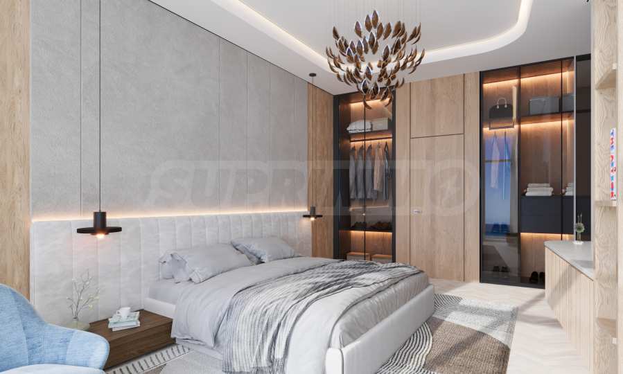 Спальни спроектированы как личные зоны для уединения и отдыха, с удобными кроватями и просторными помещениями. Высокие потолки и окна от пола до потолка наполняют комнаты естественным светом и подчеркивают ощущение простора. В каждой спальне есть встроенные шкафы и ванная комната, а главные спальни дополнены функциональными гардеробными с продуманными решениями для оптимальной организации пространства.