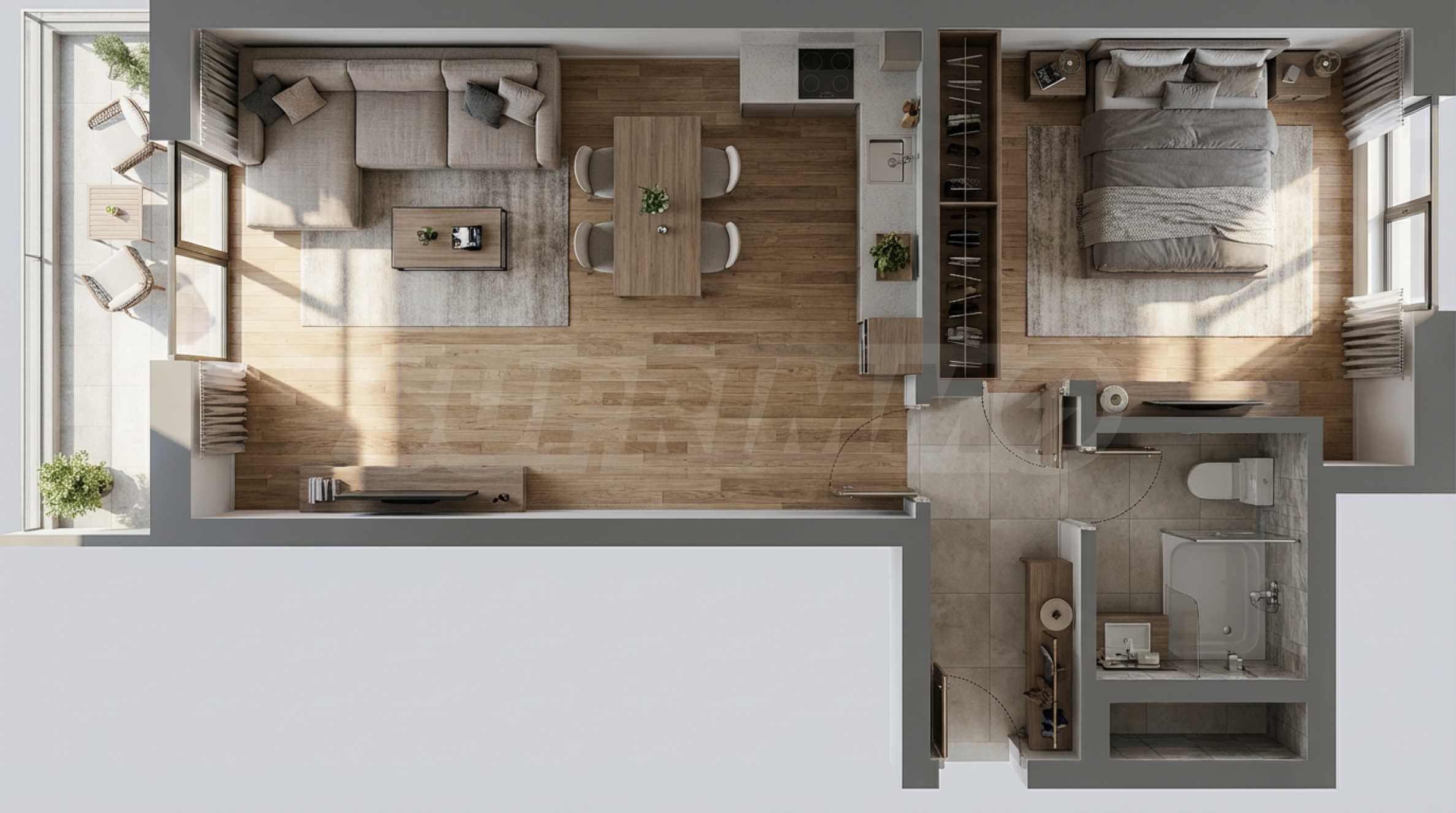 Представляем однокомнатную квартиру в новом жилом комплексе в районе Тракия. Отличное расположение вдали от шума, недалеко от парка Лаута и транспортных развязок, школы, детских площадок, ресторанов, магазинов, отеля, бассейнов, в 3,9 км от центра и в 13,5 км от аэропорта Пловдива.