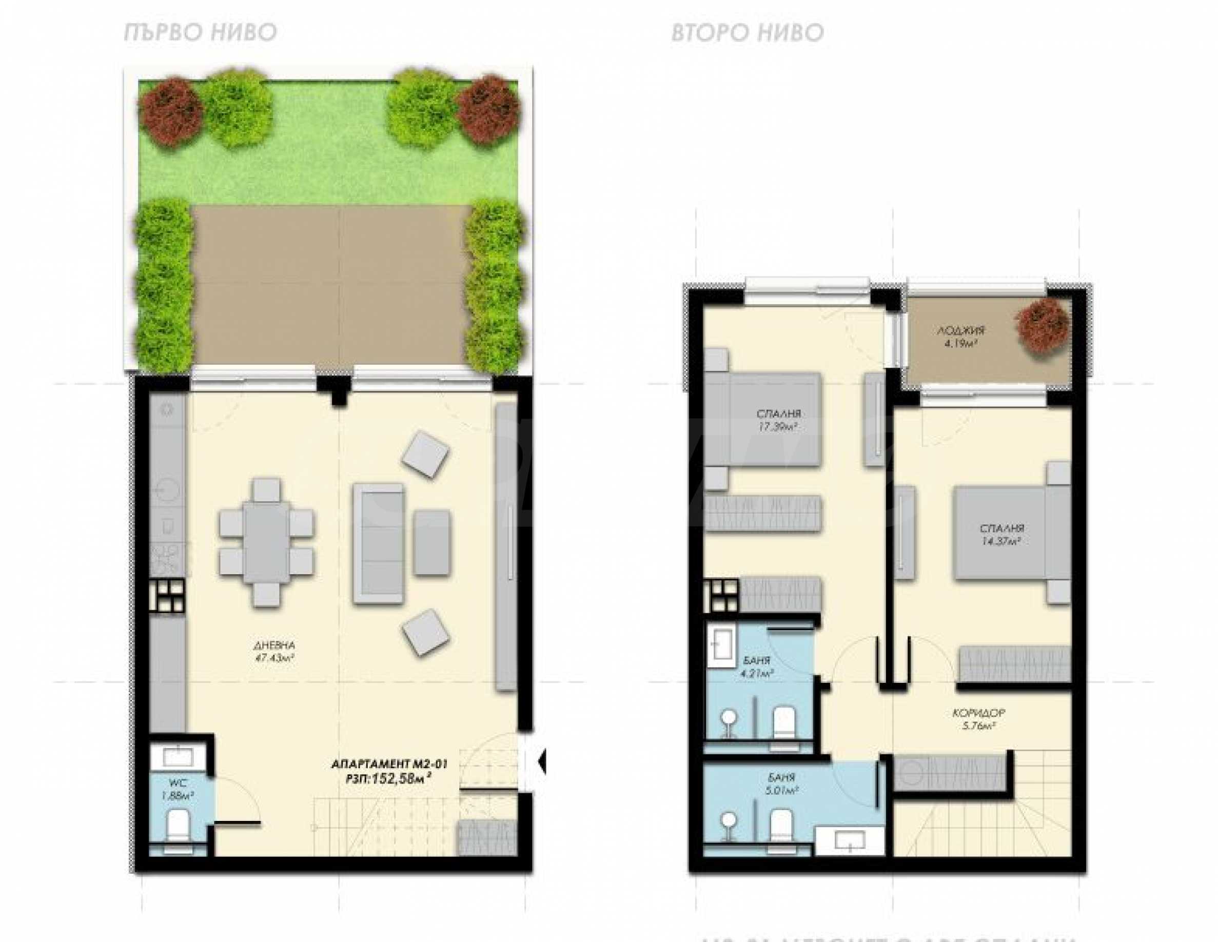 Мезонеты расположены на двух уровнях. Те, что на первом этаже, имеют собственный дворик – ровный, засаженный травой, с защитной растительностью высотой 1,50–1,80 м и высаженными деревьями. Мезонеты на верхних этажах имеют просторные террасы с настилом из композитной древесины Artefino. Все планировки предусматривают просторную гостиную на первом уровне и спальни на втором.