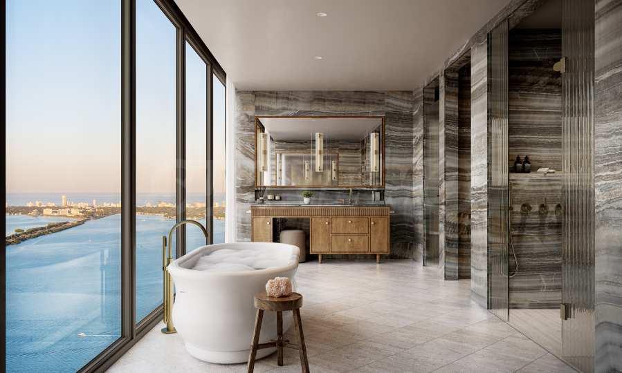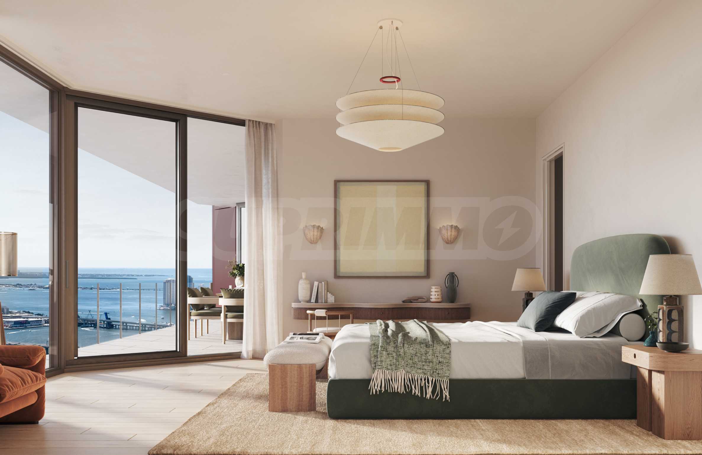 Мы решили представить вам впечатляющую квартиру под названием Villa Mezzo, которая занимает половину этажа здания и поражает своей площадью в 312,80 кв. м. Резиденция имеет высокие потолки и окружена окнами от пола до потолка, из которых открывается невероятный вид на залив Бискейн. Благодаря продуманному дизайну и смешанному освещению, солнечный свет проникает в помещение в любое время суток. Планировка квартиры включает в себя просторную гостиную с кухней и столовой, три спальни с ванными комнатами, дополнительную комнату, которую вы можете обставить и оборудовать по своему вкусу, два балкона и гостевой туалет.