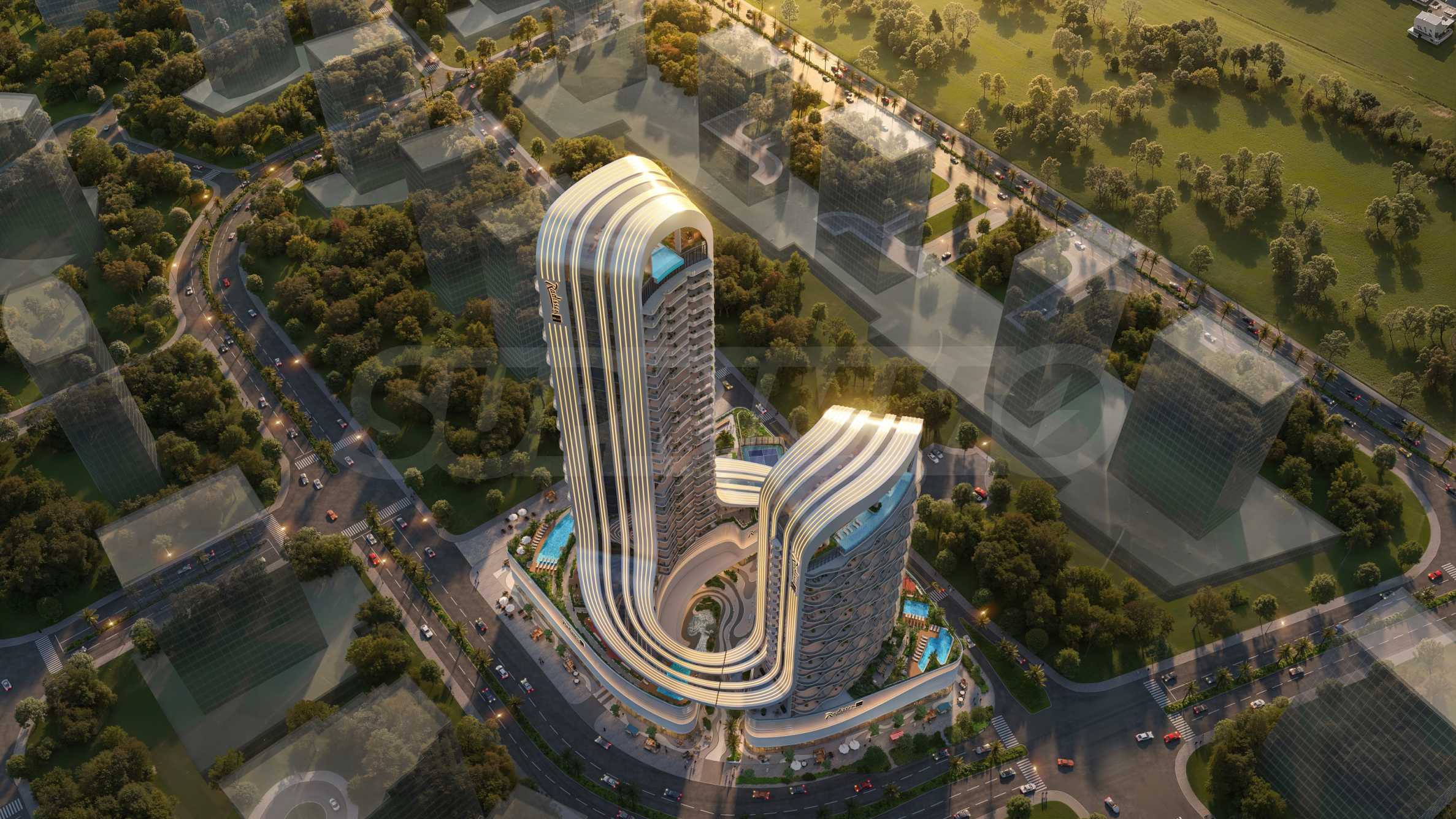 Архитектурная концепция включает в себя две башни разной высоты, объединенные элегантным подиумом. Фасад отличается плавными линиями и динамичными объемами, что придает ему современный и запоминающийся вид.