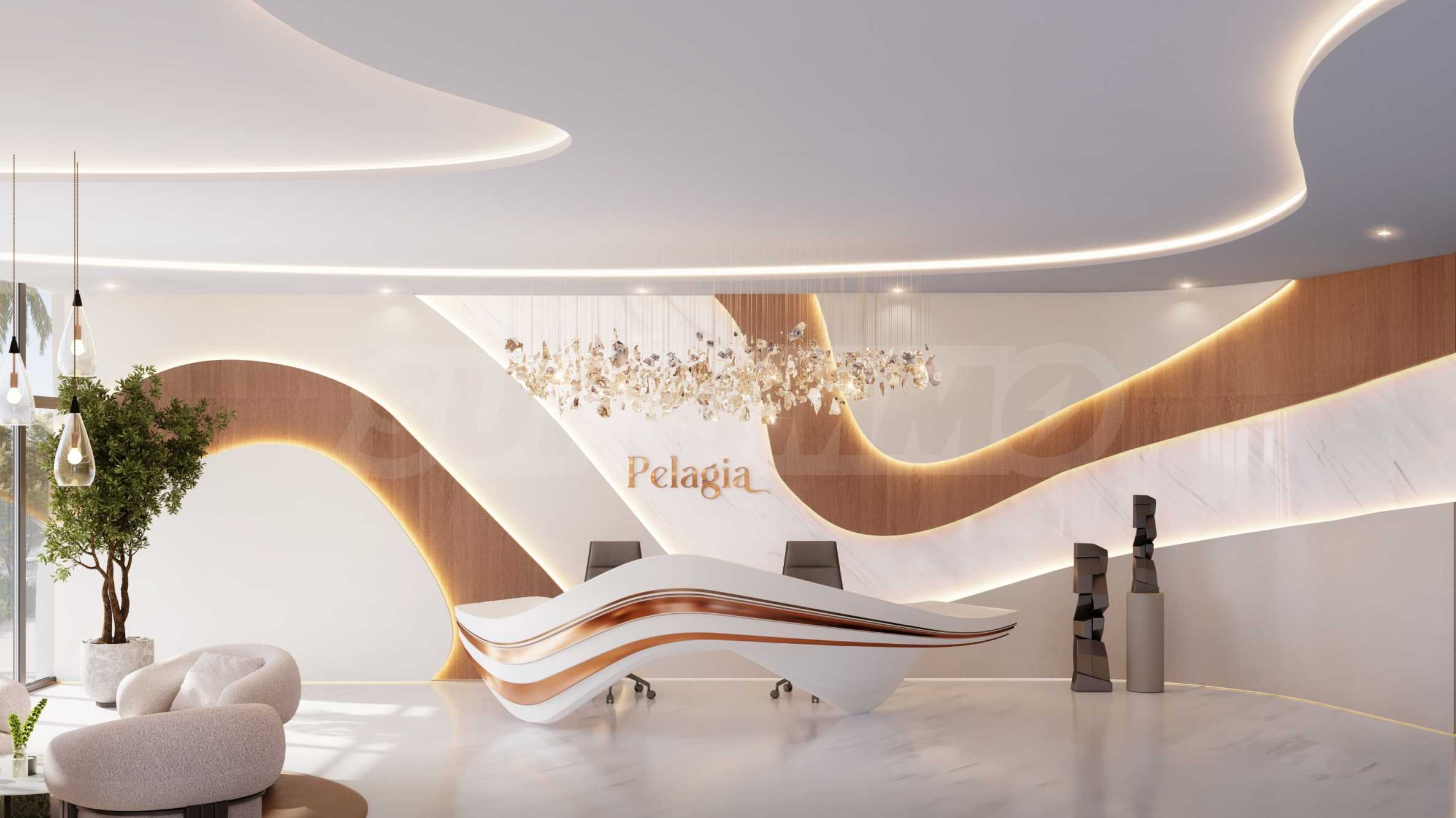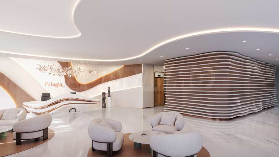 Пятнадцатиэтажное здание Pelagia отличается современной архитектурой, в которой доминируют изогнутые линии и ощущение простора, усиленное фасадом из стекла и алюминия. С любой точки зрения – сбоку или сверху – здание впечатляет изысканным набором удобств и обилием зелени вокруг.