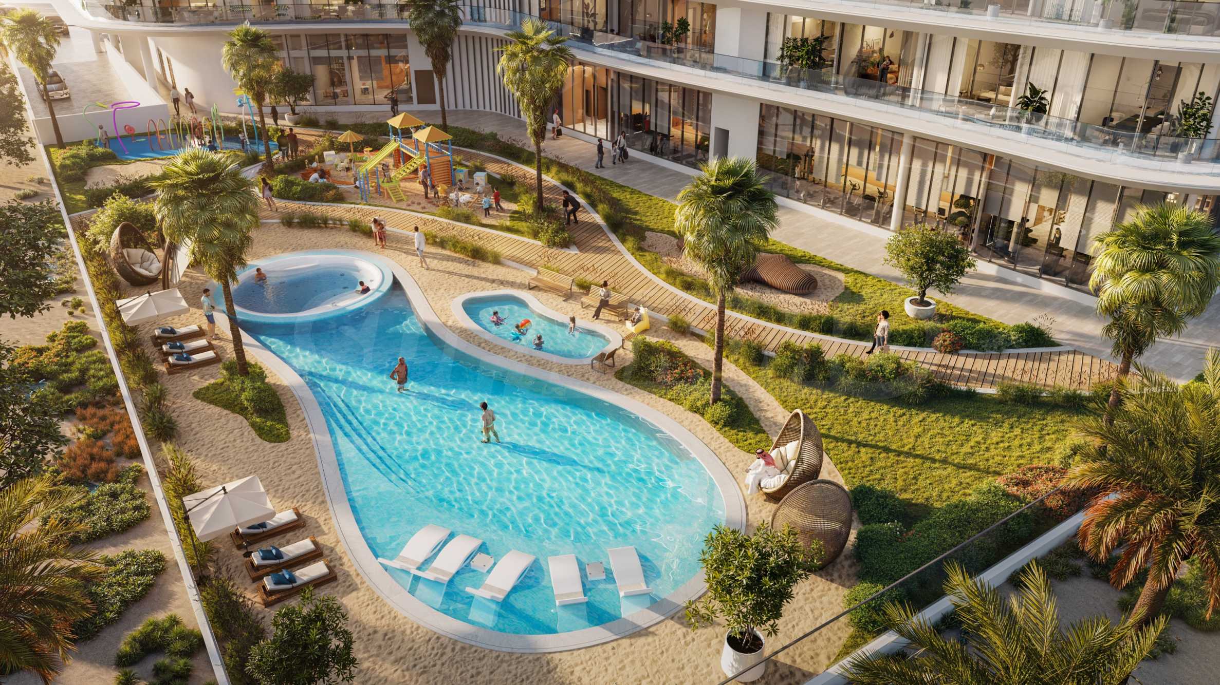 Жители могут наслаждаться пейзажным бассейном с просторными зонами отдыха и баром у бассейна, что дополняет ощущение покоя и комфорта. Для самых маленьких есть детский бассейн с мелководьем, игровая площадка и игровая комната, подходящие для развлечений как в помещении, так и на открытом воздухе.