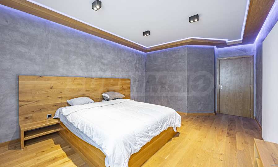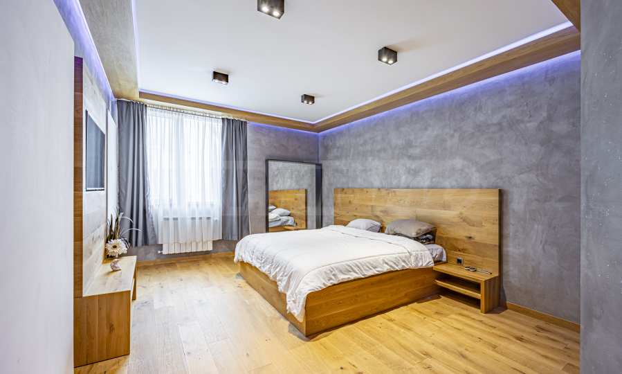 Квартира отделана и обставлена с вниманием к деталям, в натуральных тонах и материалах, создавая ощущение уюта и спокойствия. В гостиной и спальне паркет из натурального дуба, а меблировку в спальне, включая кровать, изготовлена из массива дуба — сочетание качества, долговечности и стиля.
