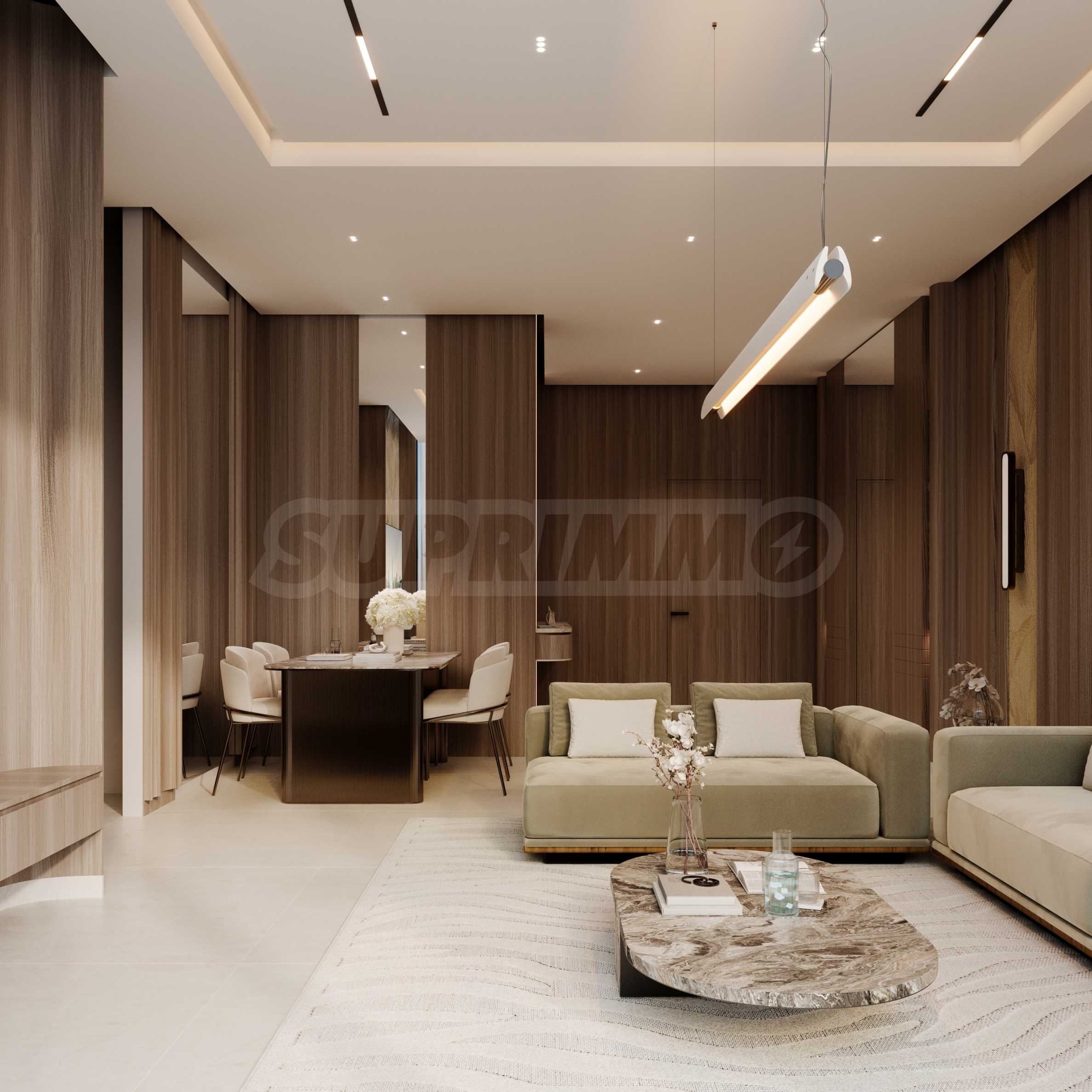 Студия расположена на третьем этаже здания и имеет общую площадь 31,24 м2. Планировка тщательно продумана для обеспечения максимального комфорта будущим жильцам, а окна от пола до потолка создают ощущение простора и воздушности. Студия оборудована готовой кухней и ванной комнатой, а концепция интерьера основана на изысканном сочетании высококачественных материалов — различных видов мрамора, металлических акцентов, столешниц из натурального камня, текстильных обоев, а также бронзовых и зеркальных деталей, которые создают ощущение элегантности и вневременного стиля.