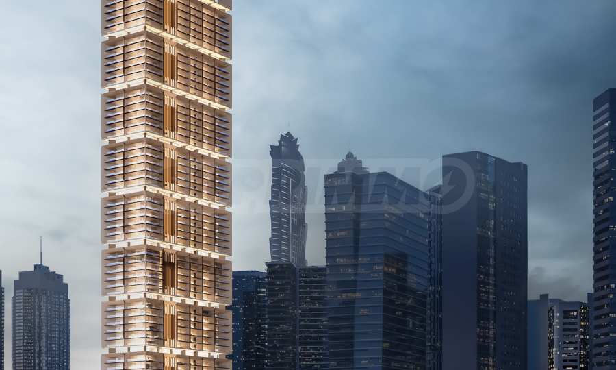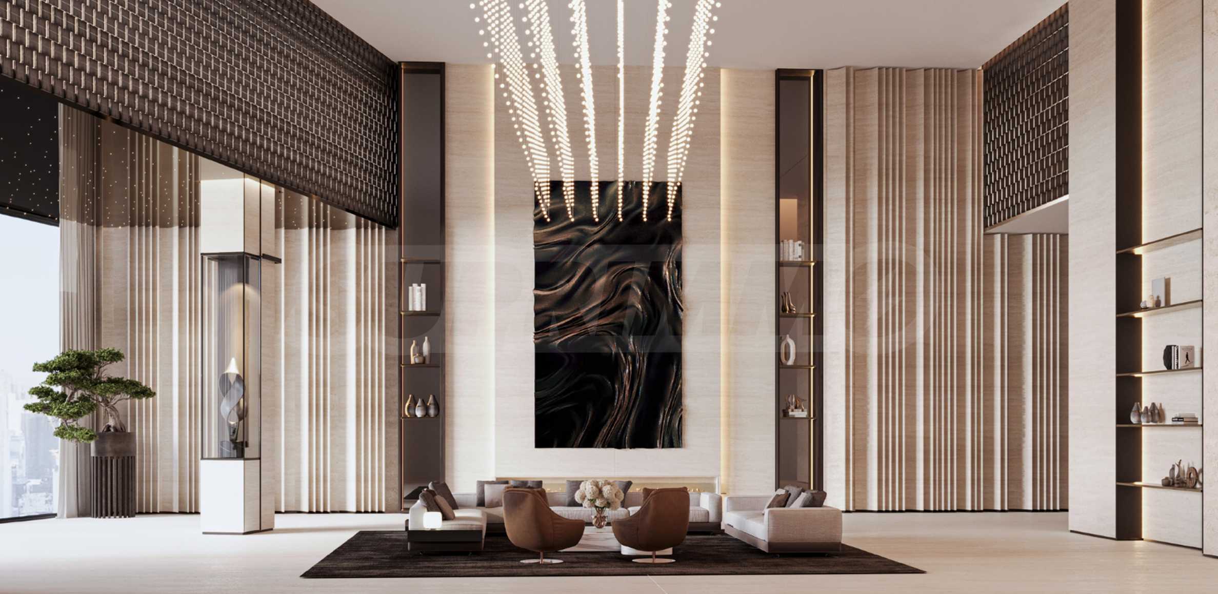 Комплекс One by Binghatti возвышается на впечатляющие 67 этажей, становясь ярким акцентом в городском пейзаже не только своей высотой, но и художественной подсветкой фасада, которая элегантно подчеркивает декоративные линии и архитектурную индивидуальность здания. При входе жильцов и их гостей встречает впечатляющий холл с зоной приема, отличающийся внушительной высотой, простором и ощущением представительности. Внутренние решения в общих зонах подобраны с вниманием к деталям, сочетая мрамор, натуральное дерево, травертин и изысканные акценты из бронзы и стекла, создавая атмосферу современной роскоши.