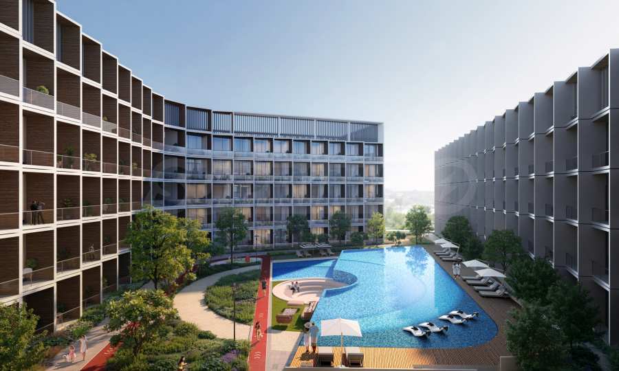 Внутренний двор здания спроектирован как настоящий оазис для отдыха и восстановления сил. Здесь вы найдете взрослый бассейн и детский бассейн с впечатляющими водными аттракциями и отдельными зонами отдыха, где солнце и вода создают атмосферу курорта. Также имеются беговые дорожки, места для йоги и медитации, а также красиво благоустроенные уголки для тишины и восстановления сил. Для самых маленьких предусмотрена современная игровая площадка, обеспечивающая безопасную и вдохновляющую среду для игр и общения.
