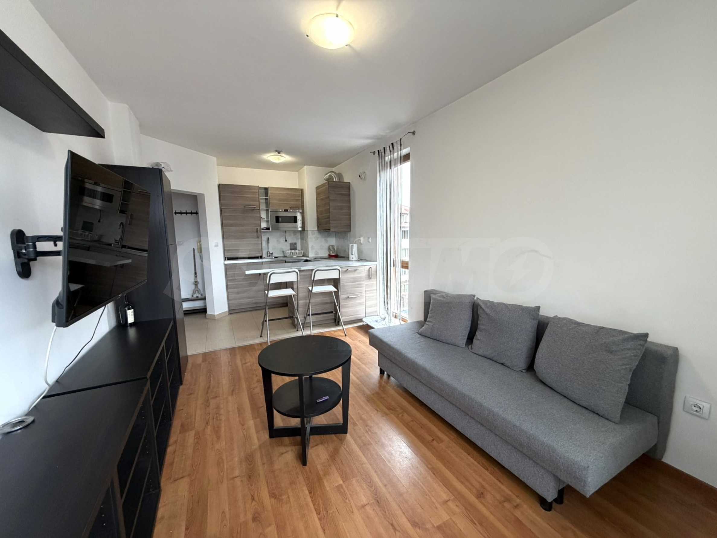 • Гостиная: диван (расположен напротив зоны с телевизором), журнальный столик, тумба под телевизор + телевизор;