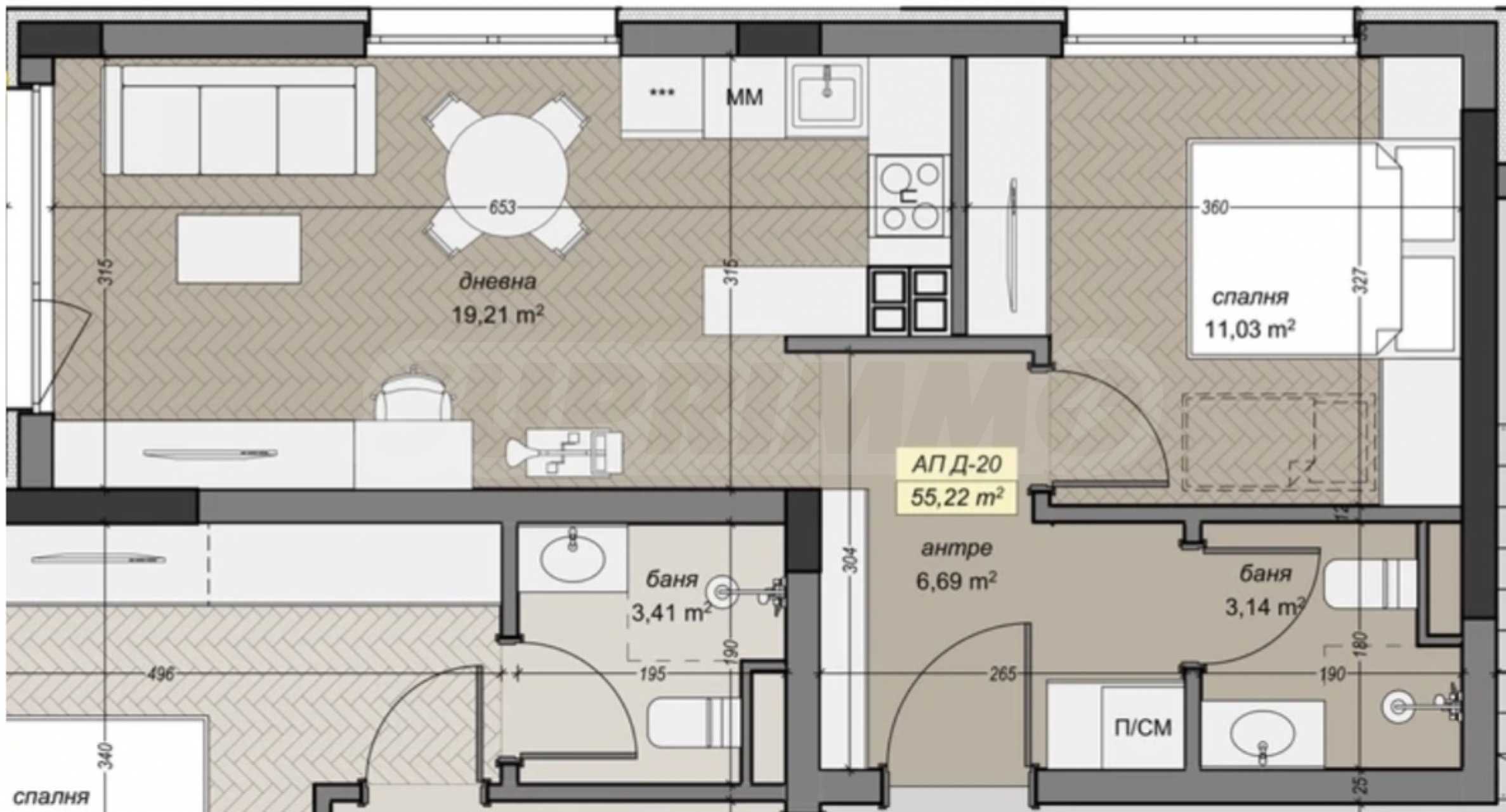 Площадь квартиры составляет 55,22 кв. метров. (полезная площадь) и 63,5 кв. метров. (площадь общих зон). Французские окна обеспечивают обилие естественного света, создавая ощущение простора, света и уюта в комнатах. Квартира состоит из прихожей, гостиной с кухонным уголком и просторной спальни.