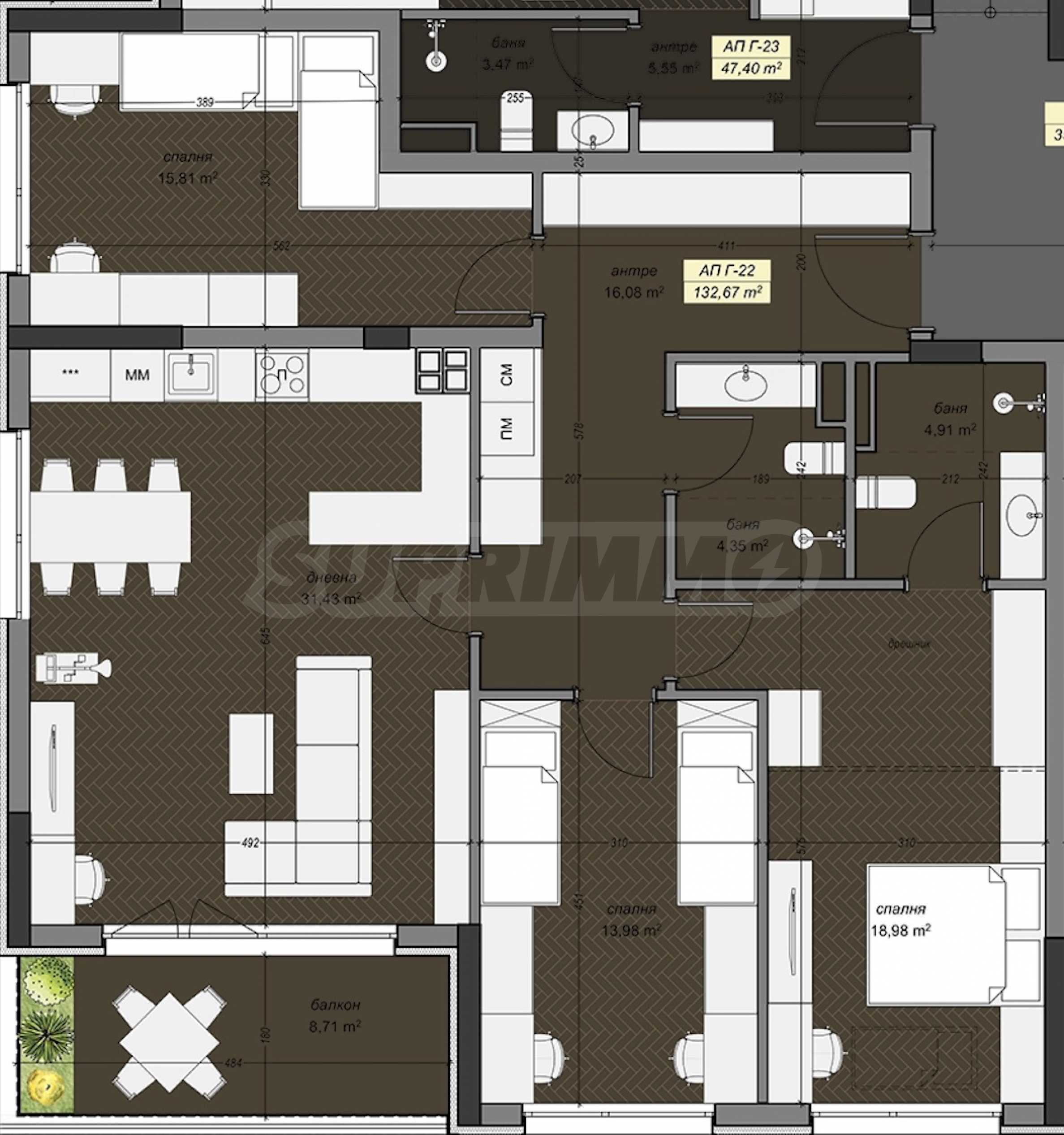 Площадь квартиры составляет 132,67 м2. (полезная площадь) и 147,45 м2. (общая площадь). Французские окна обеспечивают обилие естественного света, создавая ощущение простора, света и комфорта в комнатах.