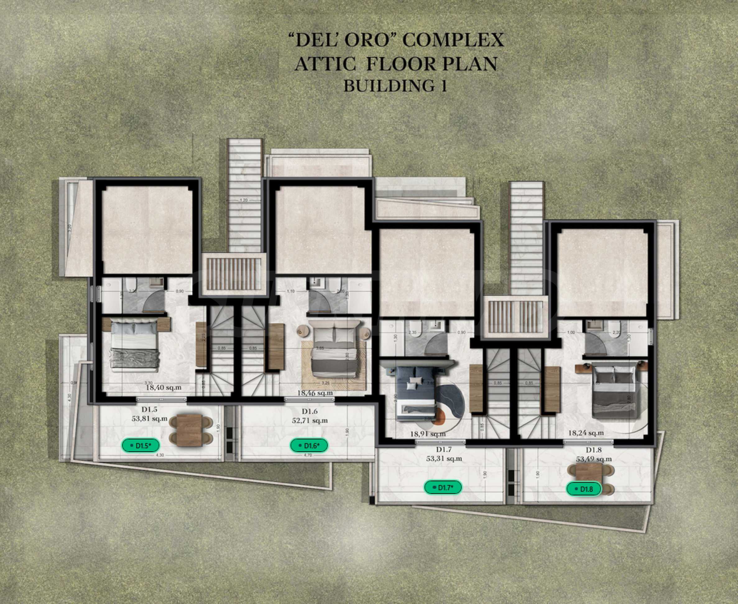 Предлагаются трехкомнатные апартаменты площадью от 51,31 до 81,87 кв. м, отличающиеся функциональной планировкой и оптимальным использованием пространства. Апартаменты спроектированы таким образом, чтобы обеспечить свет, комфорт и ощущение уюта как для отдыха, так и для длительного проживания. Все апартаменты продаются «под ключ», с меблированными кухнями и оборудованными ванными комнатами.