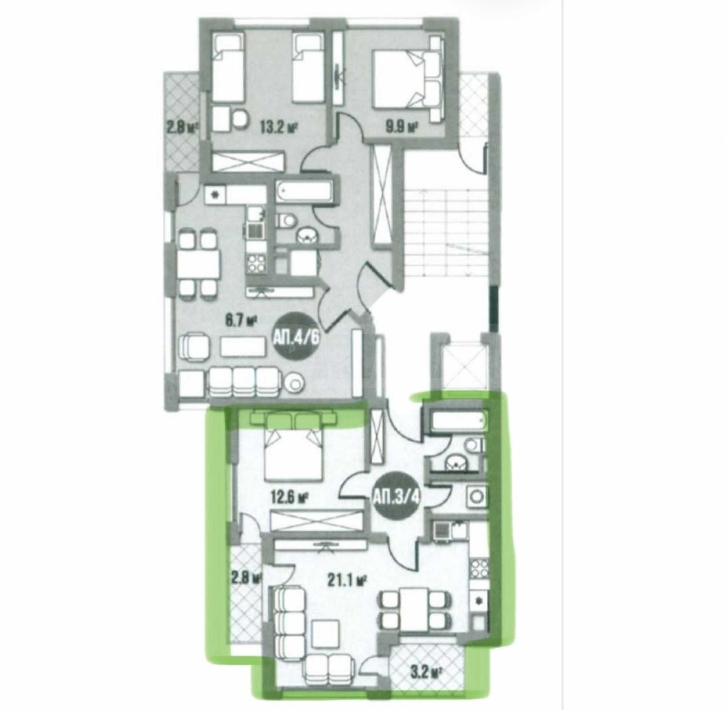 Квартира расположена на четвертом этаже, выходит на юго-запад и имеет общую площадь 78,11 кв. м (59,11 кв. м застроенной площади). Квартира имеет панорамный вид, залита солнцем и обладает отличной функциональностью, подходит как для личного пользования, так и для инвестиций.
