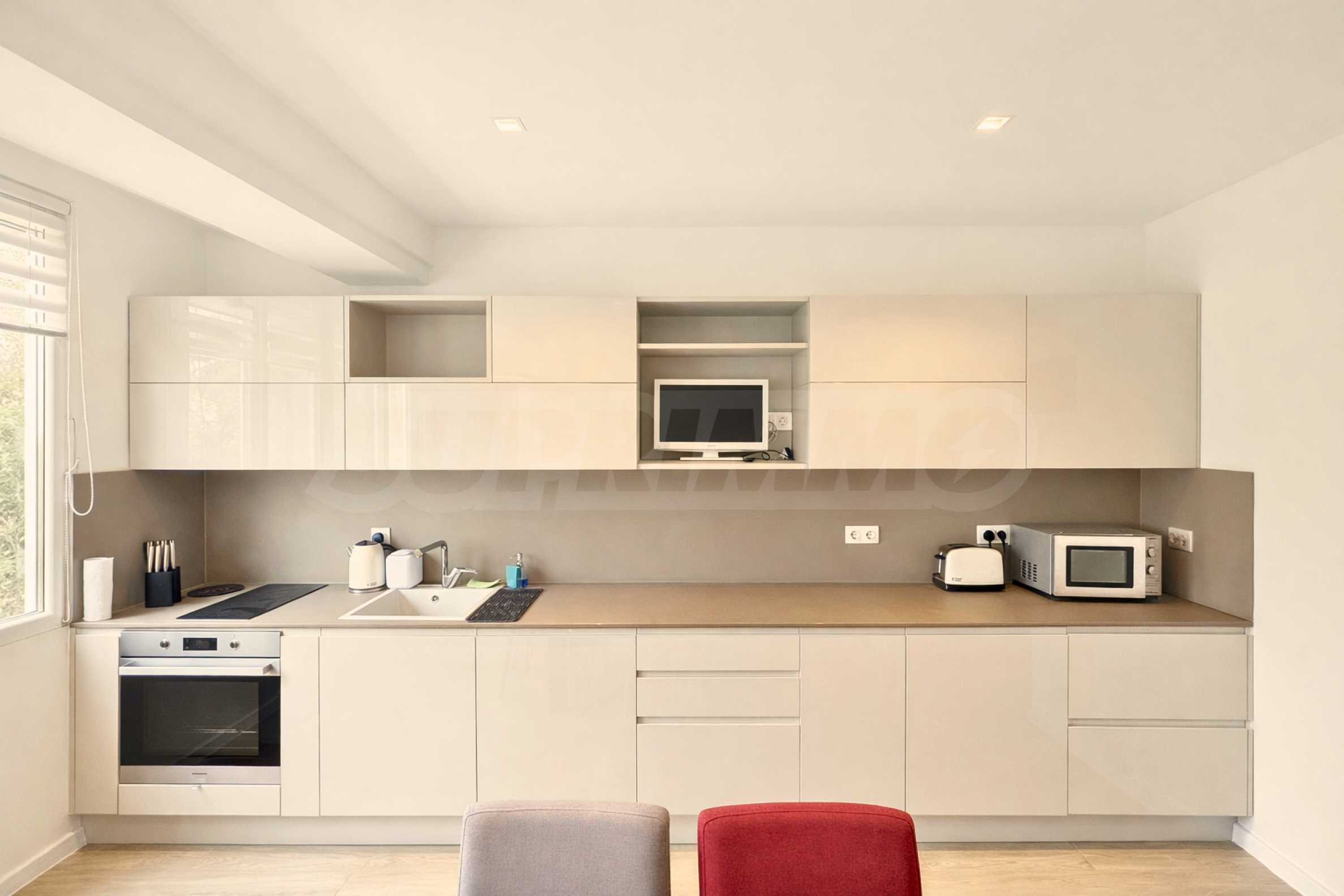 Интерьер оформлен в чистом, современном стиле с использованием теплых тонов и качественных материалов. Просторная и уютная гостиная с удобной мягкой мебелью и выходом на террасу с видом на зелень. Кухня полностью оборудована итальянской мебелью и бытовой техникой, имеет удобную рабочую зону и обеденную зону.