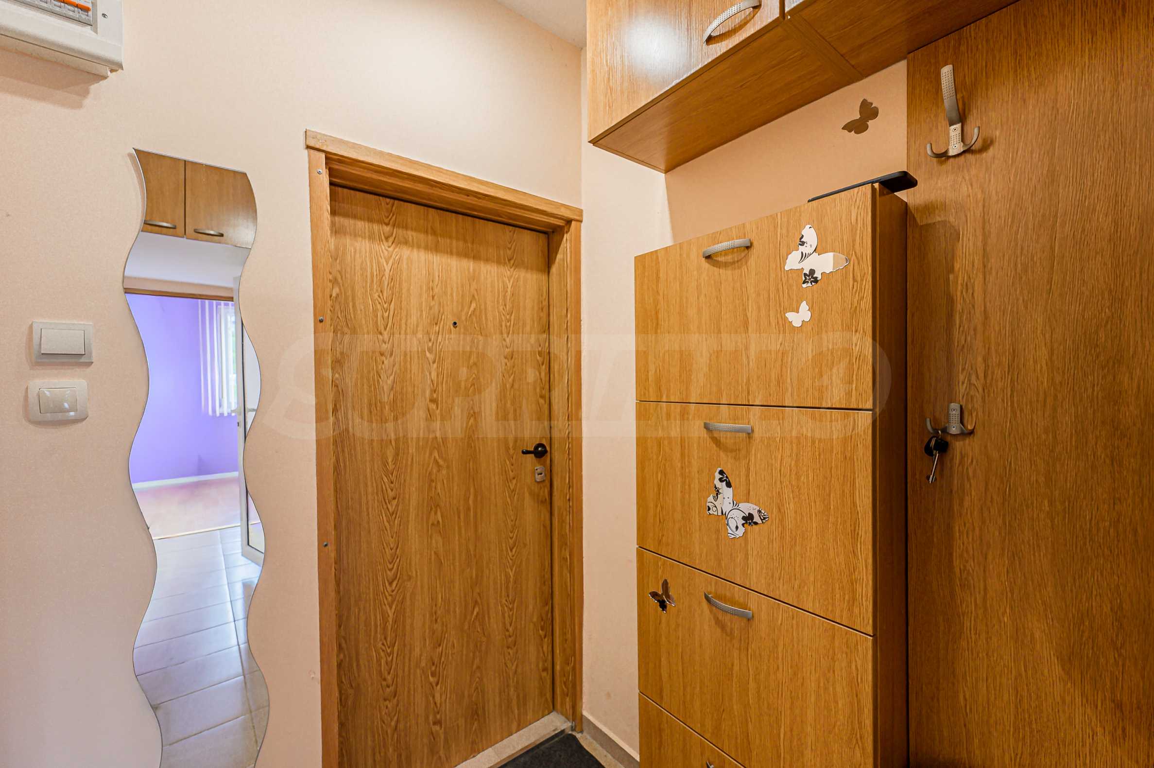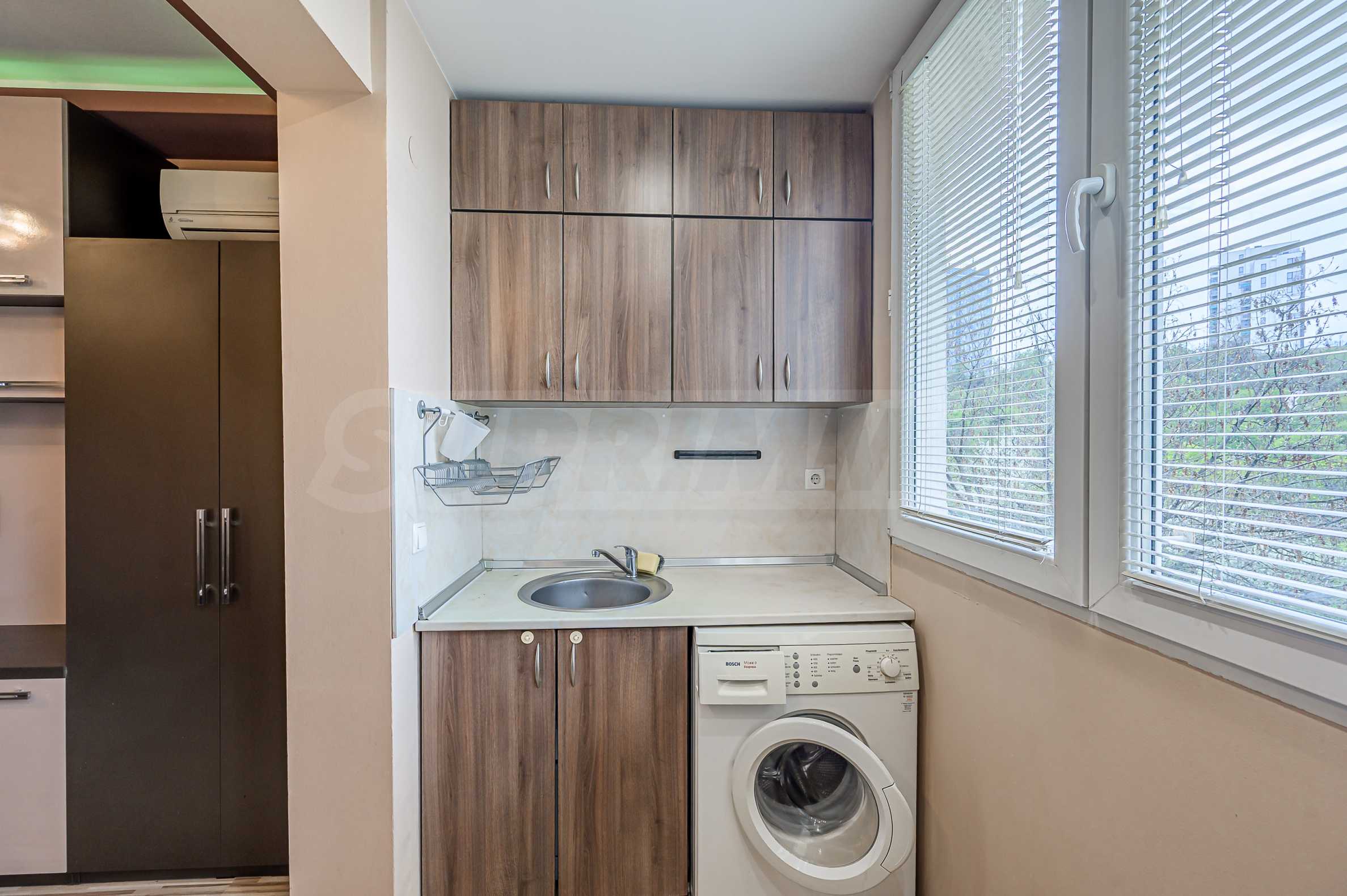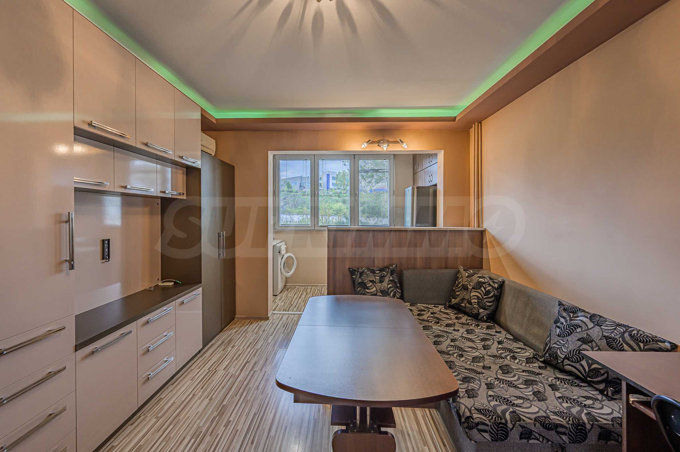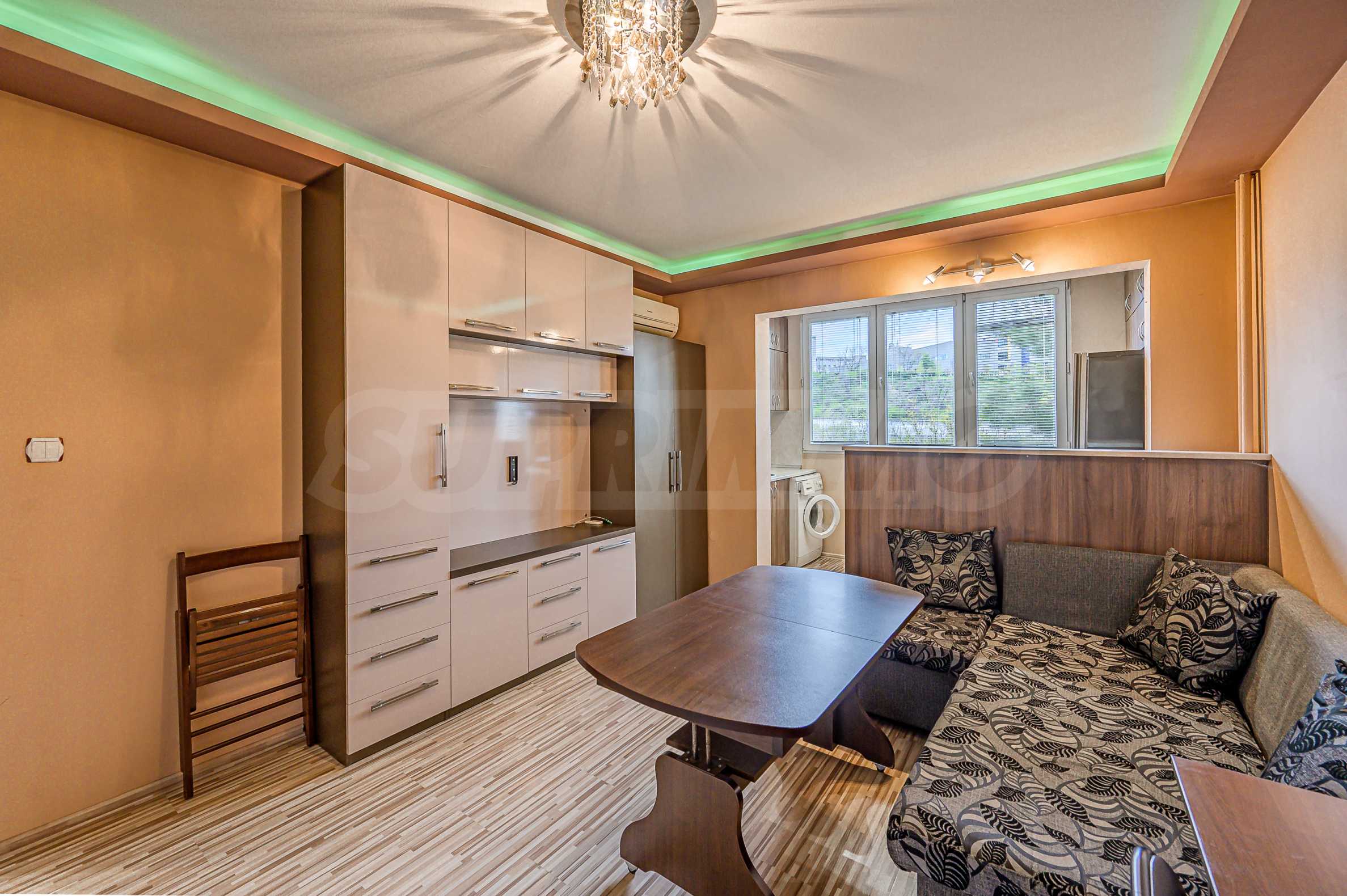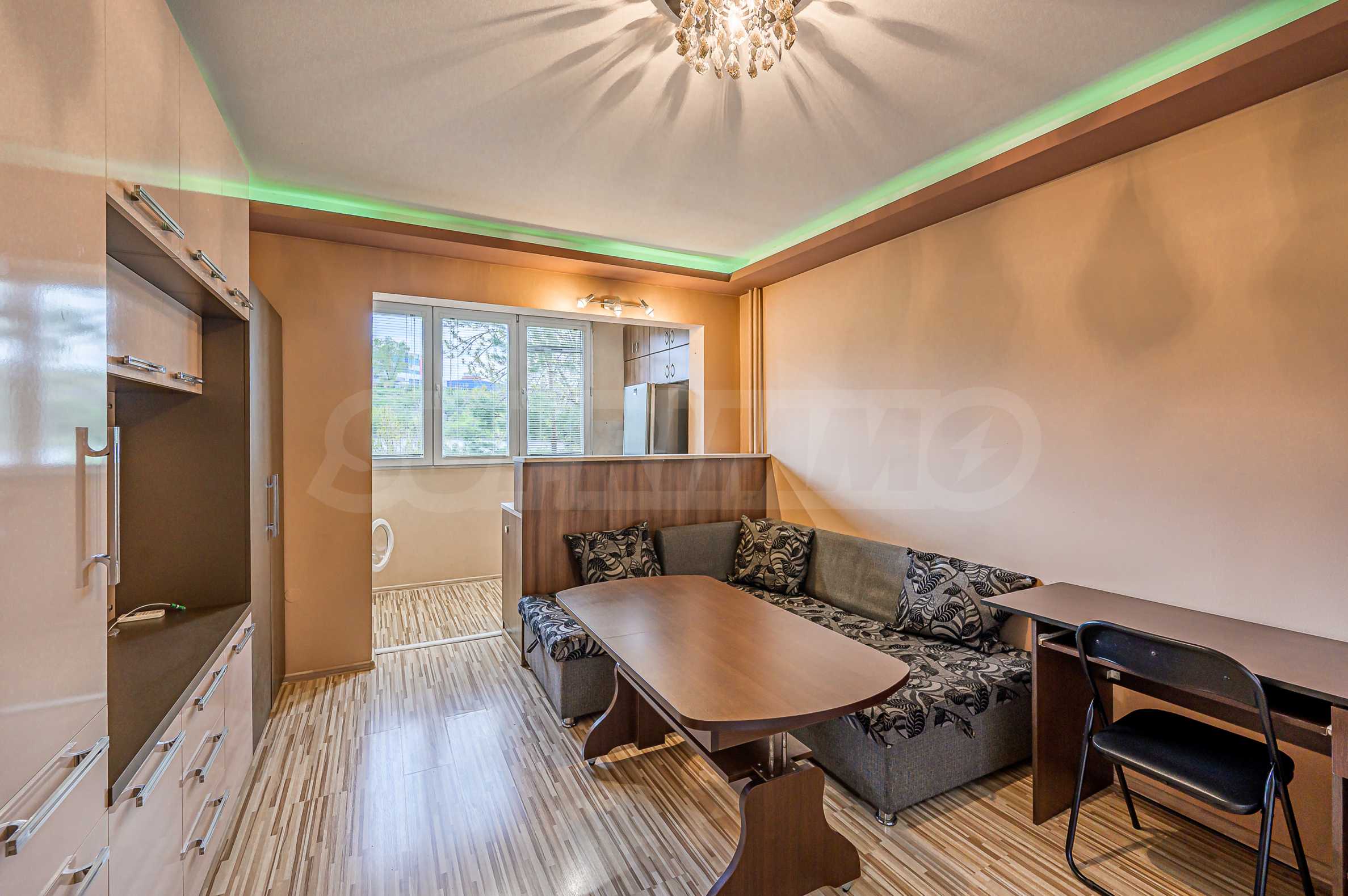 Планировка включает прихожую, гостиную с мини-кухней и столовую, в которой расположена дополнительная спальная зона, главную спальню и ванную комнату с туалетом. Квартира полностью меблирована и оборудована всем необходимым для проживания: кондиционером, холодильником, плитой, стиральной машиной, небольшой посудомоечной машиной и телевизором в спальне.