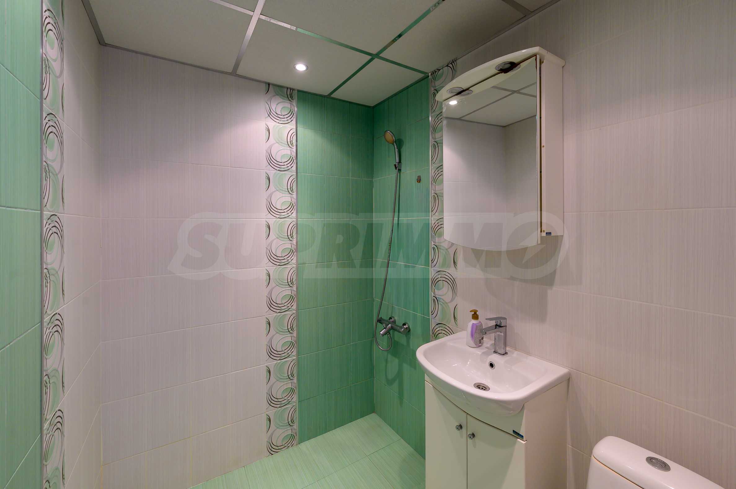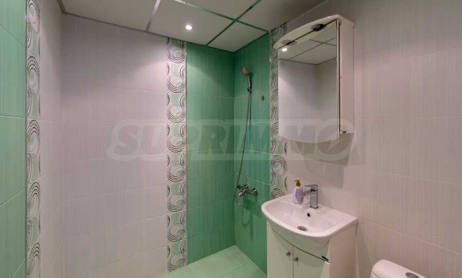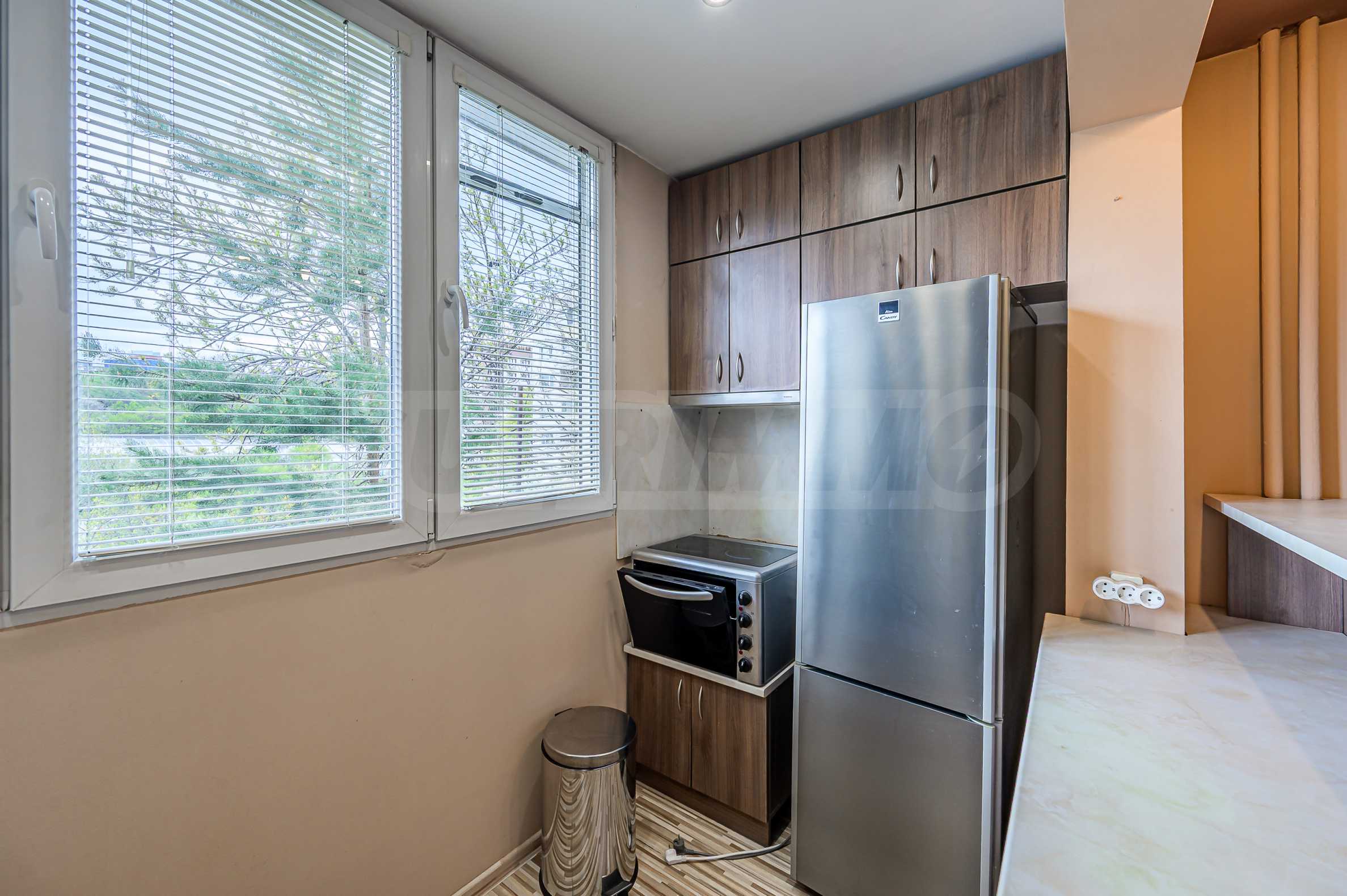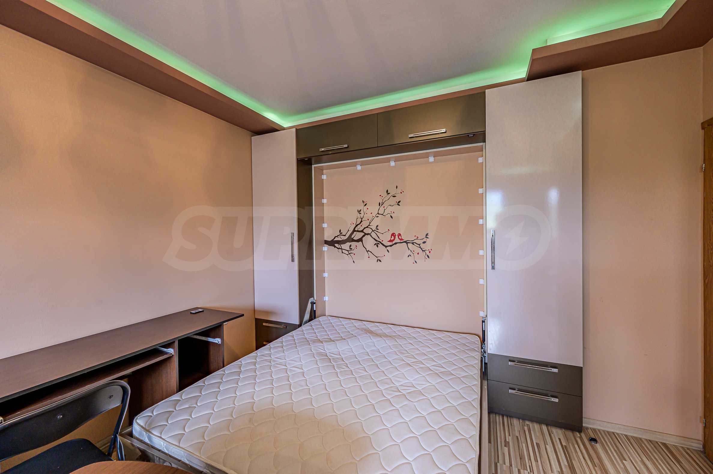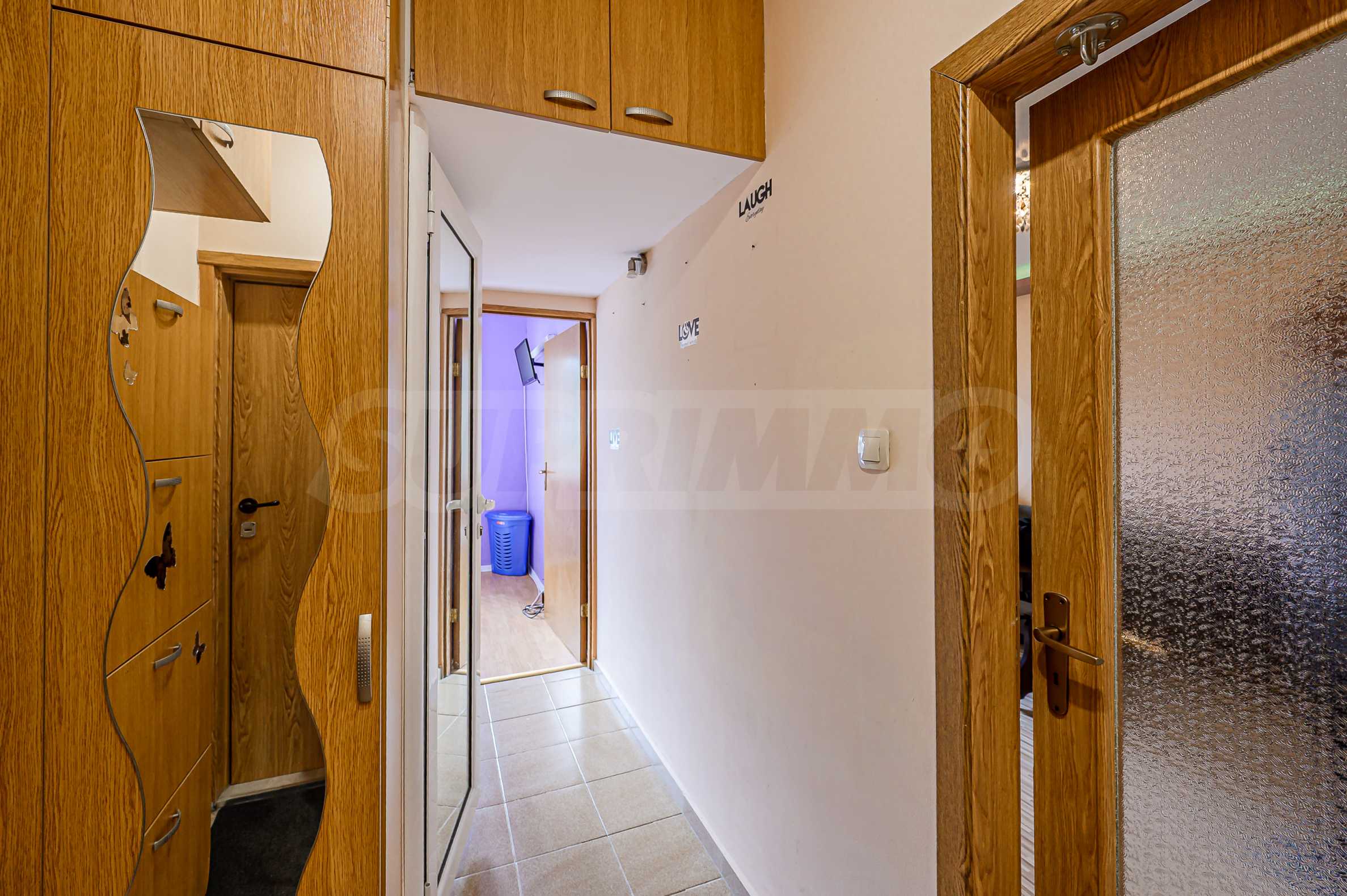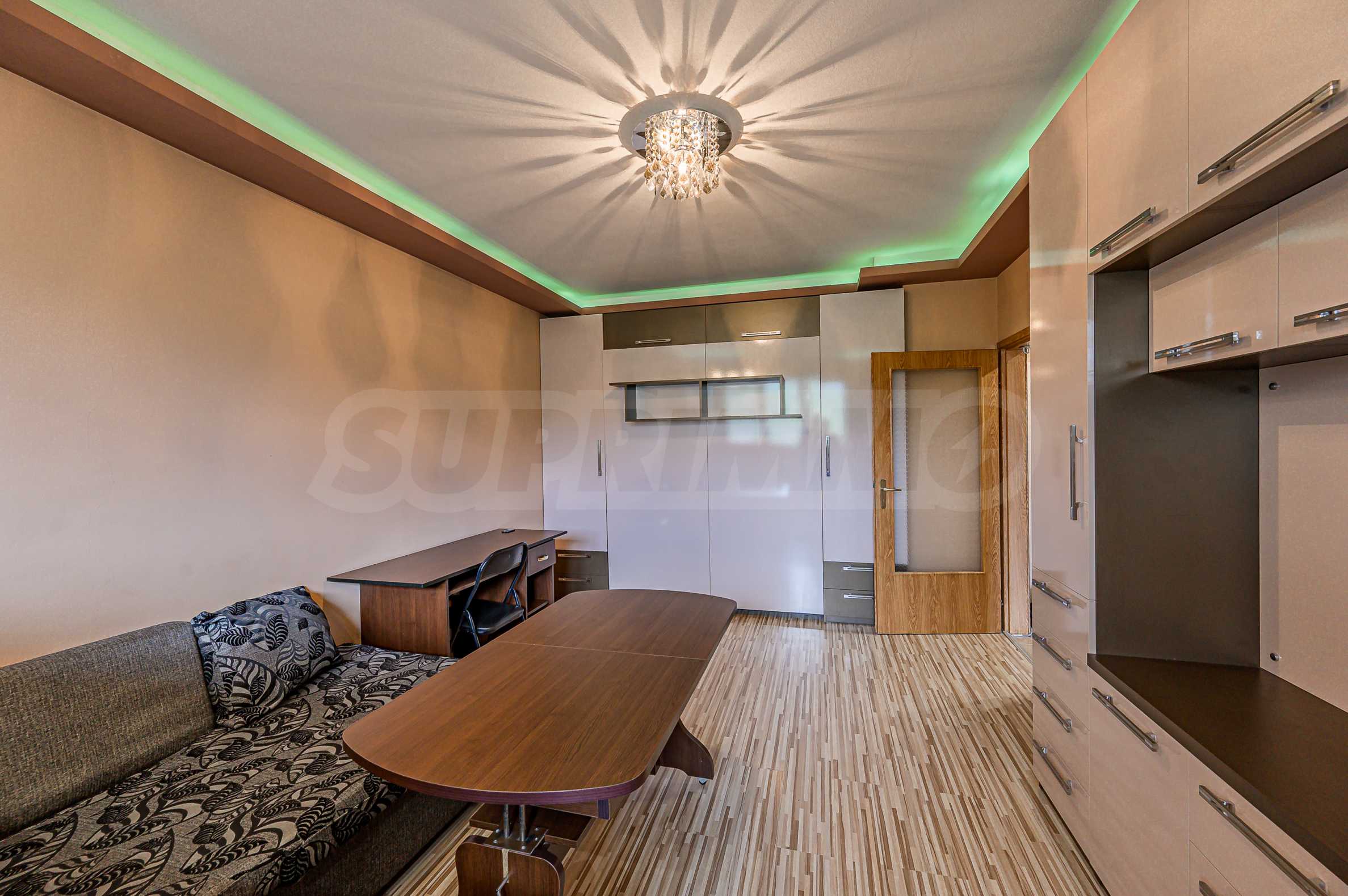 Планировка включает прихожую, гостиную с мини-кухней и столовую, в которой расположена дополнительная спальная зона, главную спальню и ванную комнату с туалетом. Квартира полностью меблирована и оборудована всем необходимым для проживания: кондиционером, холодильником, плитой, стиральной машиной, небольшой посудомоечной машиной и телевизором в спальне.