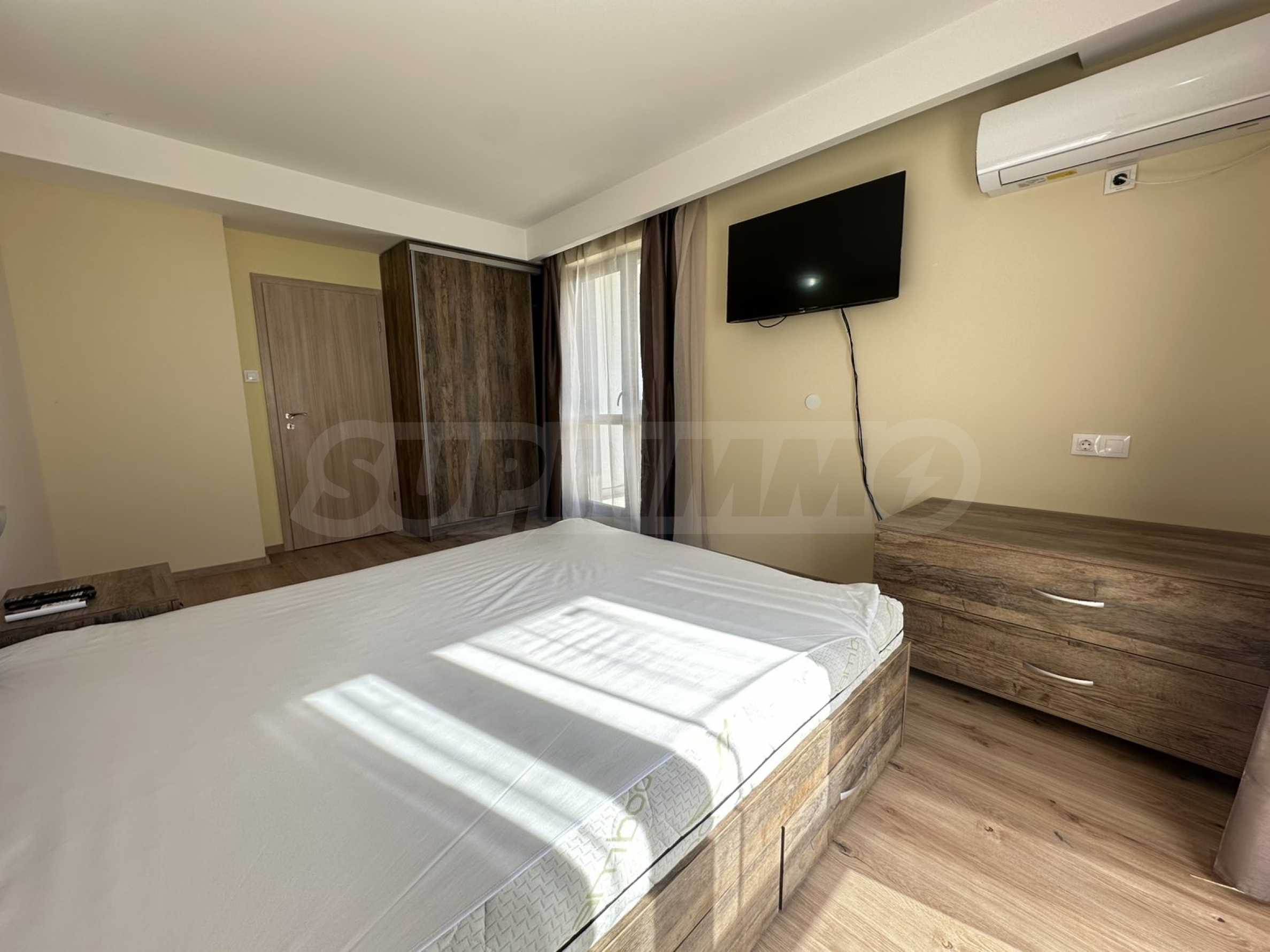 • Большая спальня, соединенная с гостиной, со шкафом для одежды, телевизором, балконом, выходящим на юг и имеющим собственный балкон;
