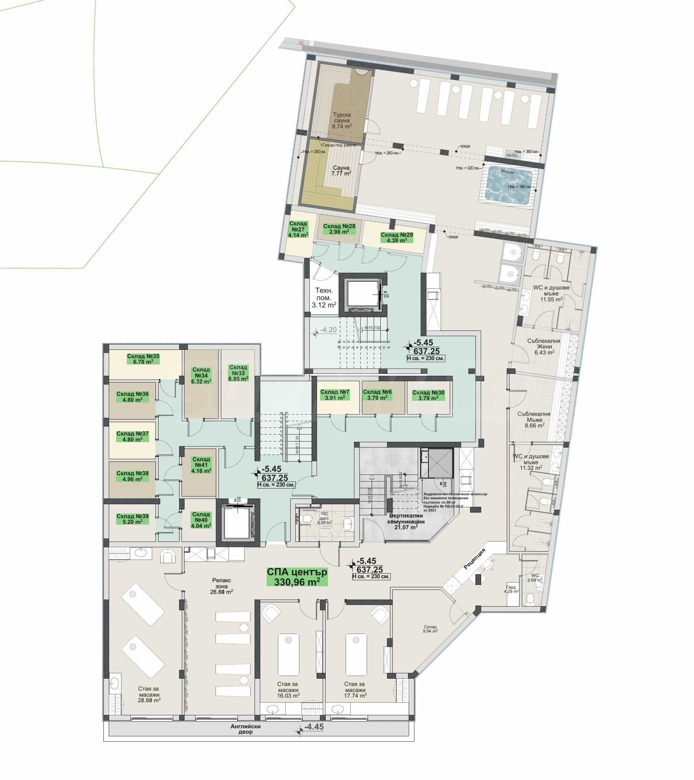 Прекрасно организованный СПА-центр площадью 330,96 кв. м расположен на уровне "-2" и имеет четко разделенные зоны для водных процедур, отдыха, лечебных кабинетов и служебных помещений.