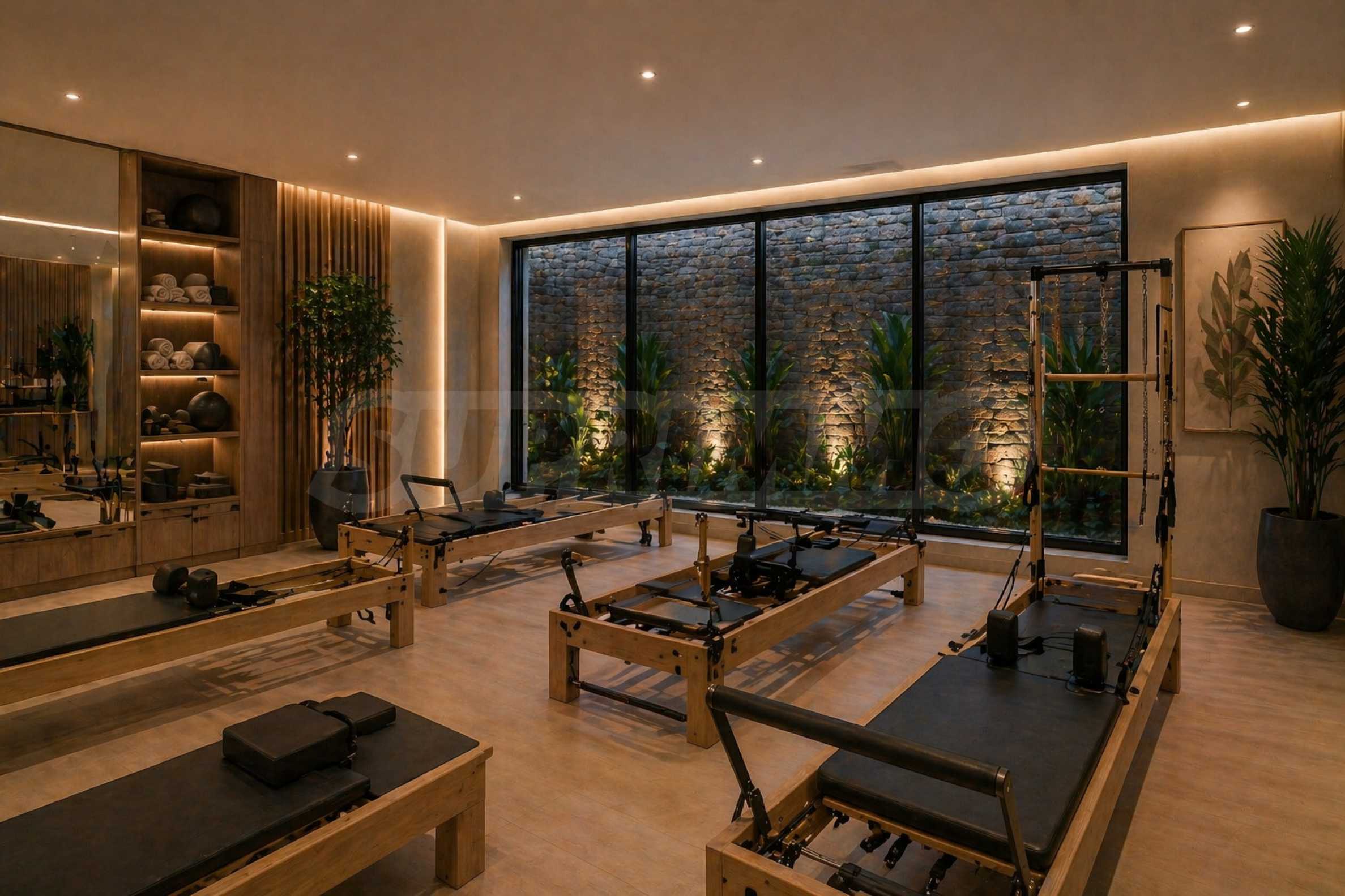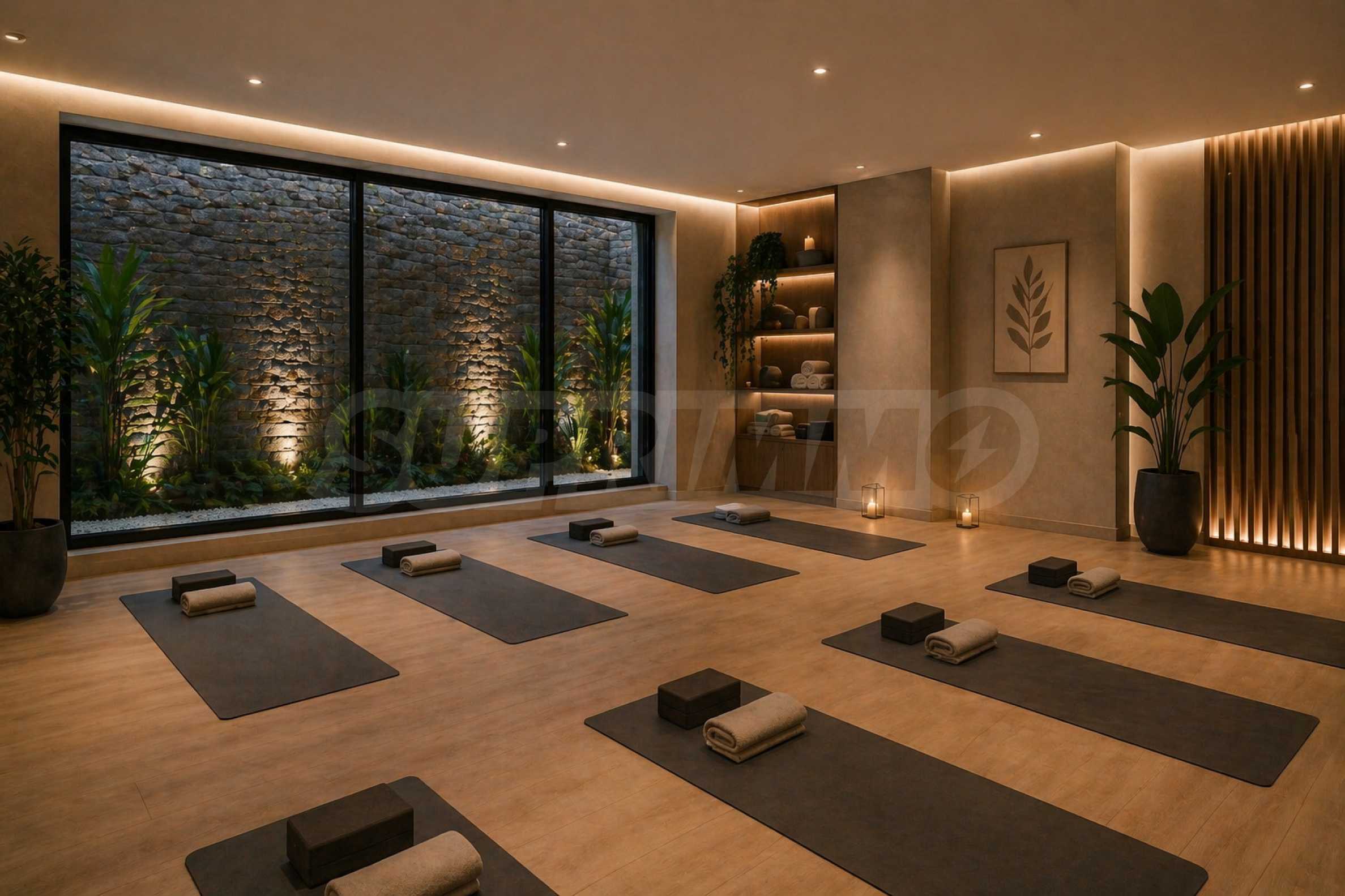 • Отдельный зал для йоги площадью 38,21 кв. м, подходящий для групповых занятий, растяжки, пилатеса и индивидуальных тренировок;