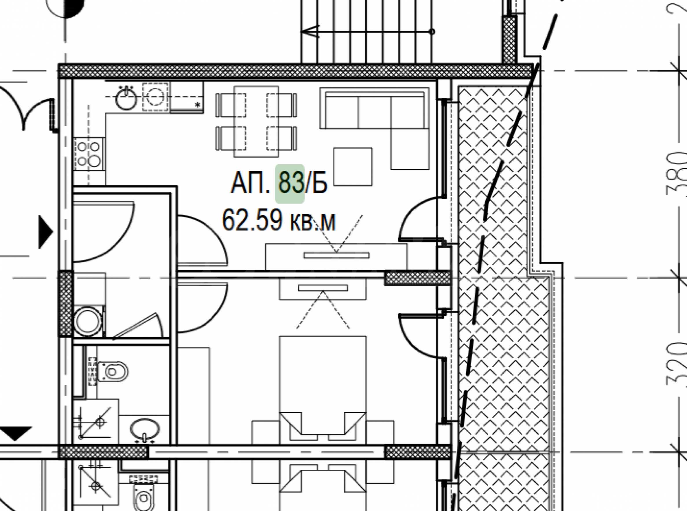 Квартира расположена на 2-м этаже и имеет западную ориентацию. Общая площадь квартиры составляет 72,32 м2, полезная площадь – 62,59 м2, на которой расположены: прихожая, ванная комната/туалет, гостиная с кухней, одна спальня и терраса с выходом из обеих комнат. Квартира сдается в аренду в состоянии готовности по стандартам BDS, с пятикамерной ПВХ-панелью Rehau, тройным остеклением и бронированной входной дверью.